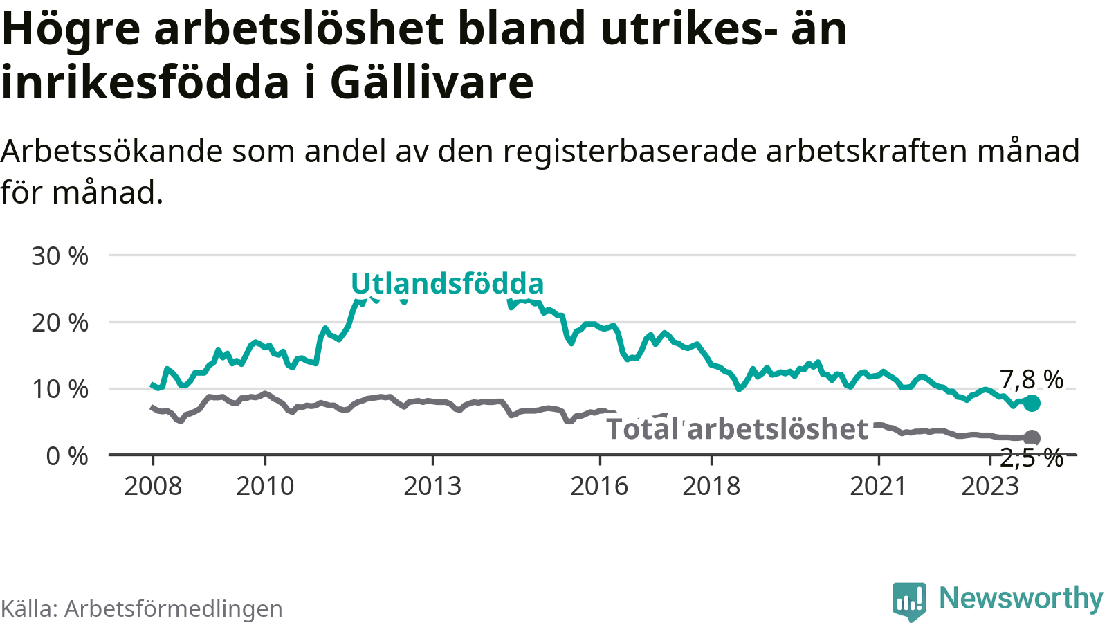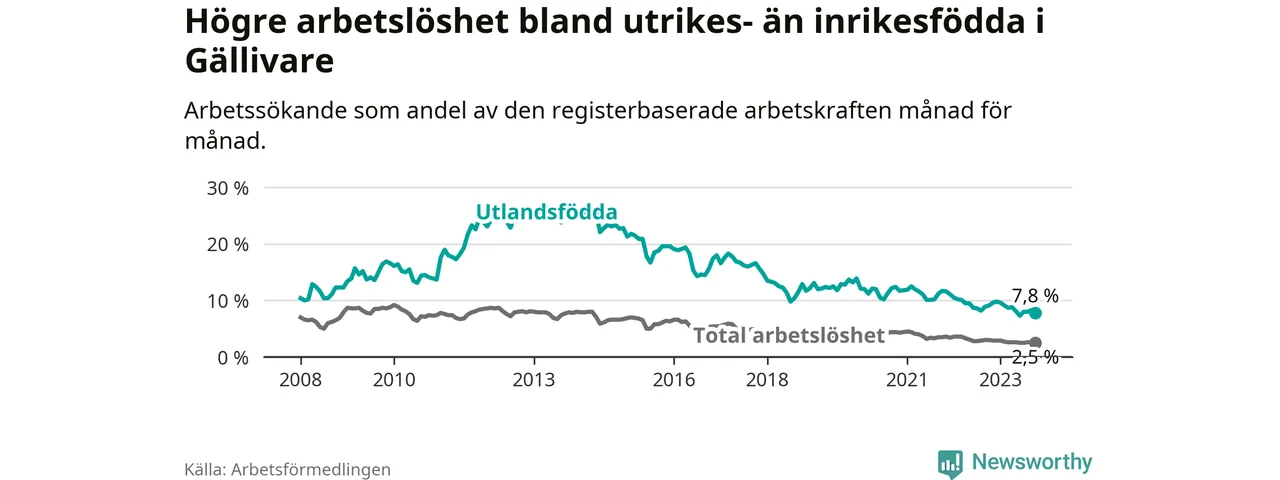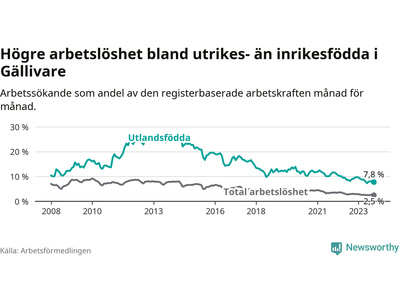 Arbetslösheten bland utlandsfödda var 7,8 procent i Gällivare under oktober månad, motsvarande 89 av 1 141 personer. Det är 1,3 procentenheter färre än vid samma tidpunkt i fjol (−12 om man räknar personer). Därmed har de utlandsföddas arbetslöshet varit lägre än vid samma tidpunkt i fjol i över två år i sträck. Sedan mars 2021 har arbetslösheten bland utlandsfödda minskat från 12,0 till 7,8 procent.
