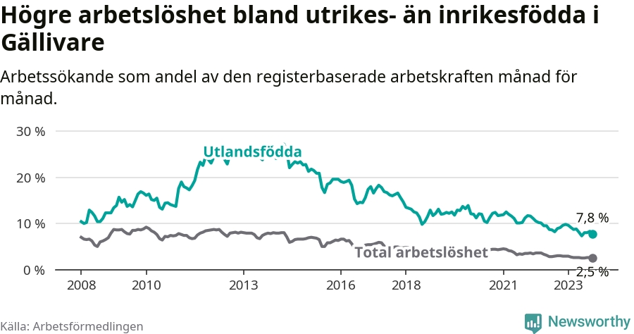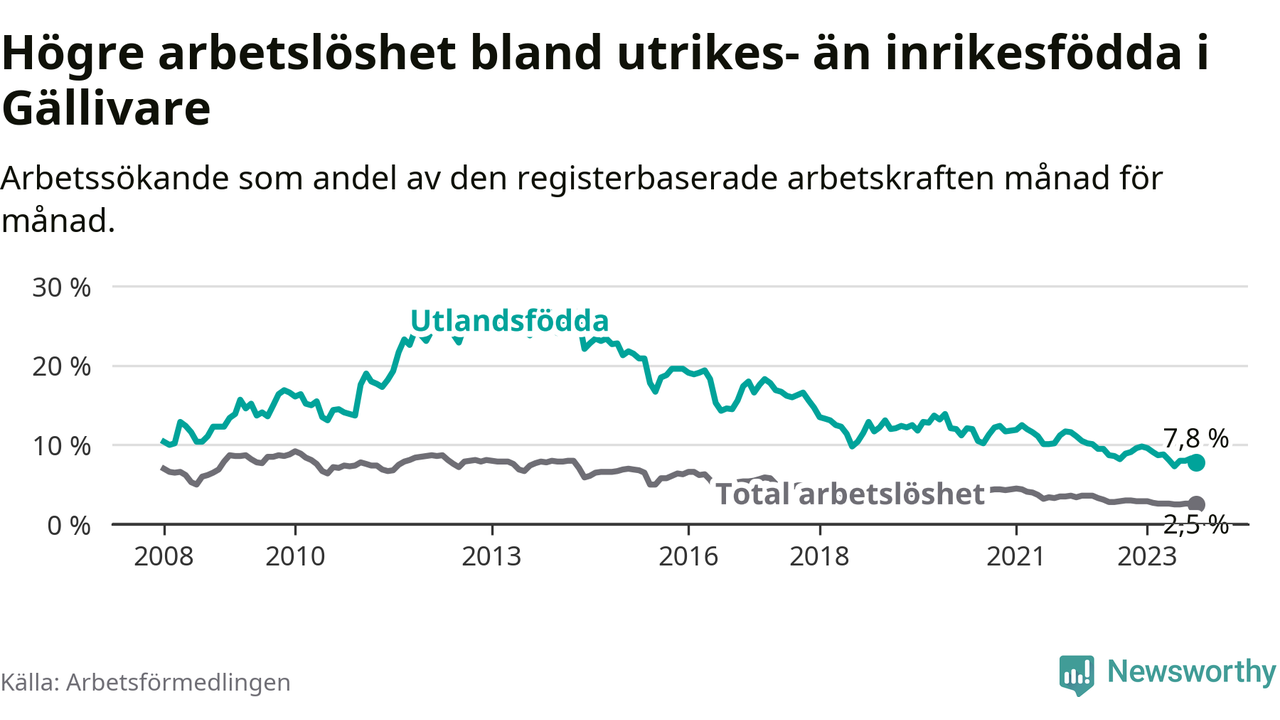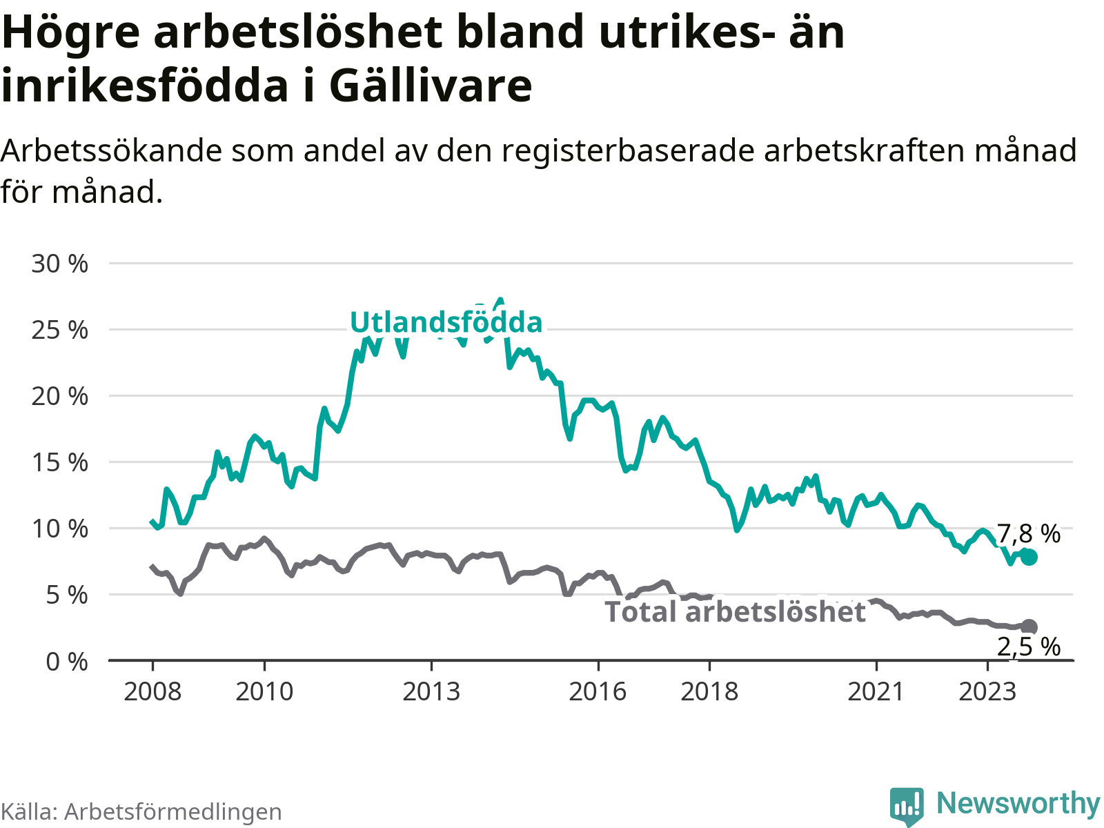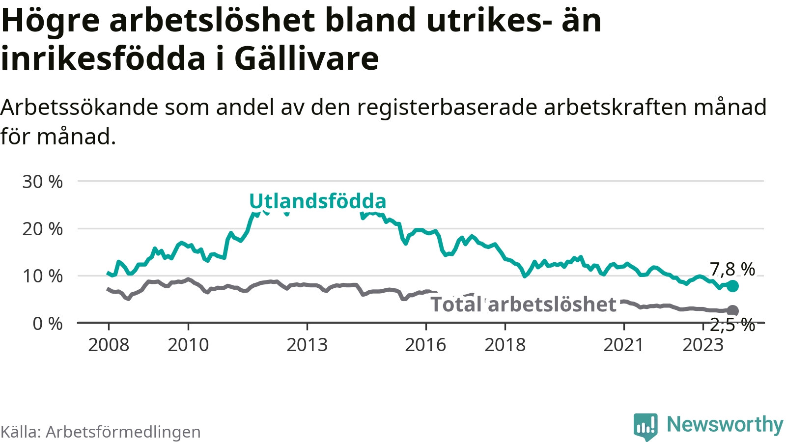 Arbetslösheten bland utlandsfödda var 7,8 procent i Gällivare under oktober månad, motsvarande 89 av 1 141 personer. Det är 1,3 procentenheter färre än vid samma tidpunkt i fjol (−12 om man räknar personer). Därmed har de utlandsföddas arbetslöshet varit lägre än vid samma tidpunkt i fjol i över två år i sträck. Sedan mars 2021 har arbetslösheten bland utlandsfödda minskat från 12,0 till 7,8 procent.