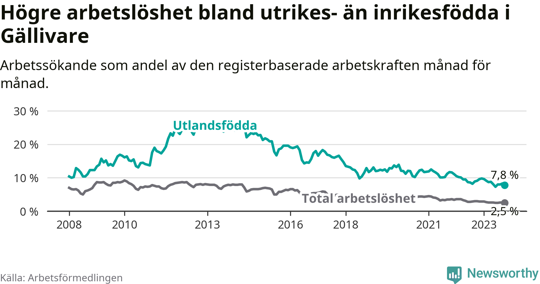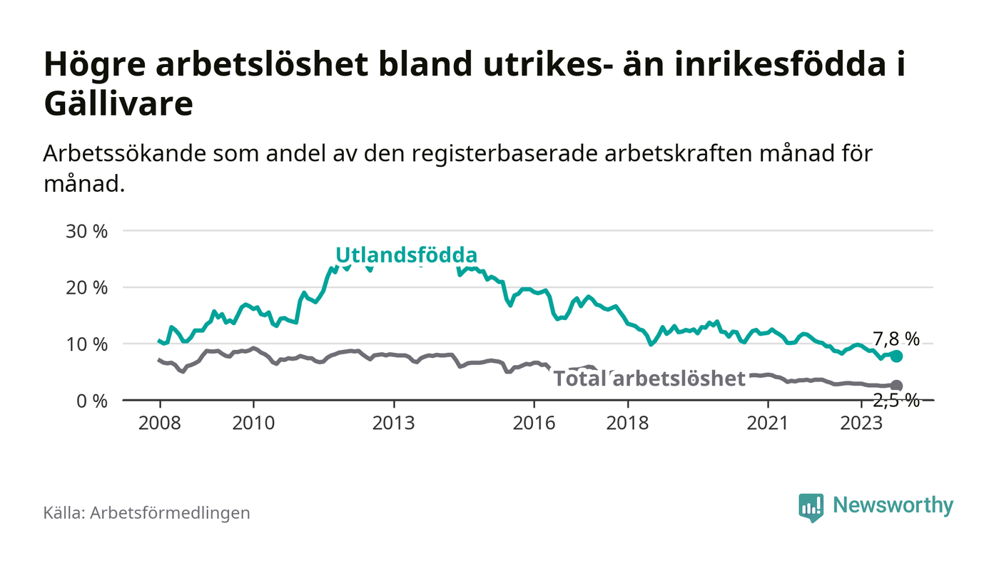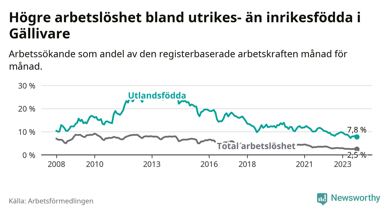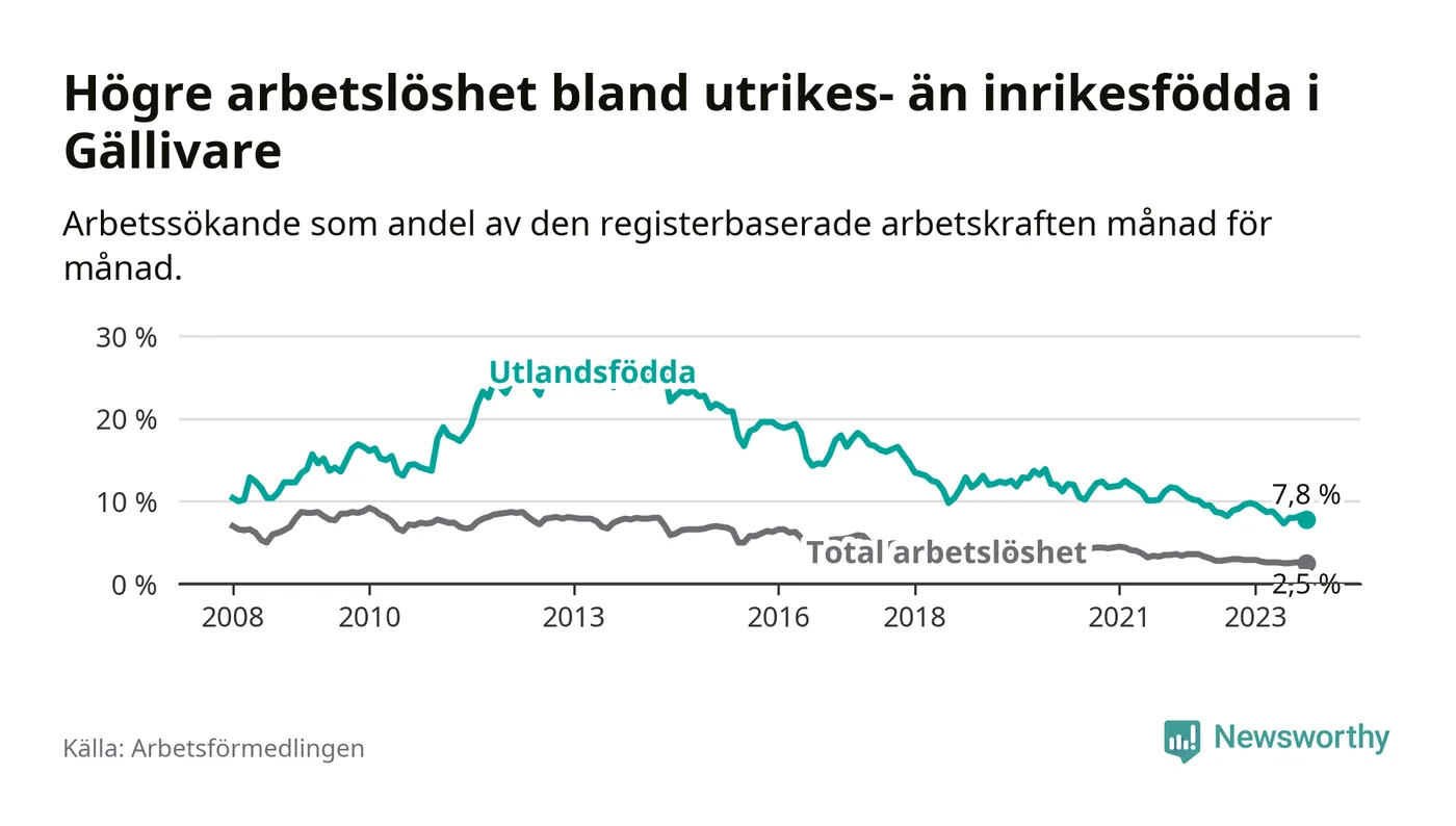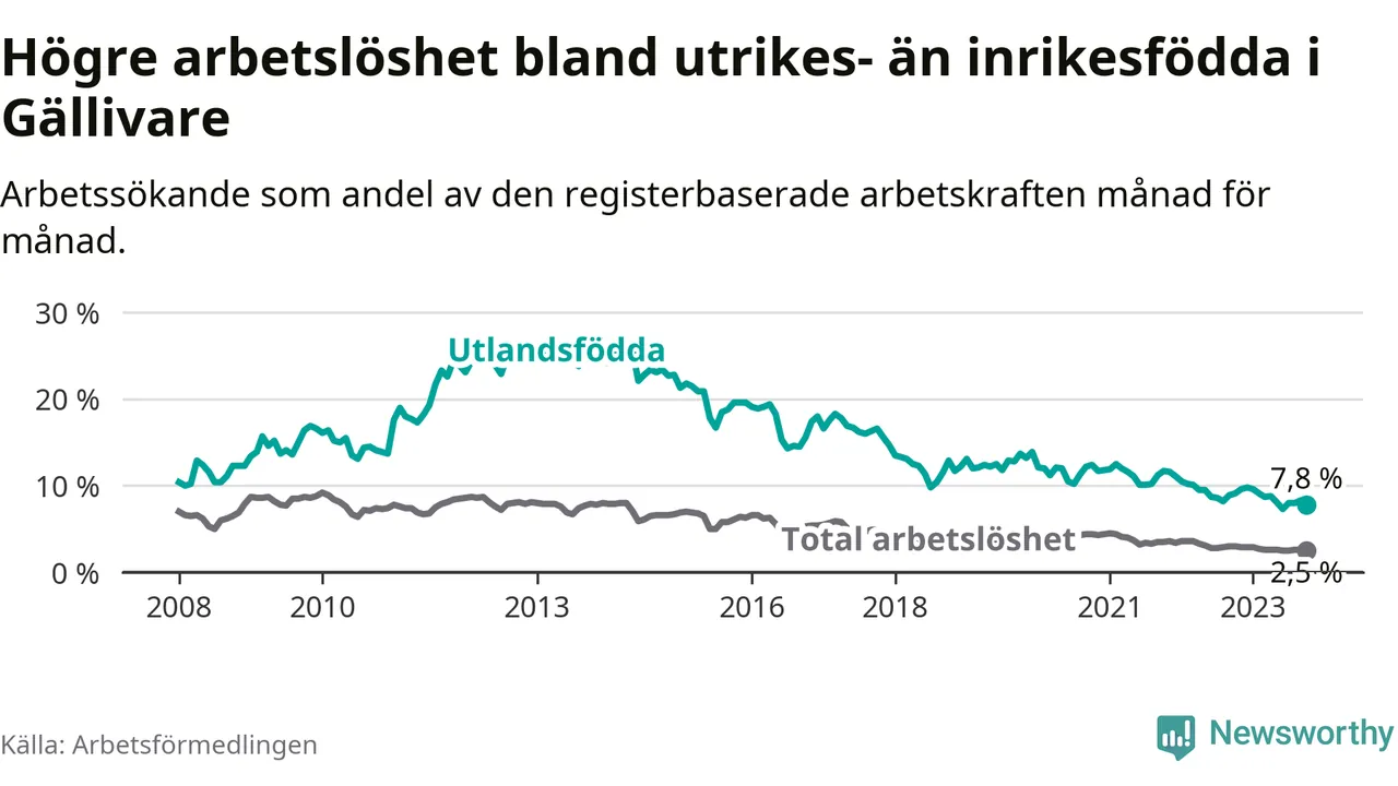 Skillnaden i arbetslöshet mellan utrikesfödda och hela befolkningen är 5,3 procentenheter i Gällivare. Det är en mindre skillnad än för ett år sedan (−0,8 procentenheter).
