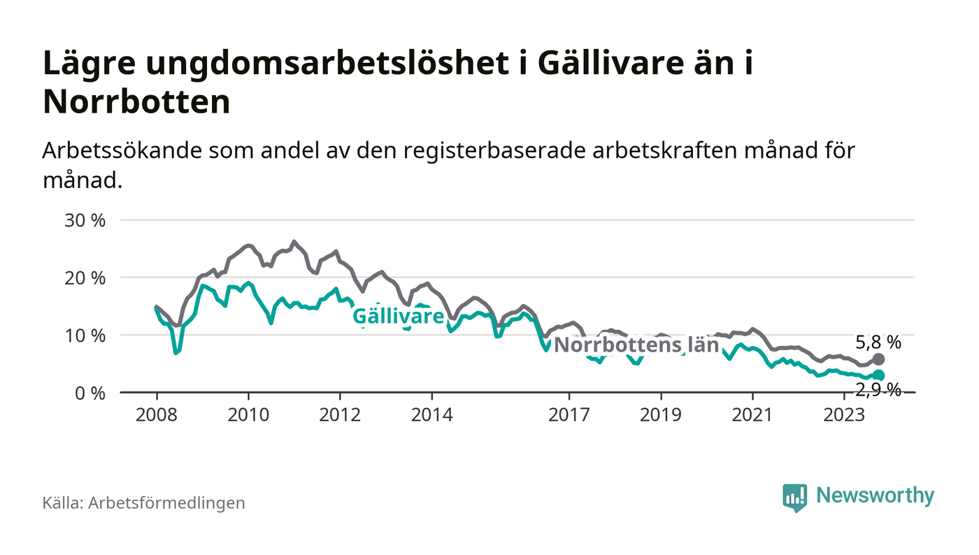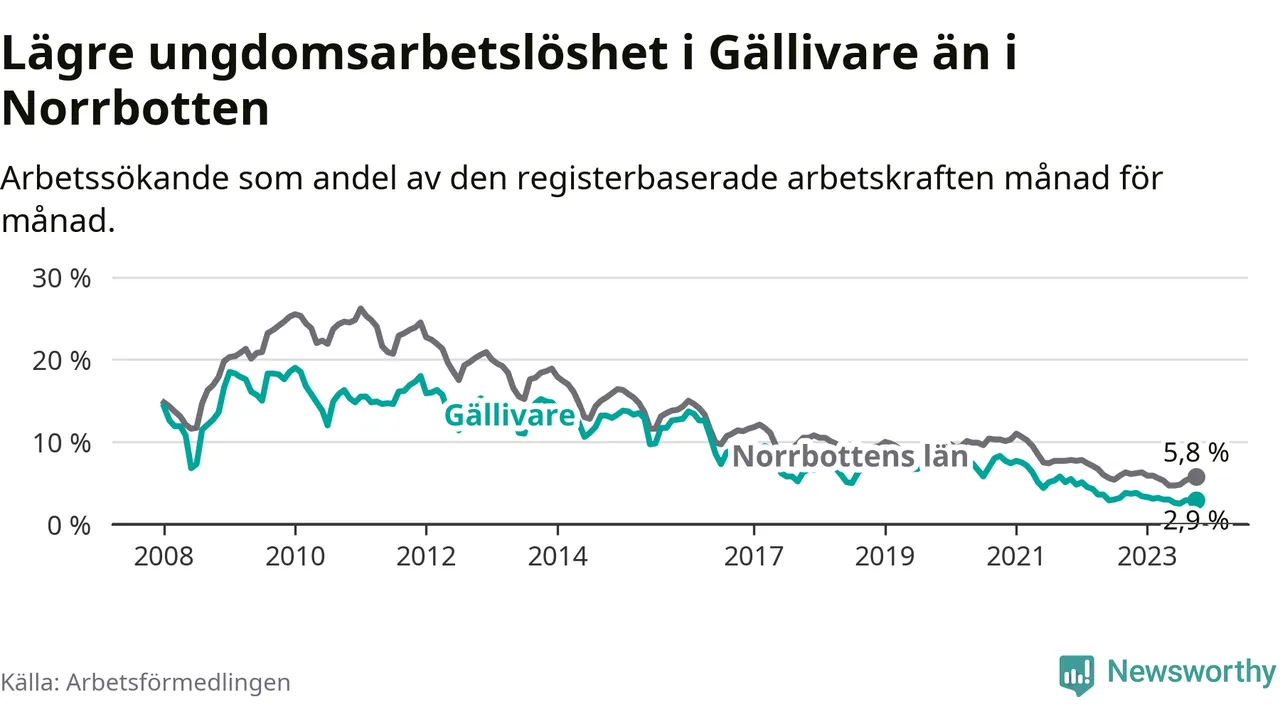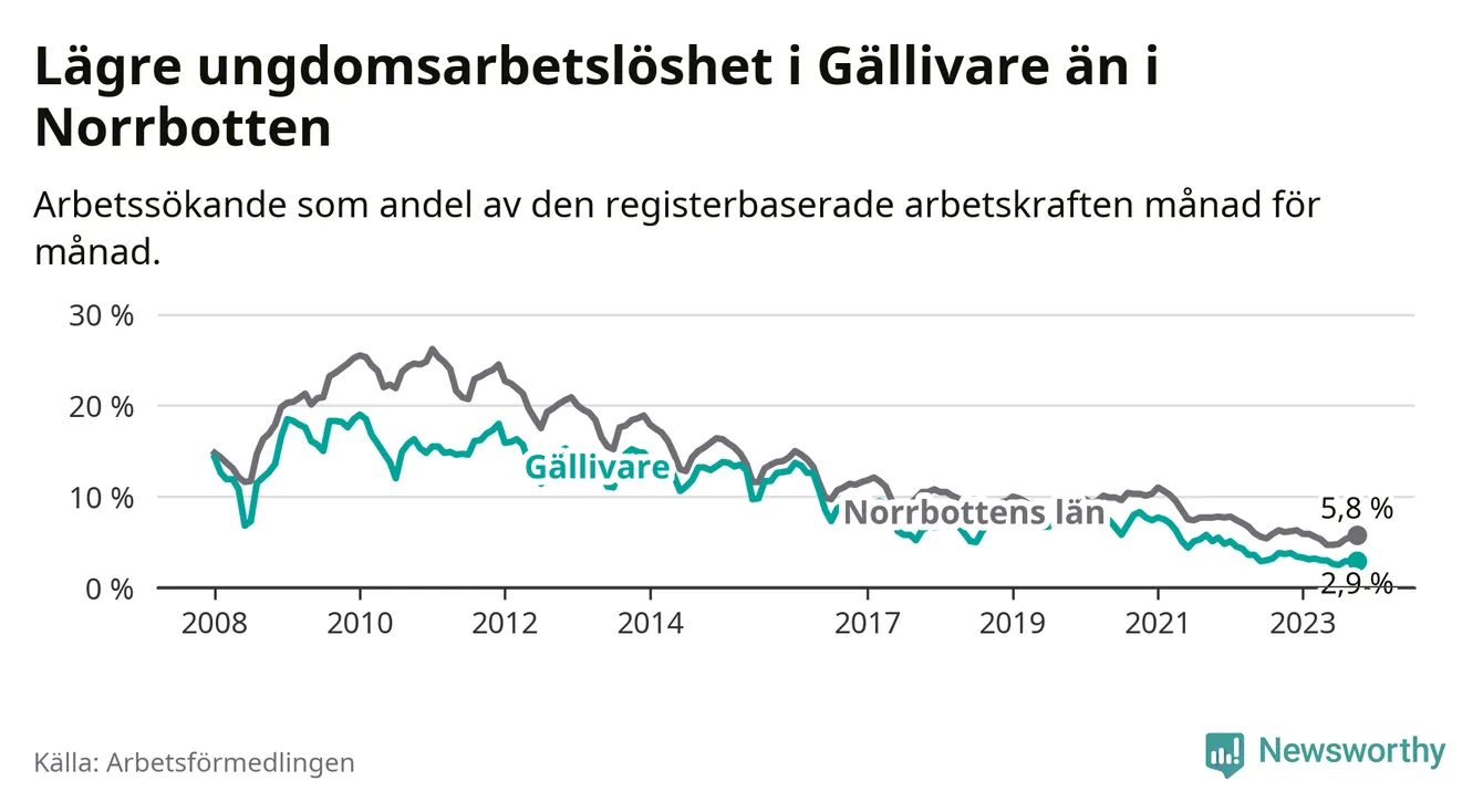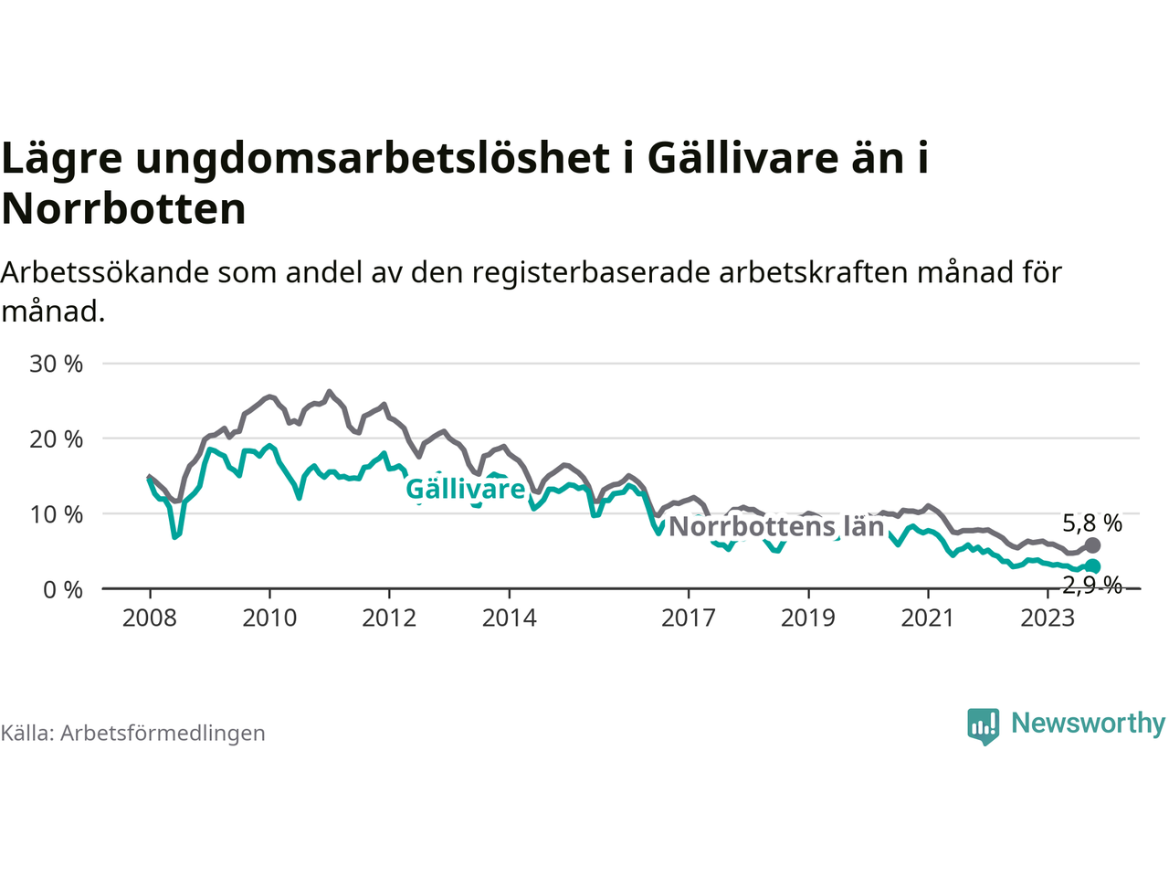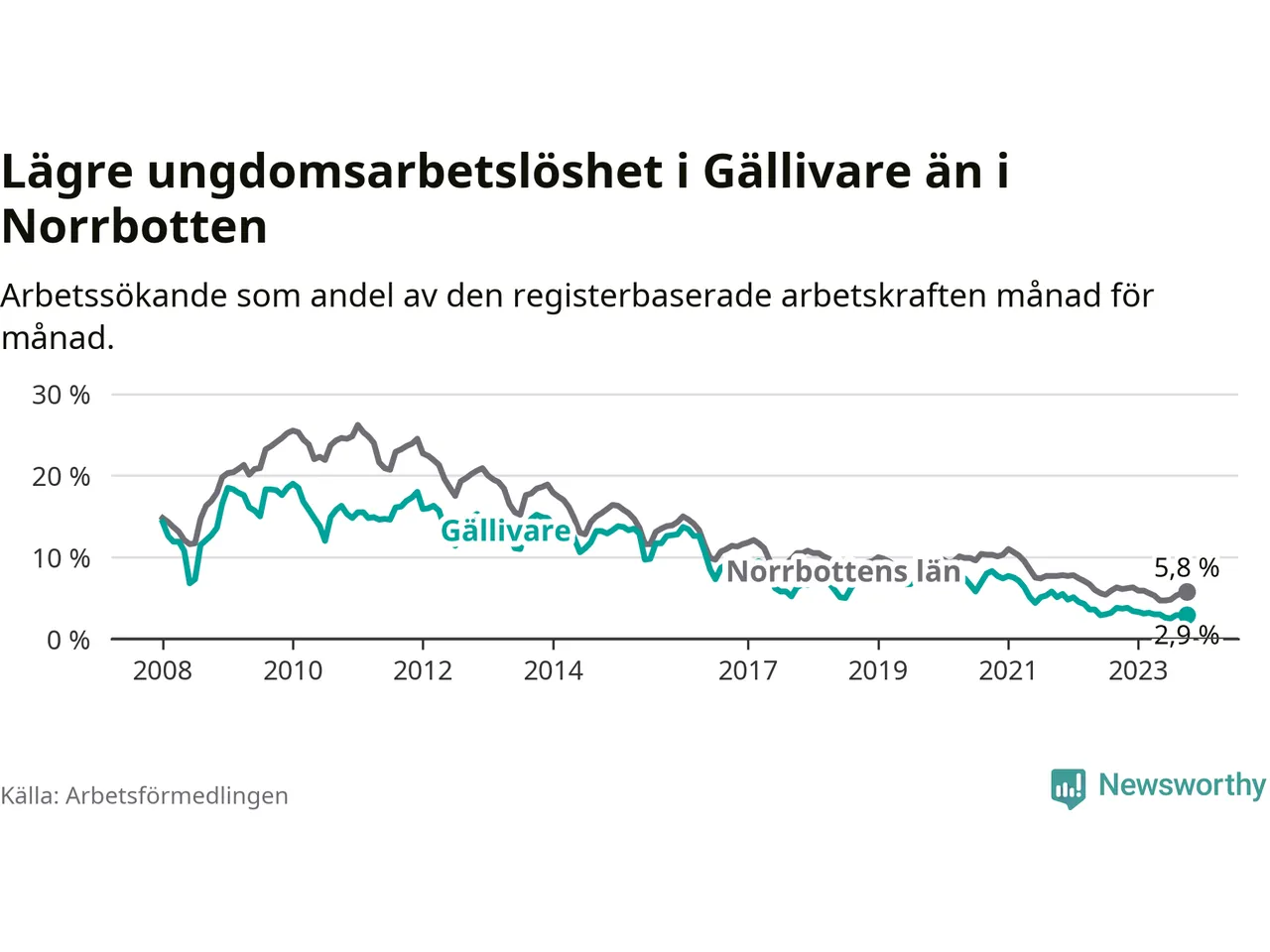 Precis som den totala arbetslösheten ligger ungdomsarbetslösheten i Gällivare lägre än i Norrbotten som helhet. Skillnaden mellan kommunen och länet är 2,9 procentenheter.