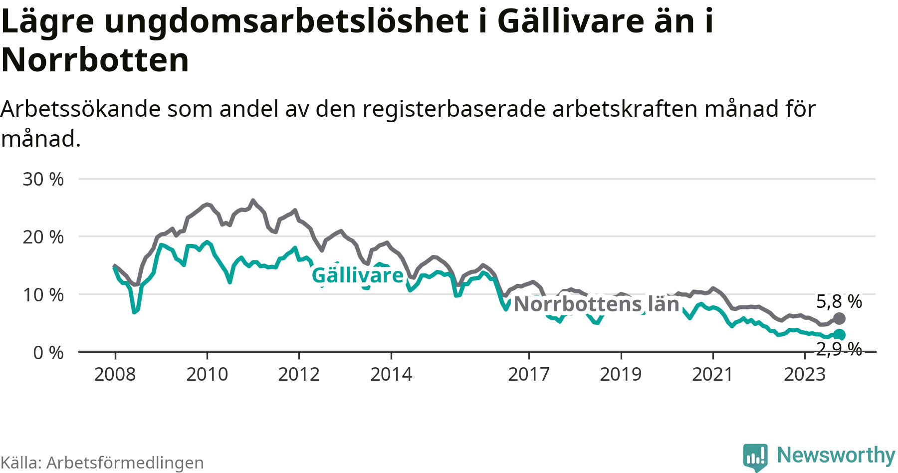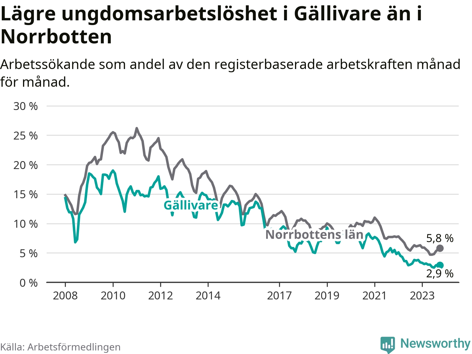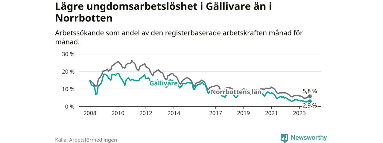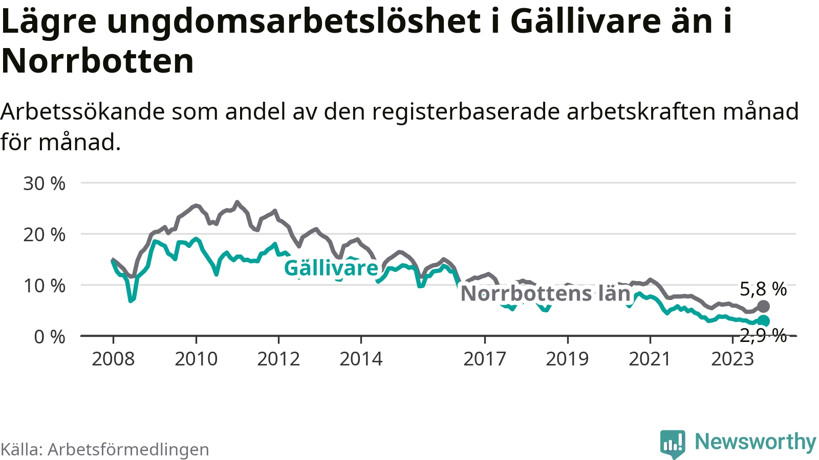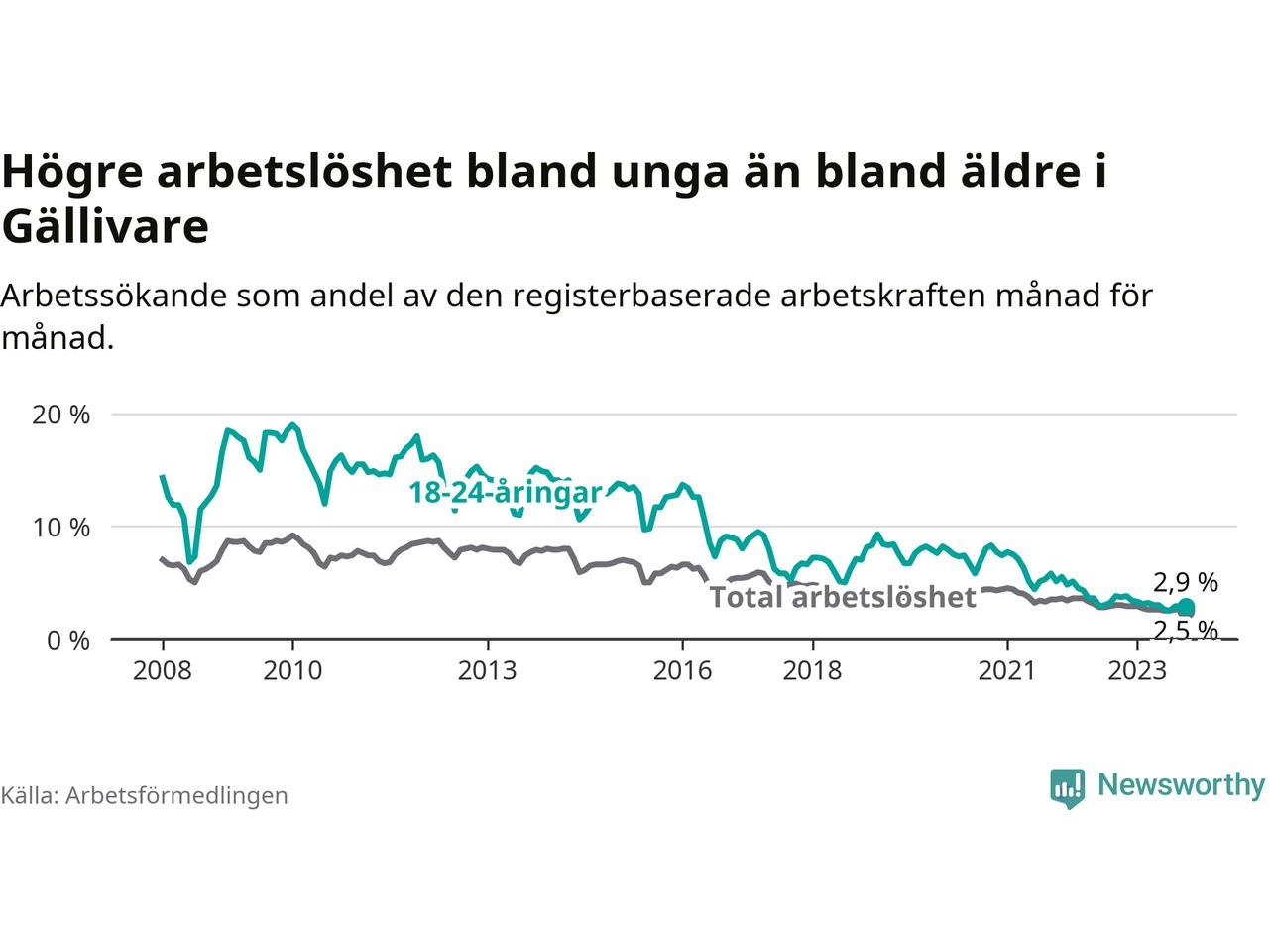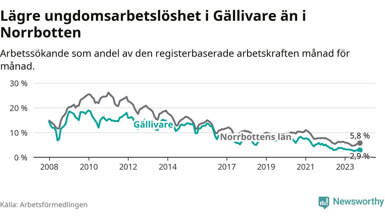 Precis som den totala arbetslösheten ligger ungdomsarbetslösheten i Gällivare lägre än i Norrbotten som helhet. Skillnaden mellan kommunen och länet är 2,9 procentenheter.