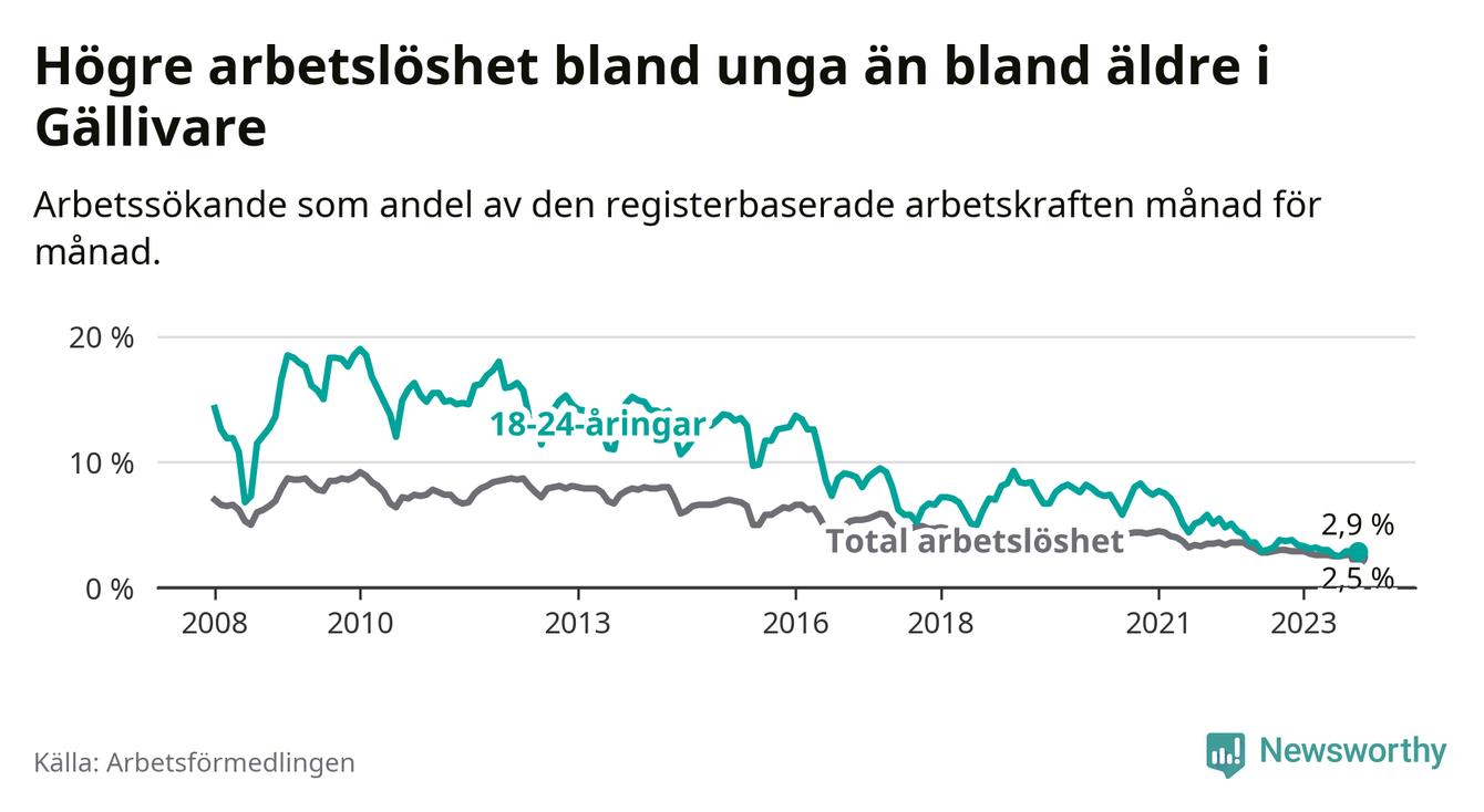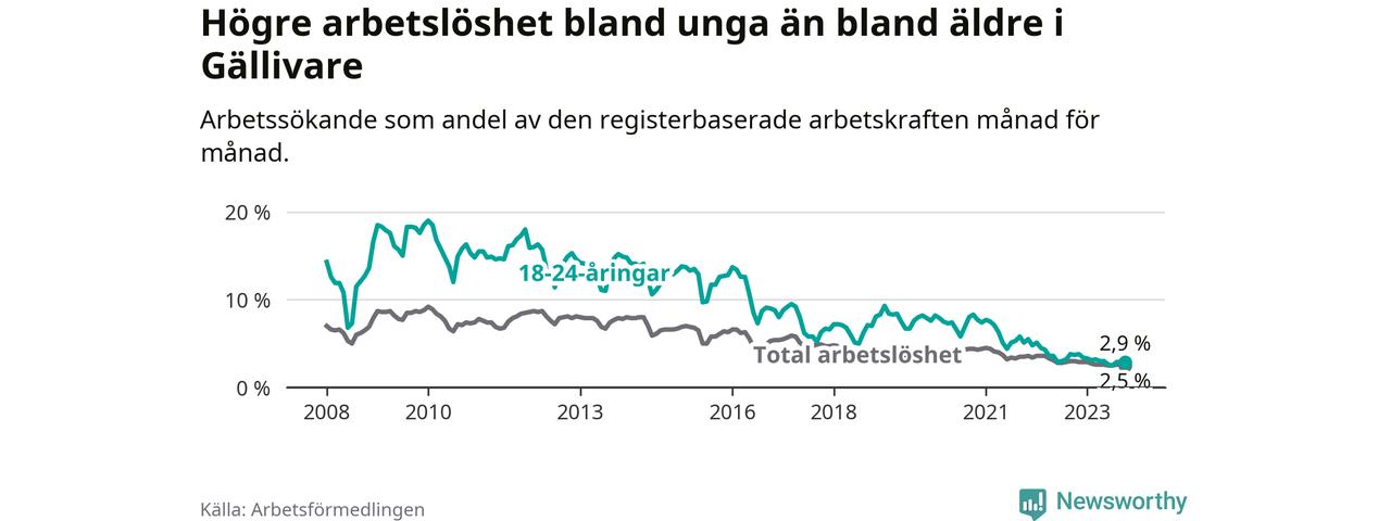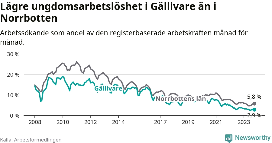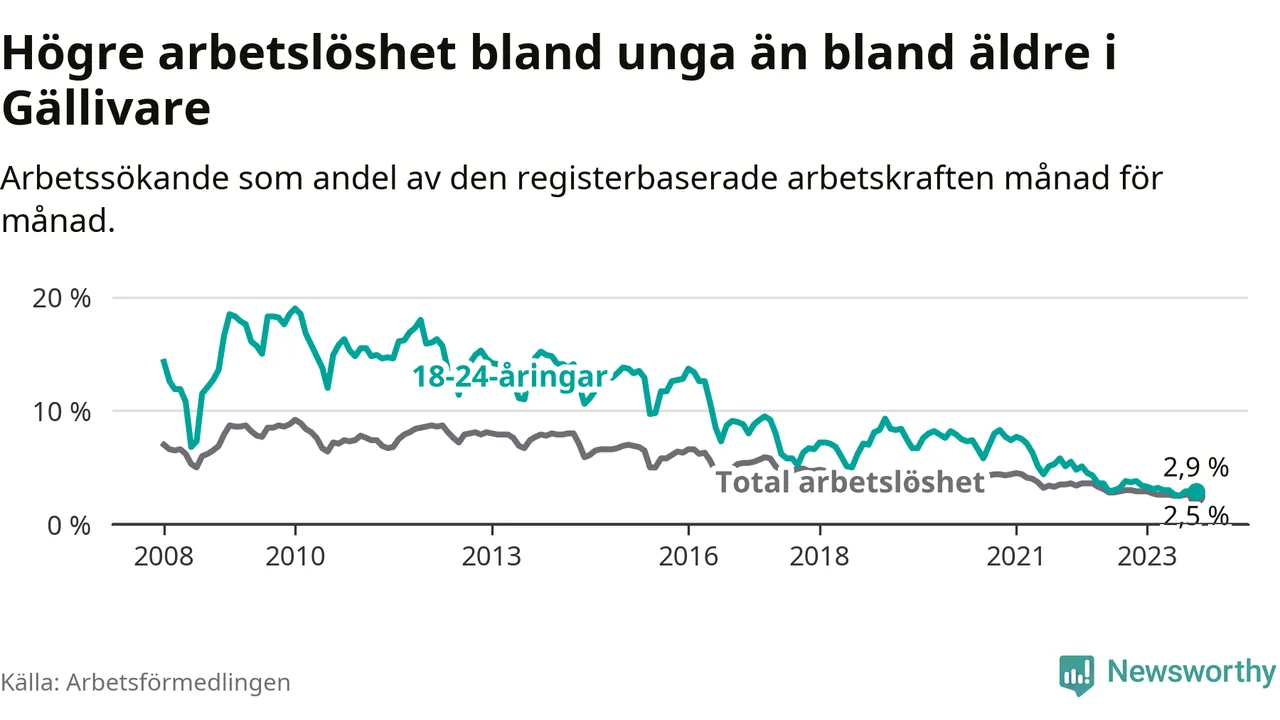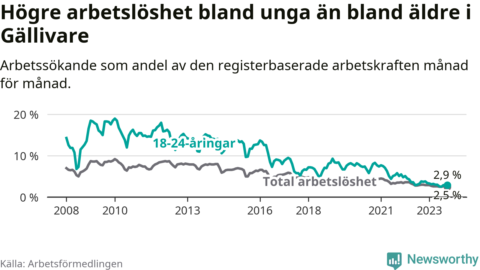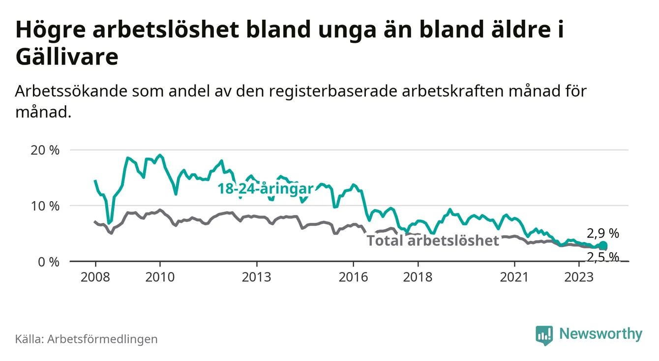 Precis som den totala arbetslösheten ligger ungdomsarbetslösheten i Gällivare lägre än i Norrbotten som helhet. Skillnaden mellan kommunen och länet är 2,9 procentenheter.