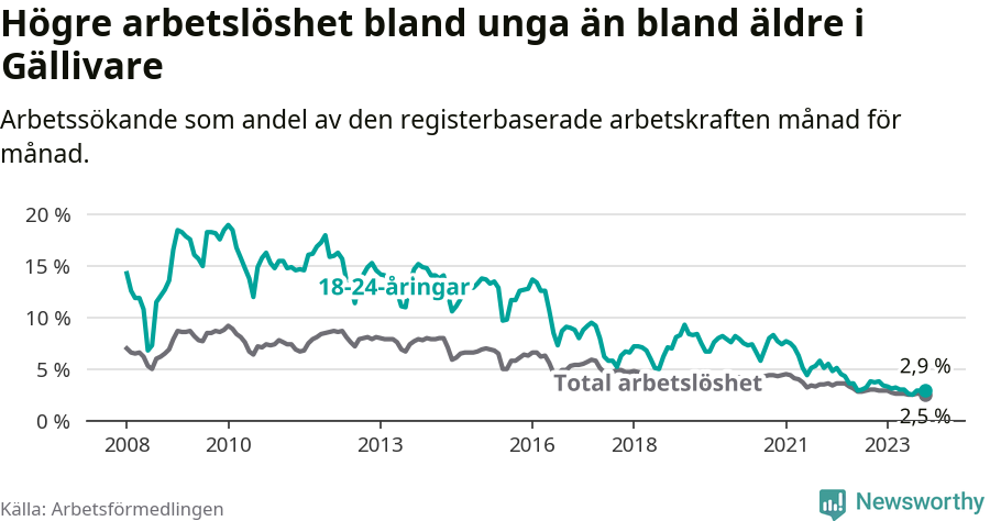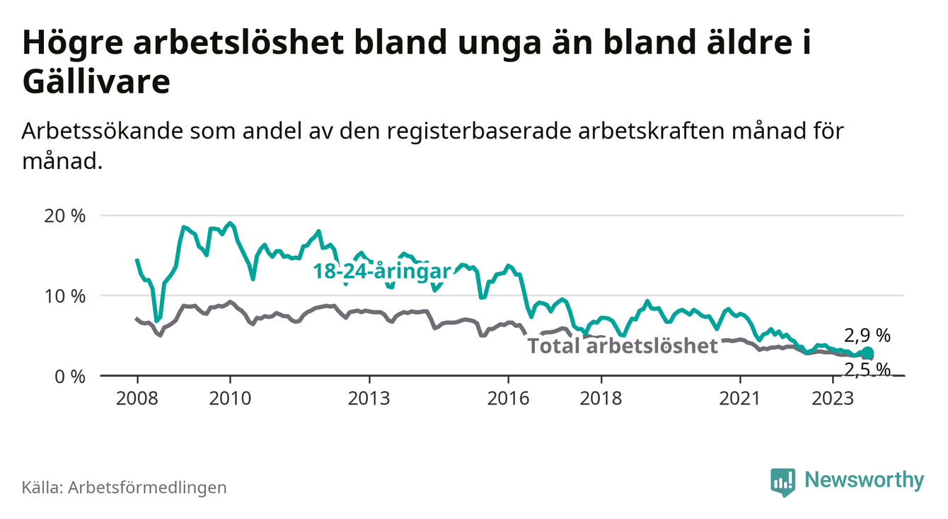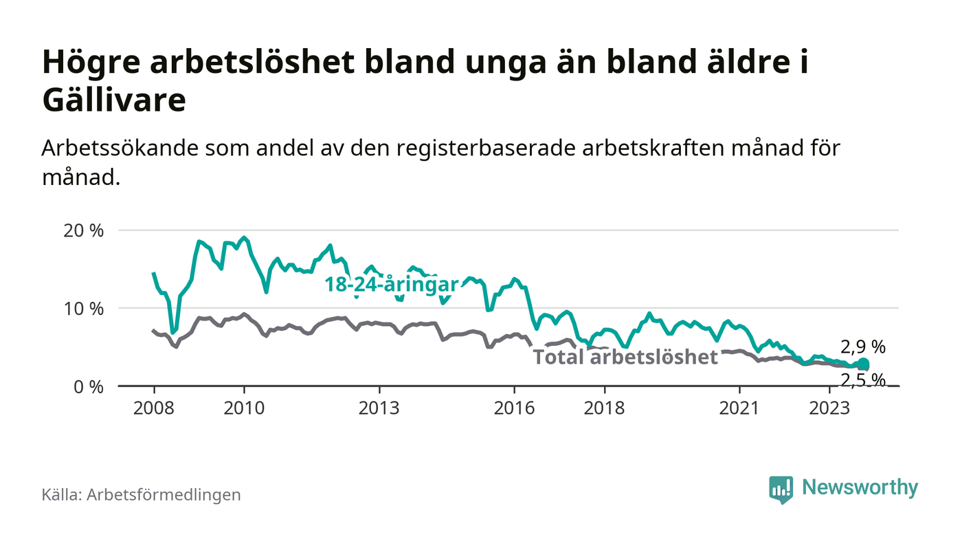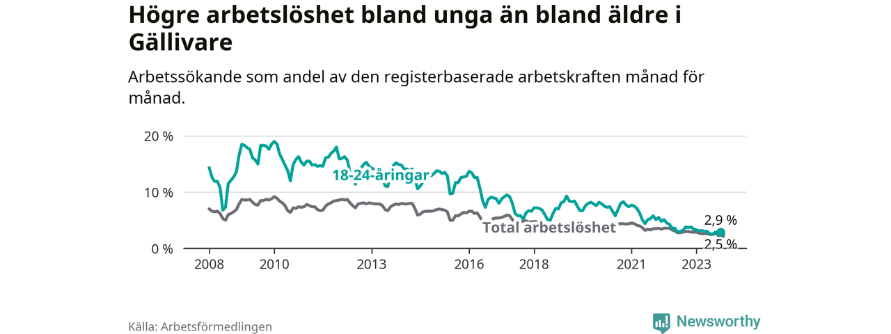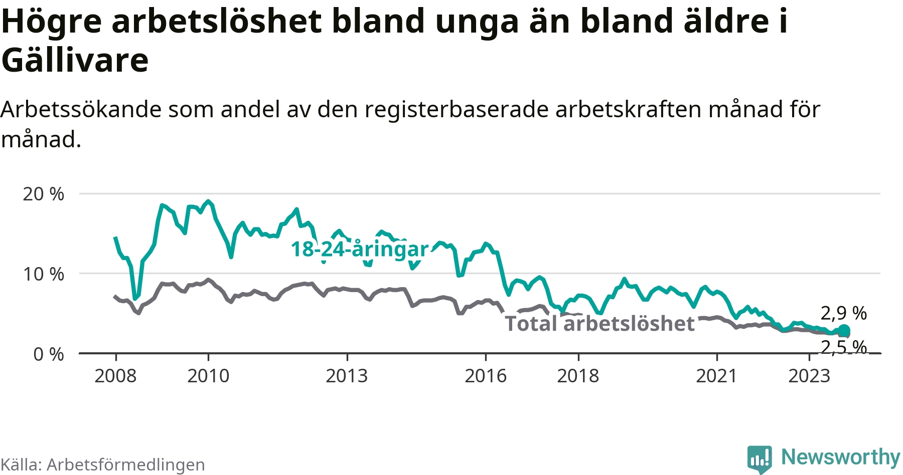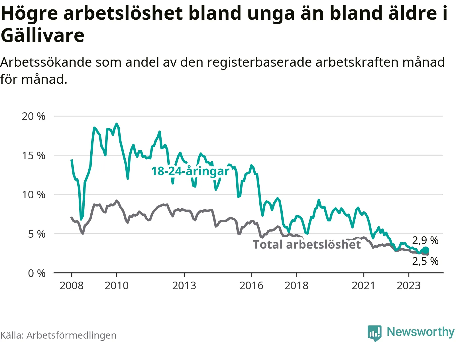 Precis som den totala arbetslösheten ligger ungdomsarbetslösheten i Gällivare lägre än i Norrbotten som helhet. Skillnaden mellan kommunen och länet är 2,9 procentenheter.