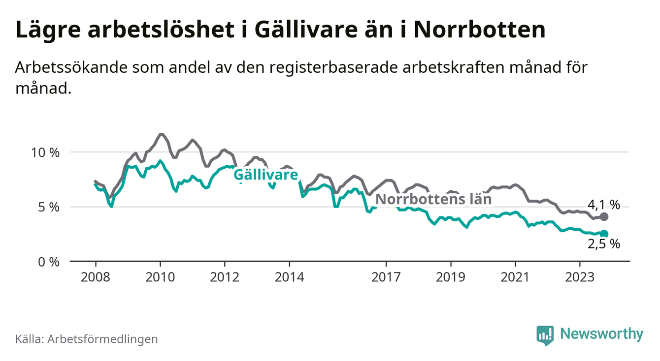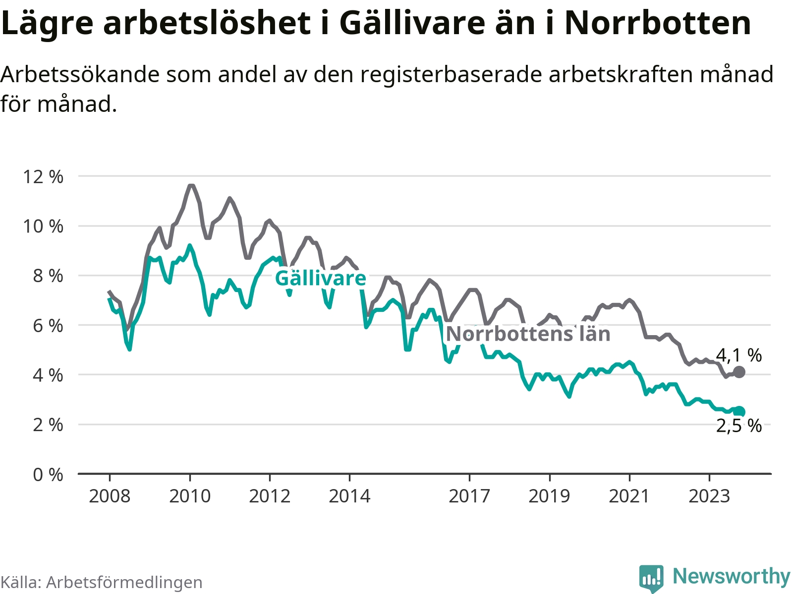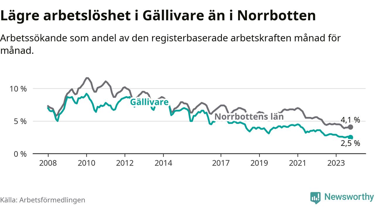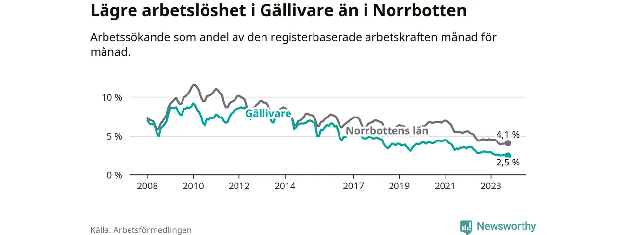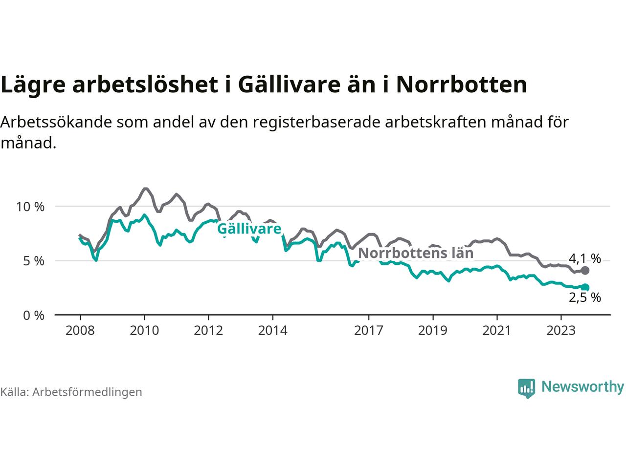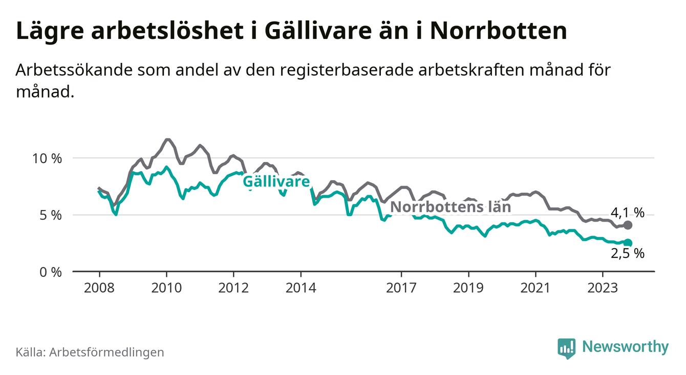Under oktober månad rapporterade Gällivare kommun en total arbetslöshet på 2,5 procent. Det är en minskning jämfört med samma tidpunkt i fjol (−0,5 procentenheter). Även i Norrbottens län sjunker arbetslösheten .