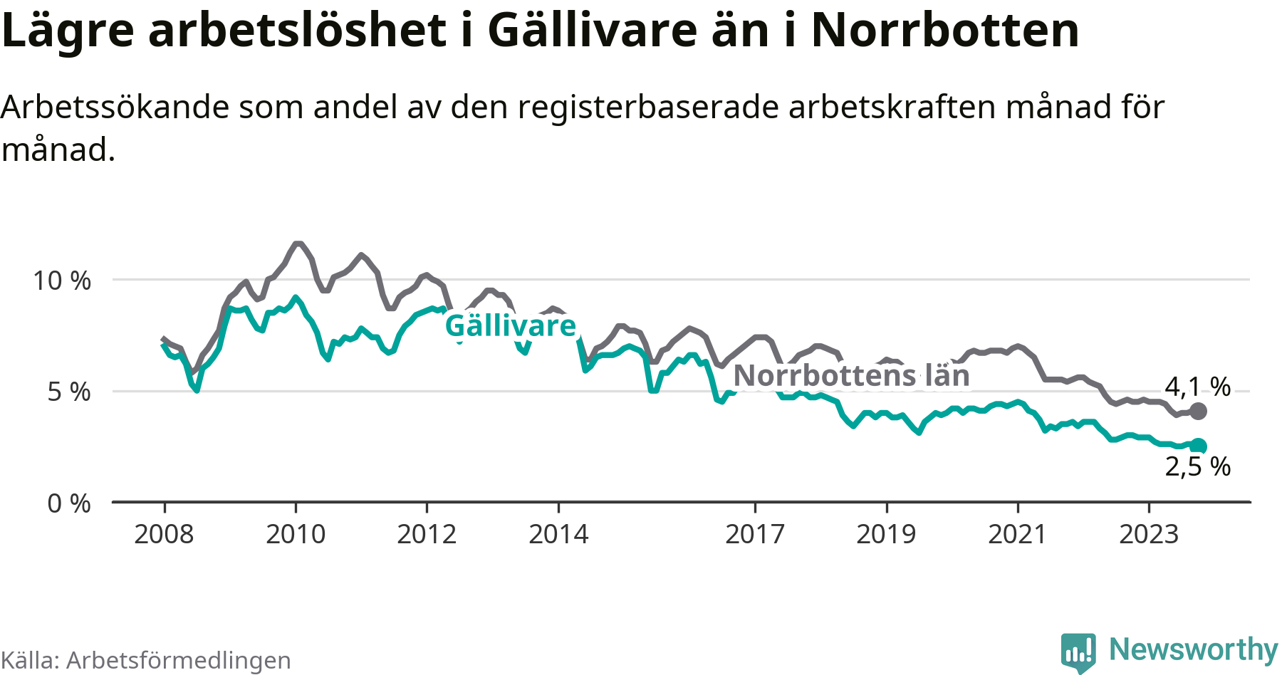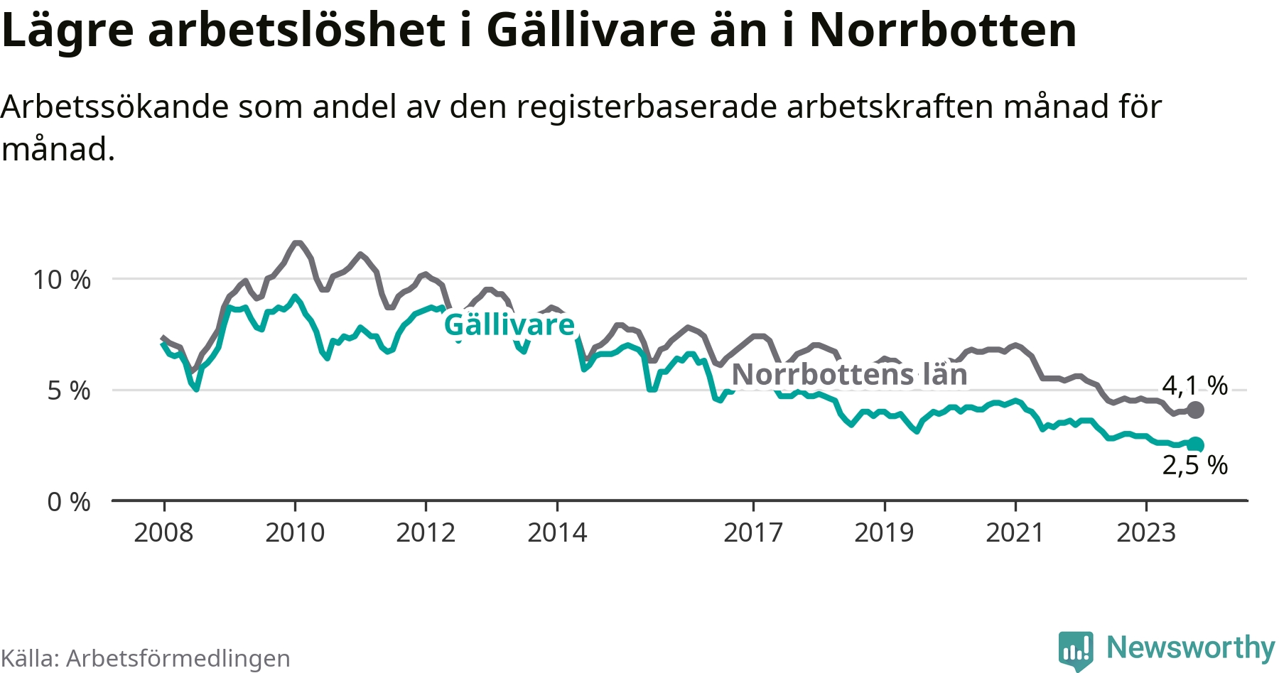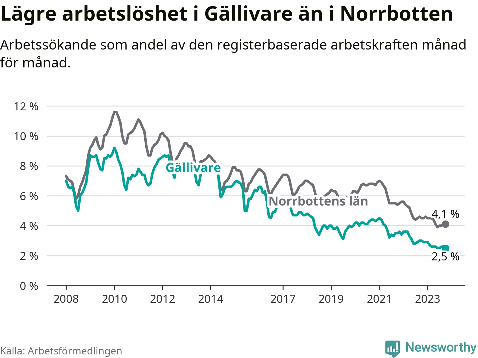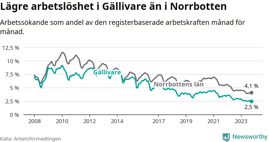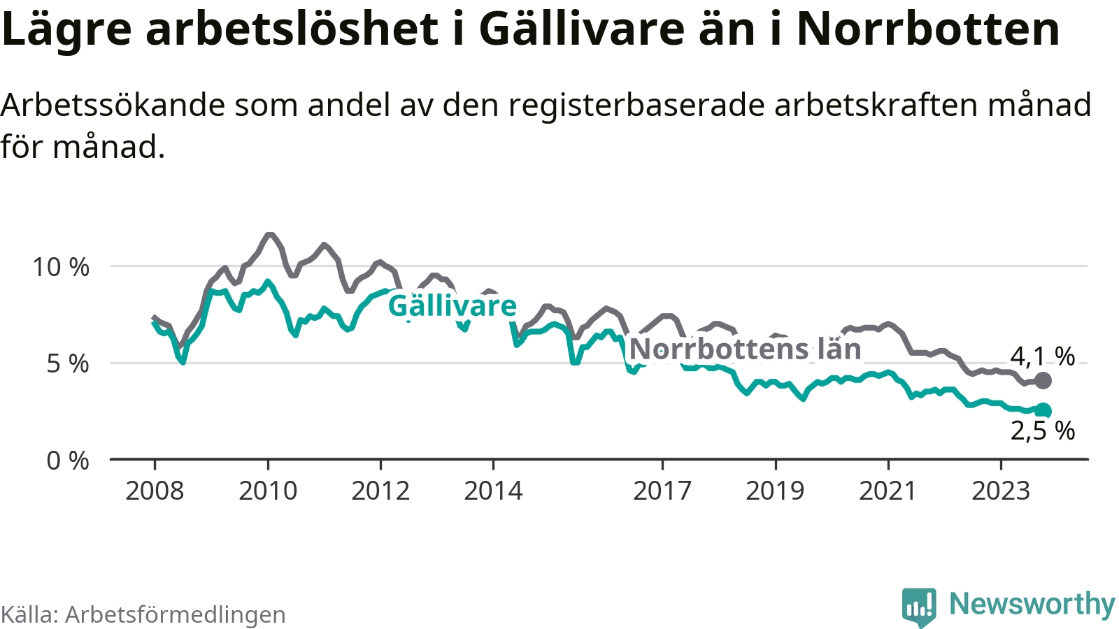 Under oktober månad rapporterade Gällivare kommun en total arbetslöshet på 2,5 procent. Det är en minskning jämfört med samma tidpunkt i fjol (−0,5 procentenheter). Även i Norrbottens län sjunker arbetslösheten .