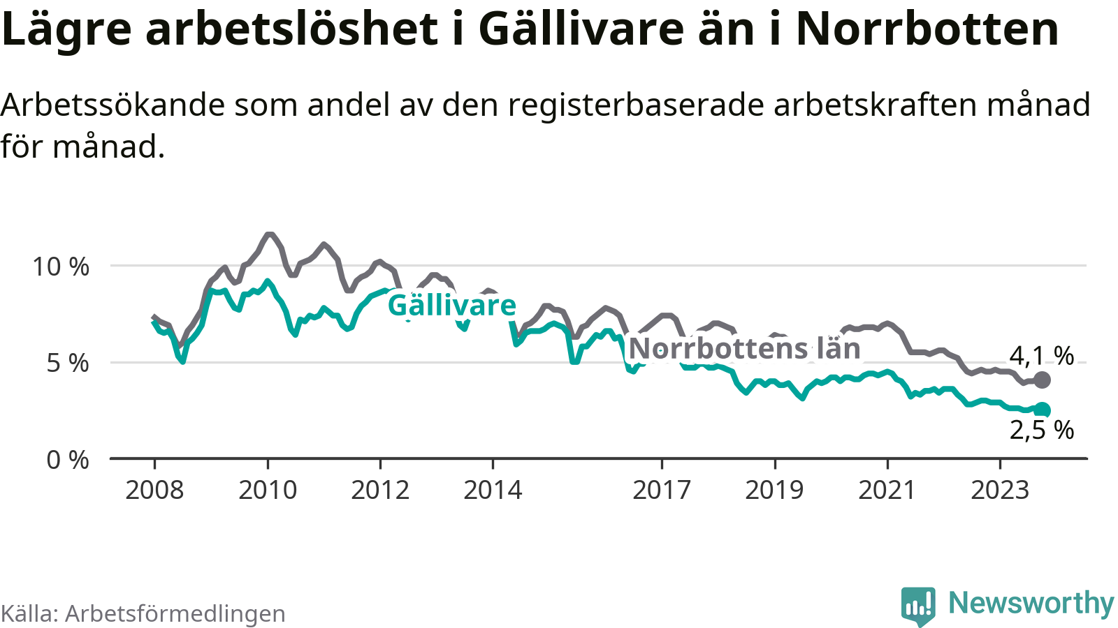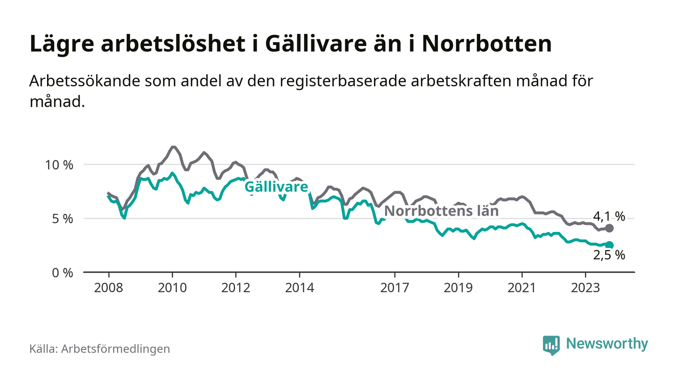 Malmö är den kommun som har högst arbetslöshet just nu (12,3 procent) i landet som helhet, medan Kiruna har den lägsta (2,2 procent). Gällivares arbetslöshet sticker ut som den tredje lägsta i hela landet.