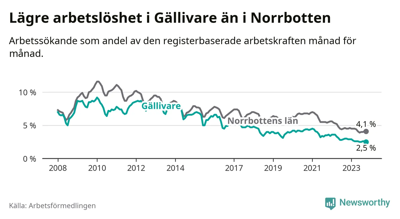 Gällivare hade redan tidigare lägre arbetslöshet än snittet i hela Norrbottens län och nu växer klyftan (2,5 procent i kommunen, jämfört med 4,1 procent i hela länet). Kiruna har den lägsta arbetslösheten i länet (2,2 procent), medan Haparanda har den högsta (7,2 procent). För att Gällivare skulle komma ner i samma arbetslöshetsnivå som Kiruna skulle 27 personer behöva sysselsättas.