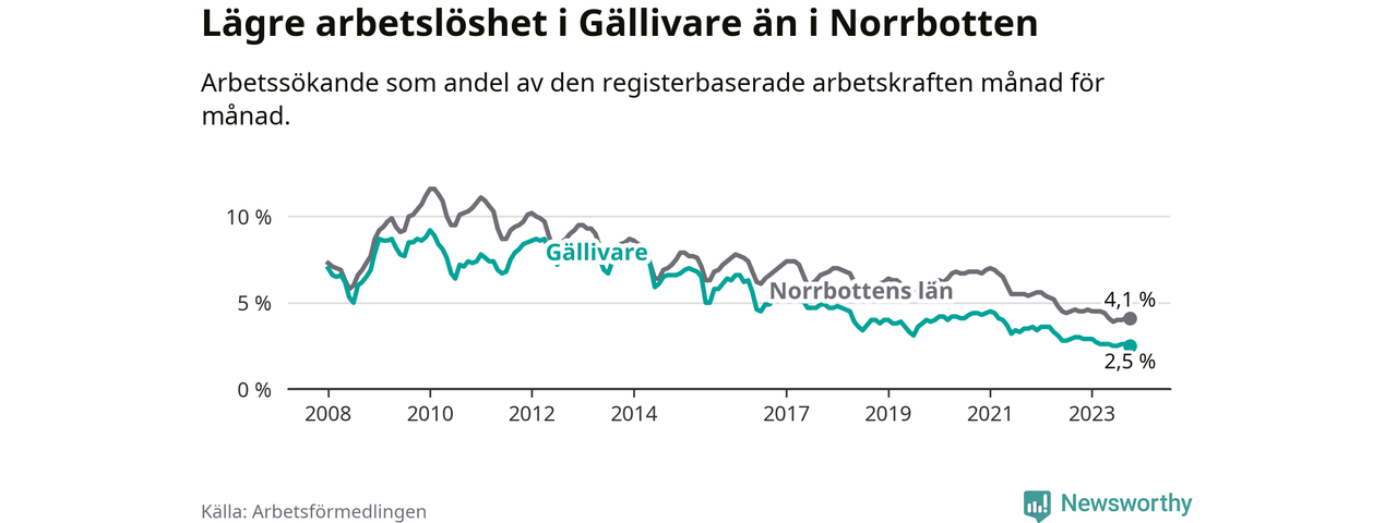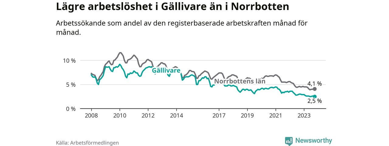 Det är 31:a månaden i följd som arbetslösheten i Gällivare är lägre än den var under samma tidpunkt året innan. Sedan mars 2021 har arbetslösheten gått ner från 4,1 till 2,5 procent.