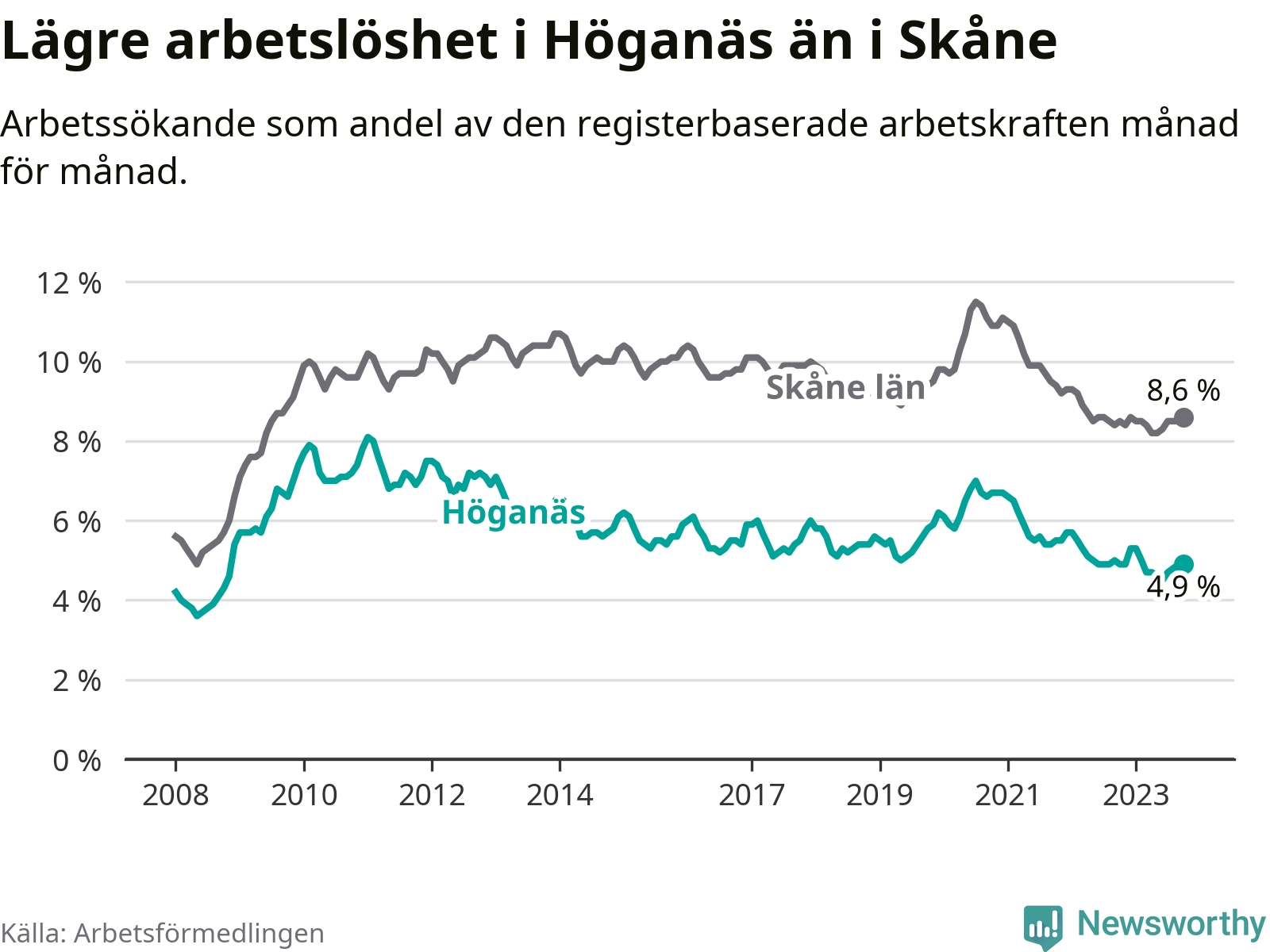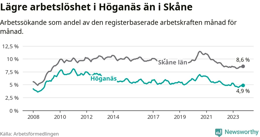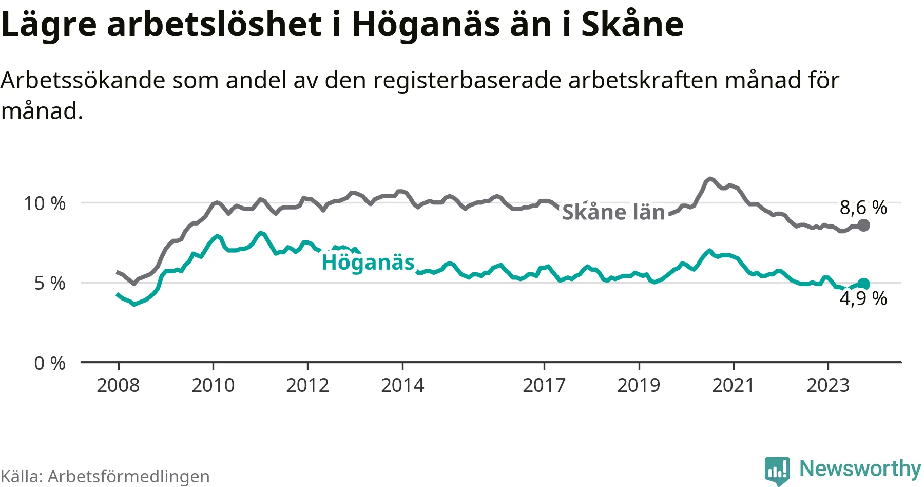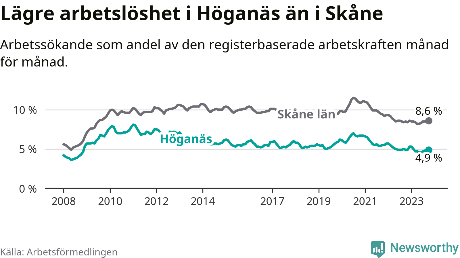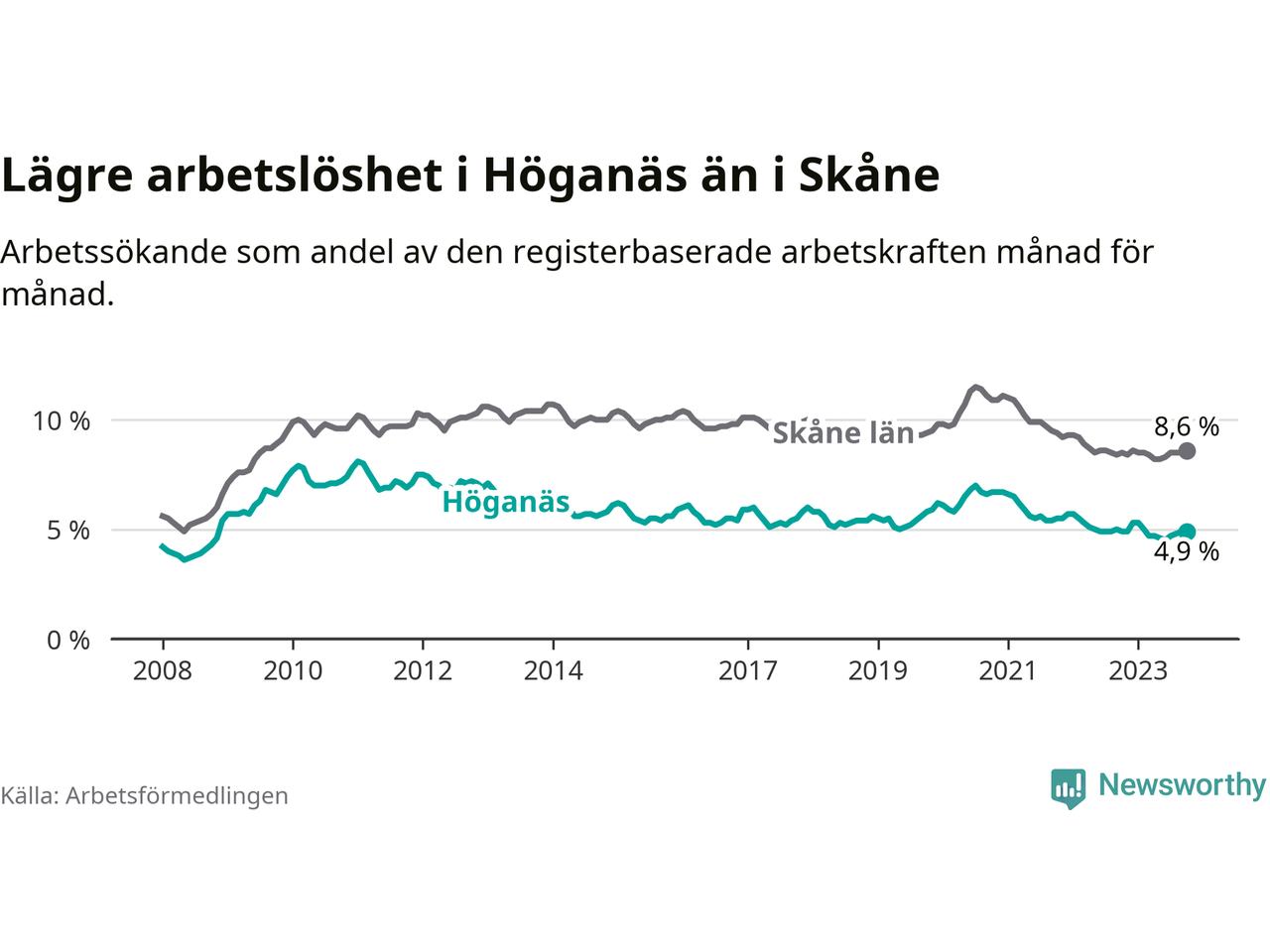 Arbetslösheten i Höganäs ligger under nivån i hela Skåne län (4,9 procent i kommunen, jämfört med 8,6 procent i hela länet). Vellinge har den lägsta arbetslösheten i länet (3,3 procent), medan Malmö har den högsta (12,3 procent). För att Höganäs skulle komma ner i samma arbetslöshetsnivå som Vellinge skulle 200 personer behöva sysselsättas.