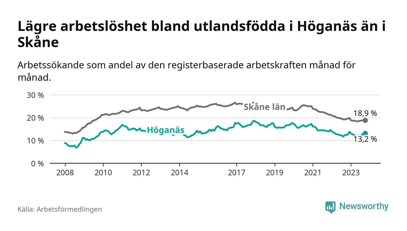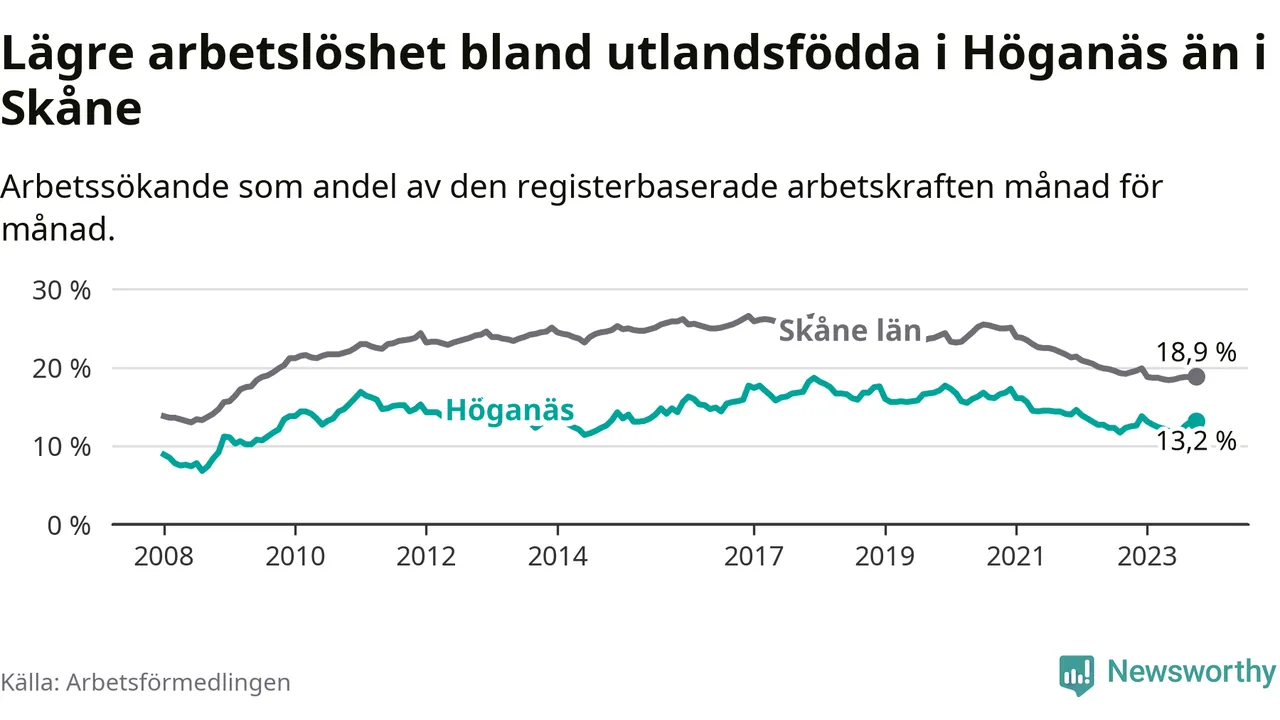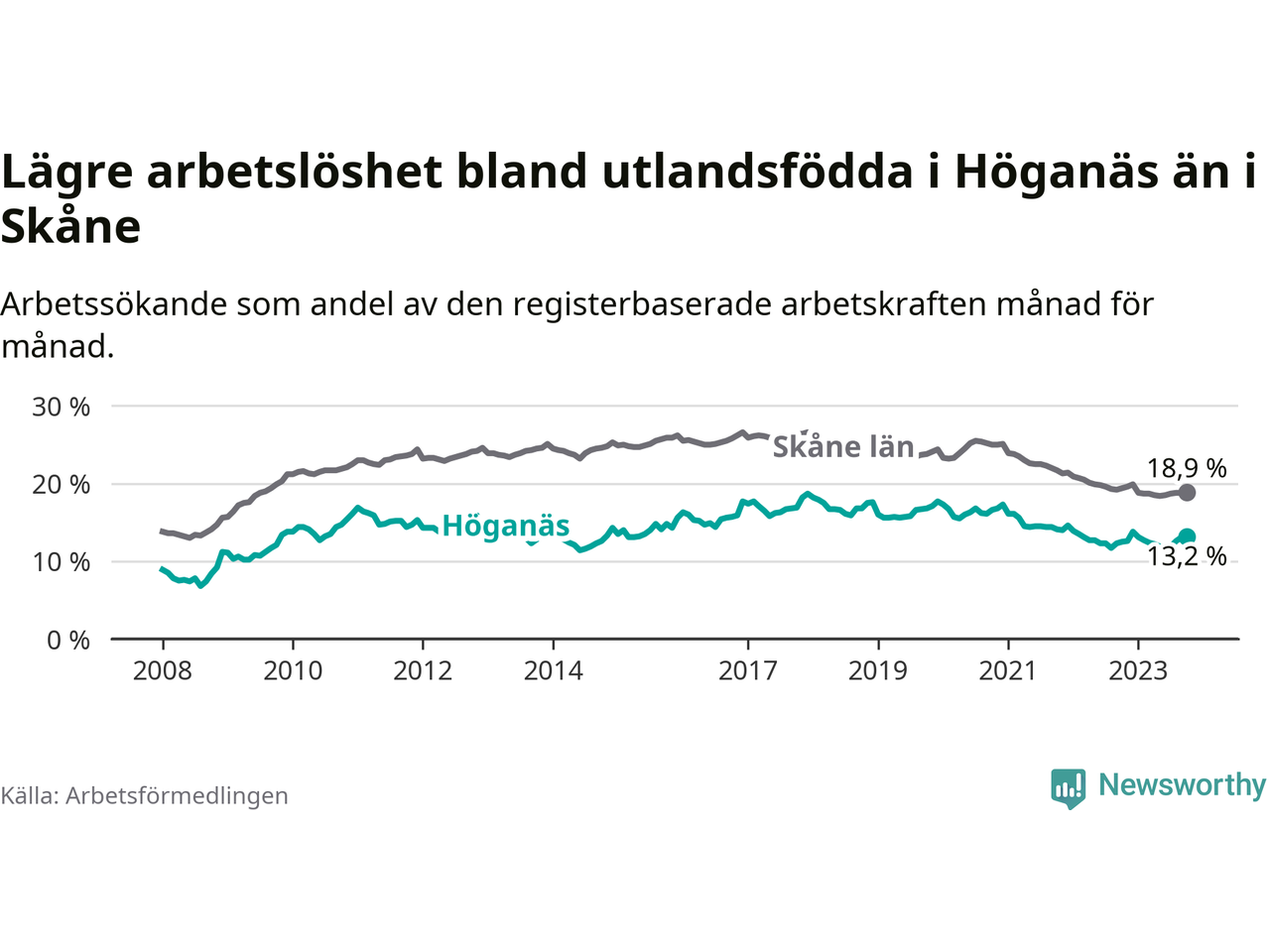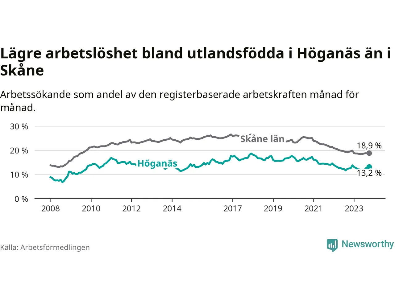 Medan arbetslösheten bland utlandsfödda alltså ökar i Höganäs så minskar den i Skåne. Jämfört med oktober förra året har andelen arbetslösa utlandsfödda i länet minskat med 0,5 procentenheter (till 18,9 procent). Trots den senaste uppgången har Höganäs med andra ord fortfarande lägre arbetslöshet bland utlandsfödda än Skåne.