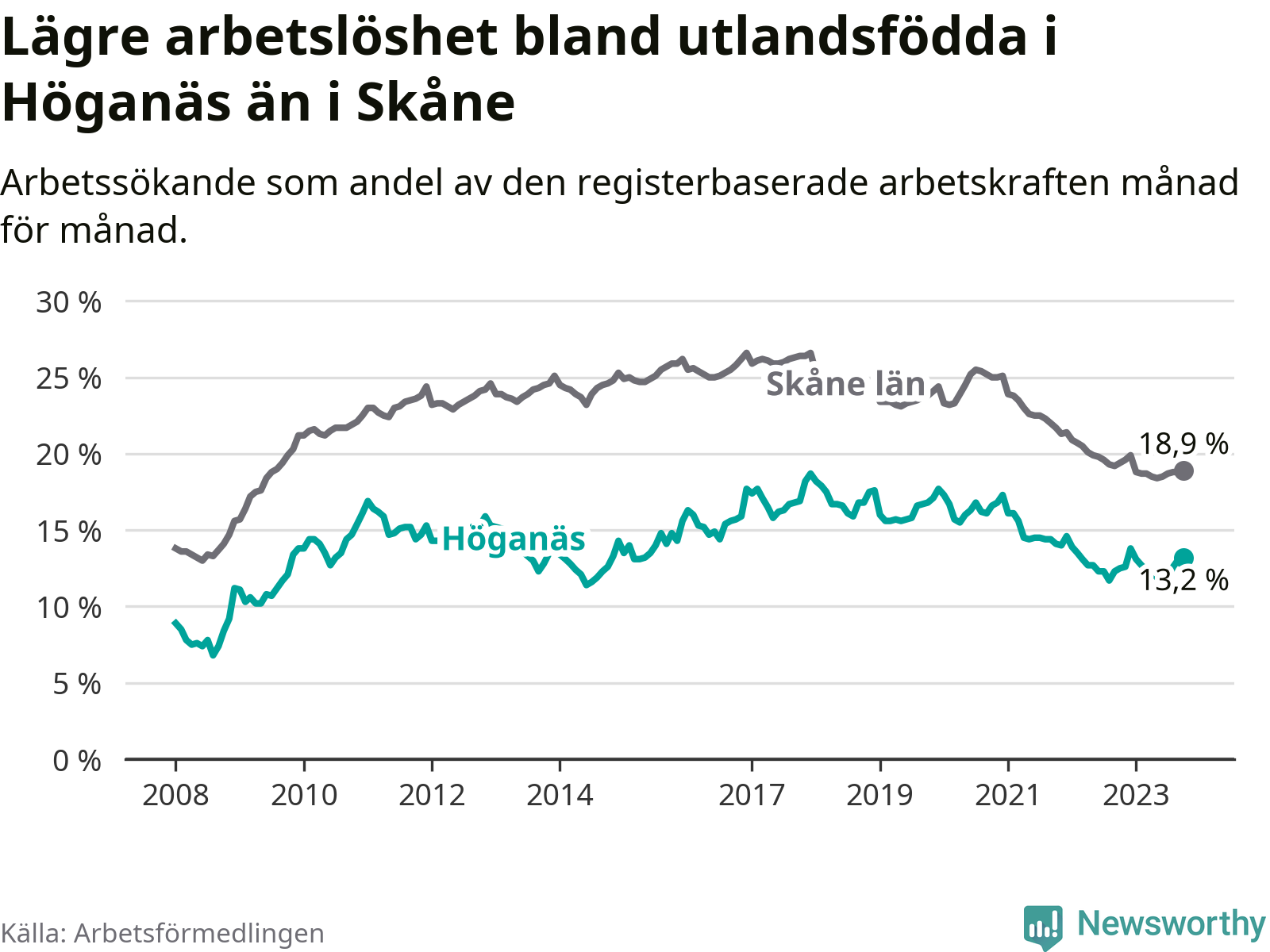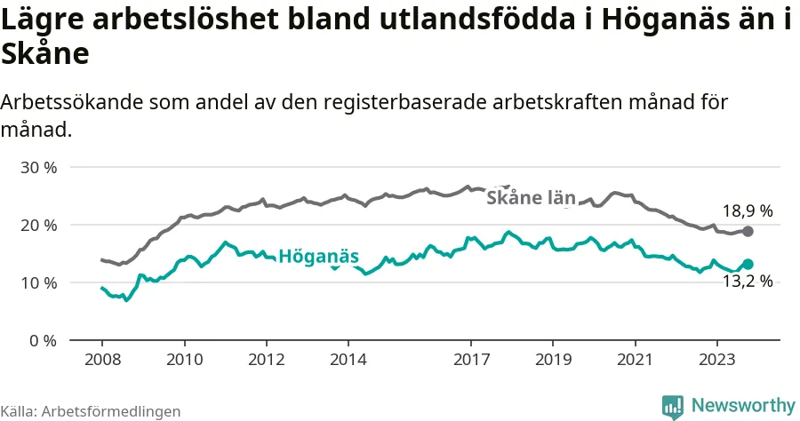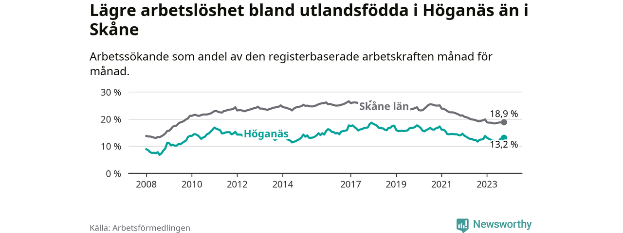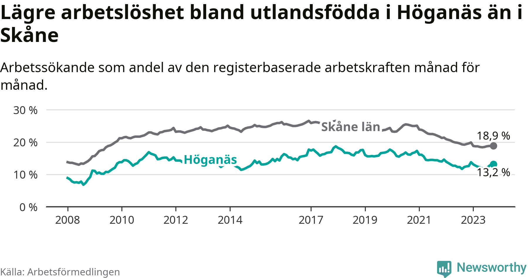Medan arbetslösheten bland utlandsfödda alltså ökar i Höganäs så minskar den i Skåne. Jämfört med oktober förra året har andelen arbetslösa utlandsfödda i länet minskat med 0,5 procentenheter (till 18,9 procent). Trots den senaste uppgången har Höganäs med andra ord fortfarande lägre arbetslöshet bland utlandsfödda än Skåne.