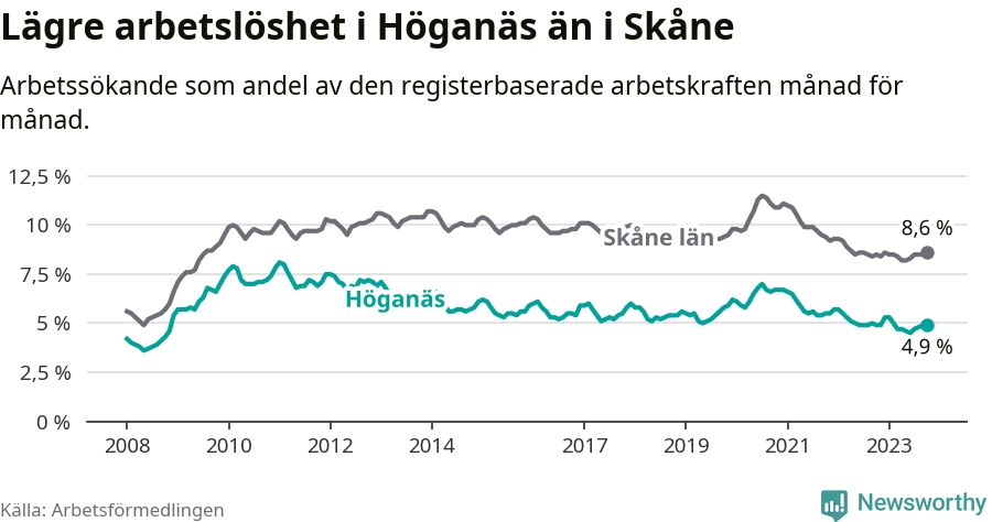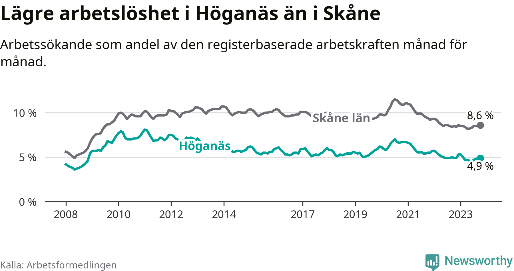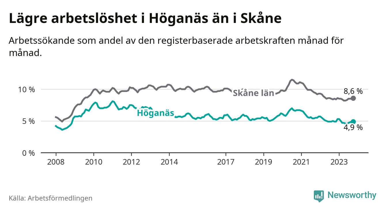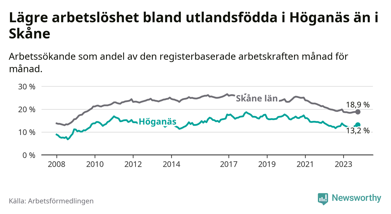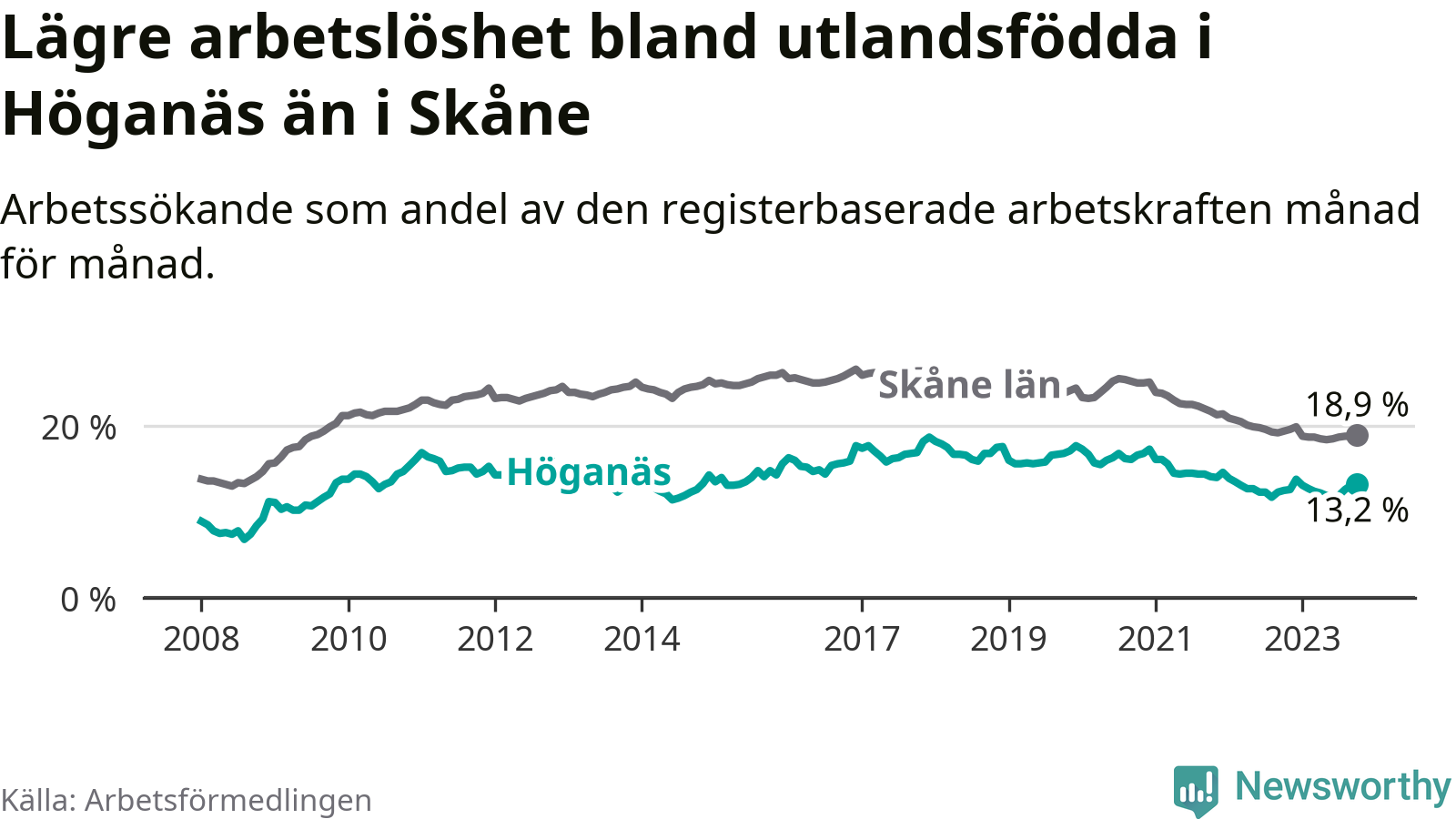 Medan arbetslösheten bland utlandsfödda alltså ökar i Höganäs så minskar den i Skåne. Jämfört med oktober förra året har andelen arbetslösa utlandsfödda i länet minskat med 0,5 procentenheter (till 18,9 procent). Trots den senaste uppgången har Höganäs med andra ord fortfarande lägre arbetslöshet bland utlandsfödda än Skåne.
