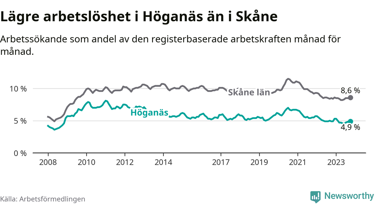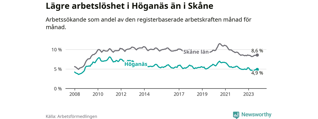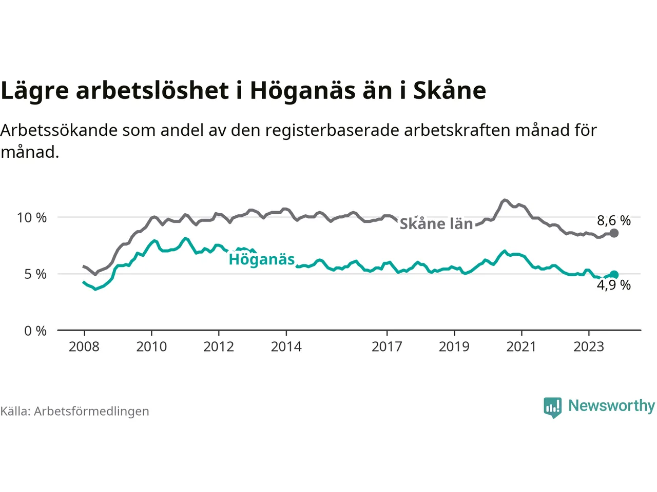Ny statistik från Arbetsförmedlingen visar på en oförändrad i arbetslöshet i Höganäs kommun. I Skåne däremot ökar arbetslösheten.