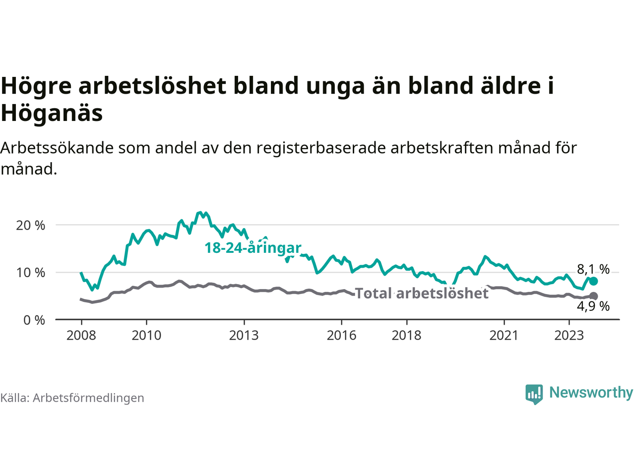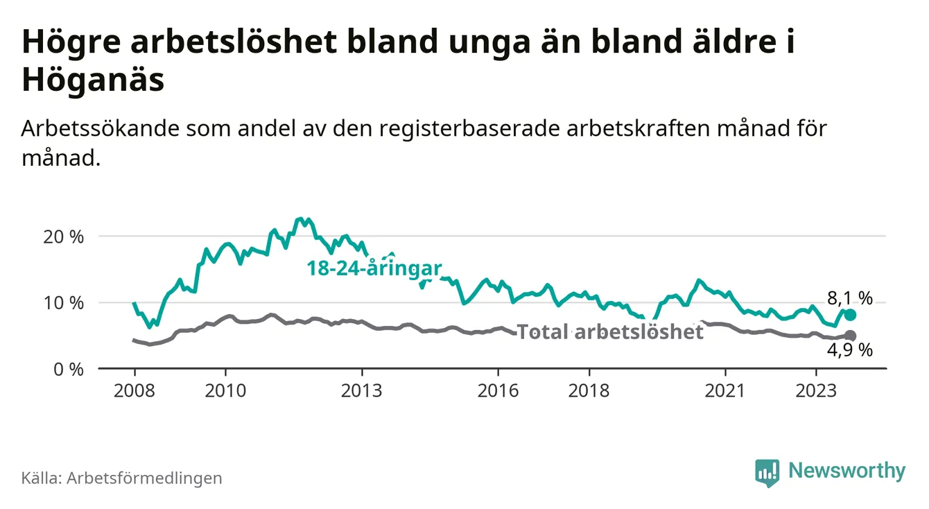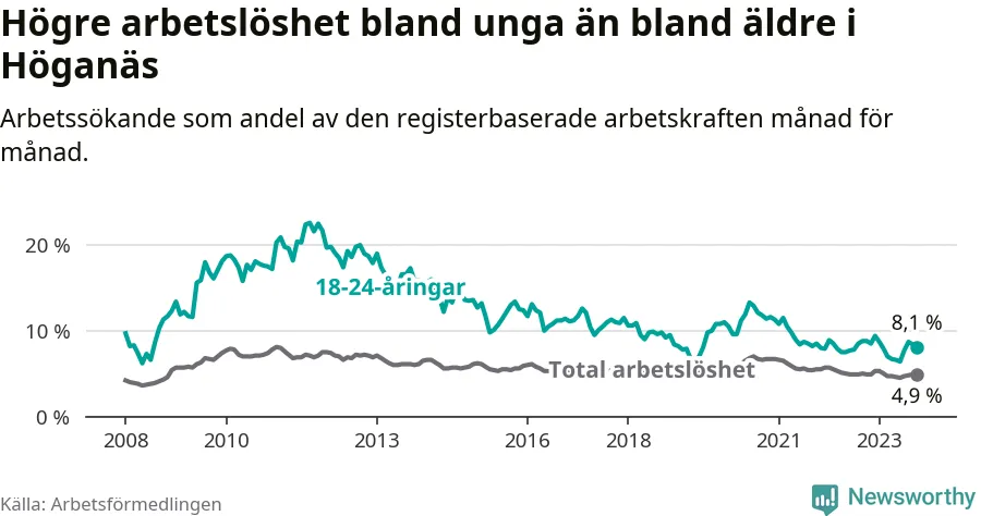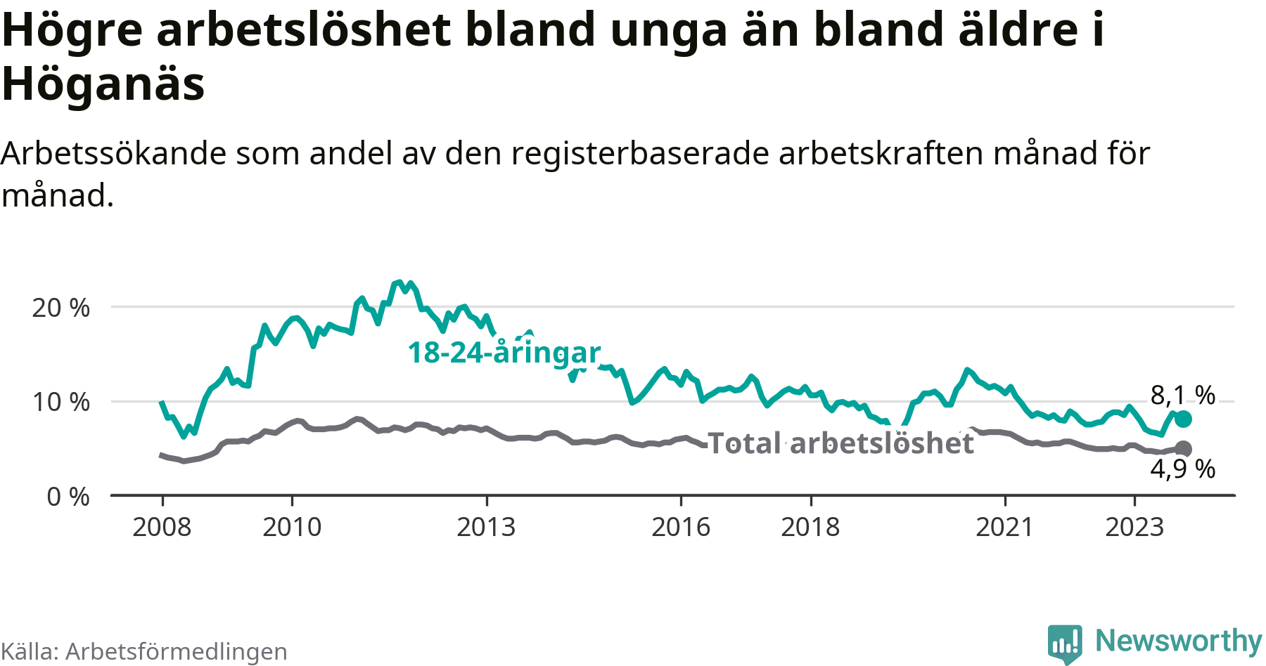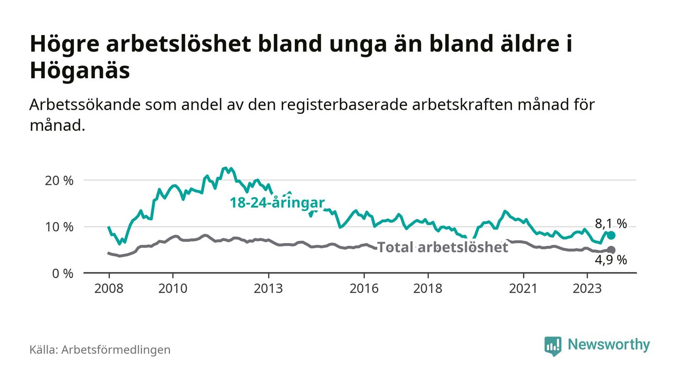 Till skillnad från den totala arbetslösheten sjunker arbetslösheten bland unga (−0,7 procentenheter). I oktober var 8,1 procent av 18–24-åringarna inskrivna som arbetssökande (motsvarande 80 personer). Mäter vi antalet inskrivna ser vi en ökning med ett personer på ett års sikt.