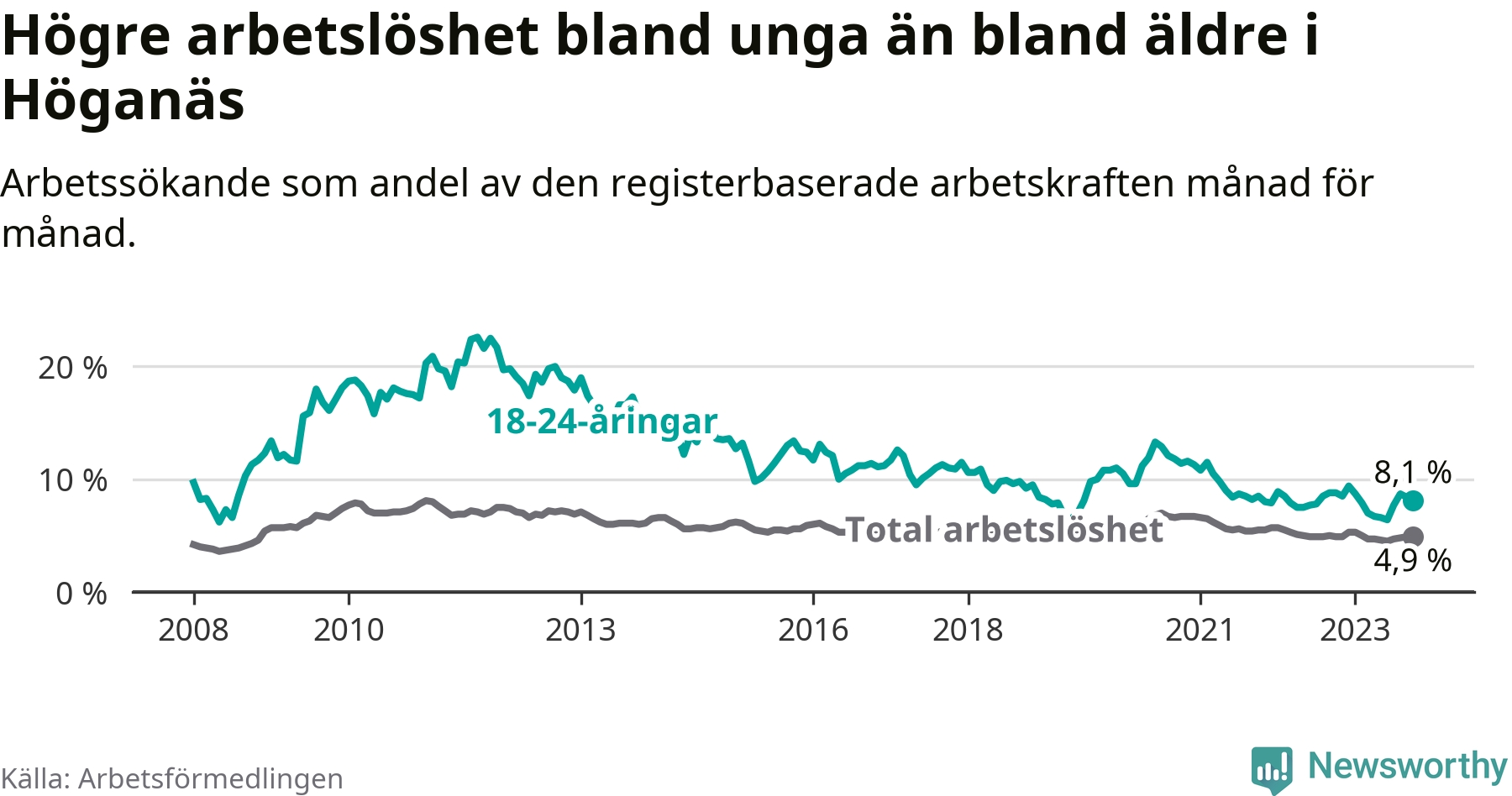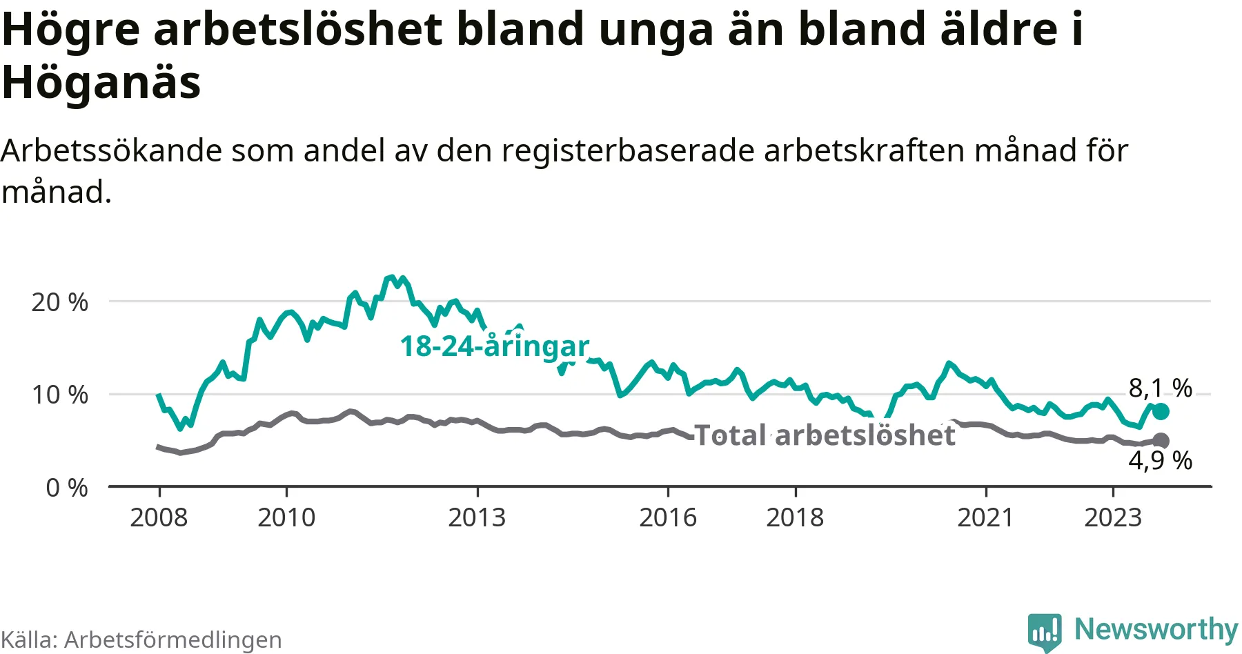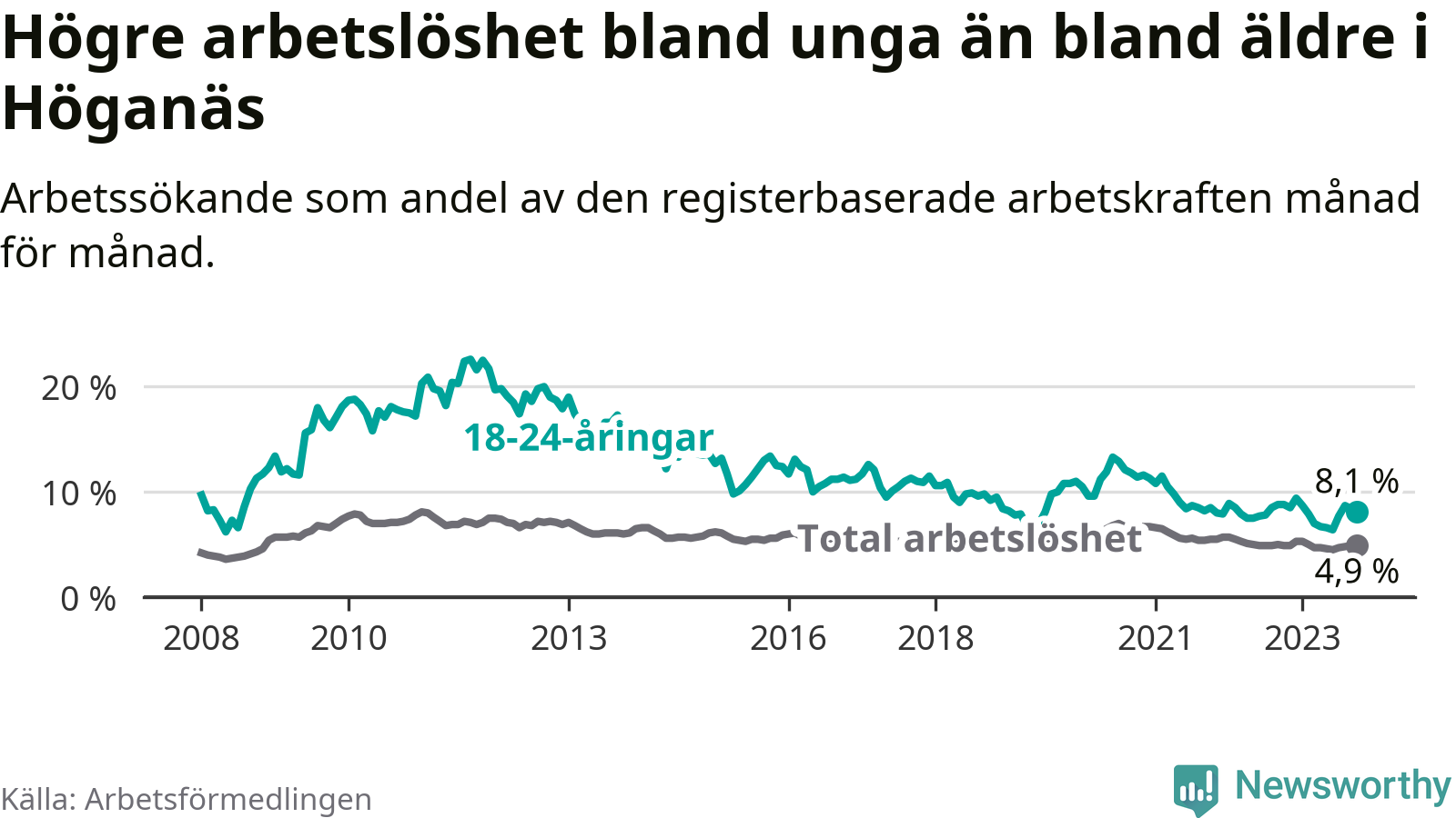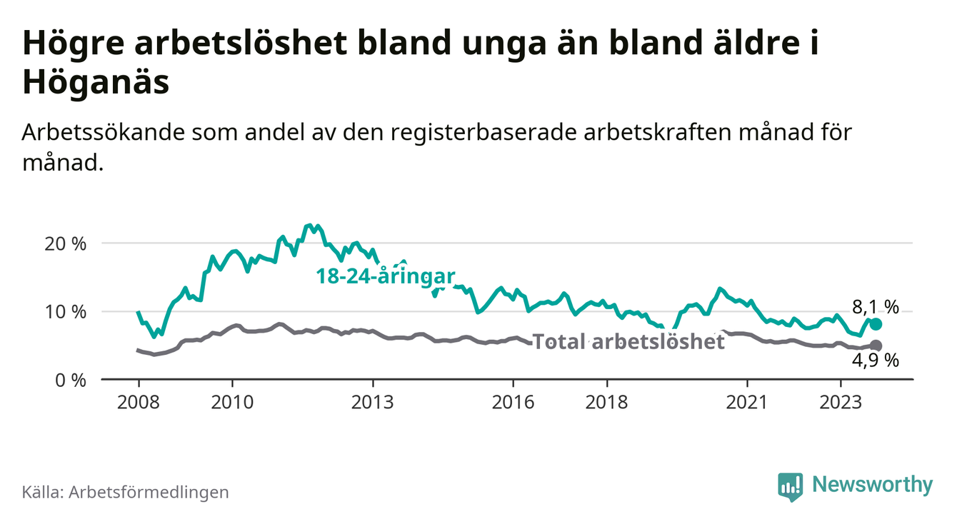 Till skillnad från den totala arbetslösheten sjunker arbetslösheten bland unga (−0,7 procentenheter). I oktober var 8,1 procent av 18–24-åringarna inskrivna som arbetssökande (motsvarande 80 personer). Mäter vi antalet inskrivna ser vi en ökning med ett personer på ett års sikt.