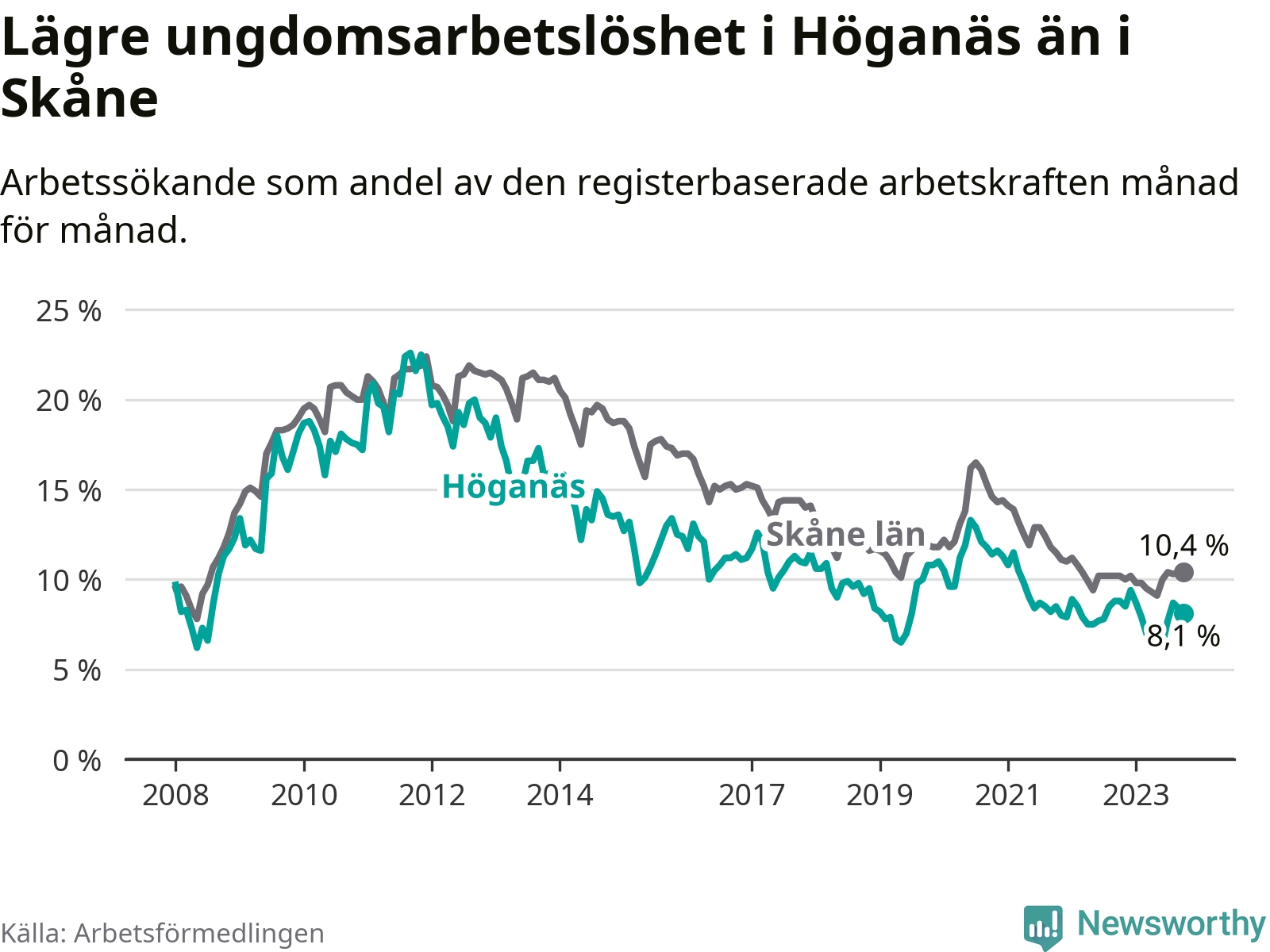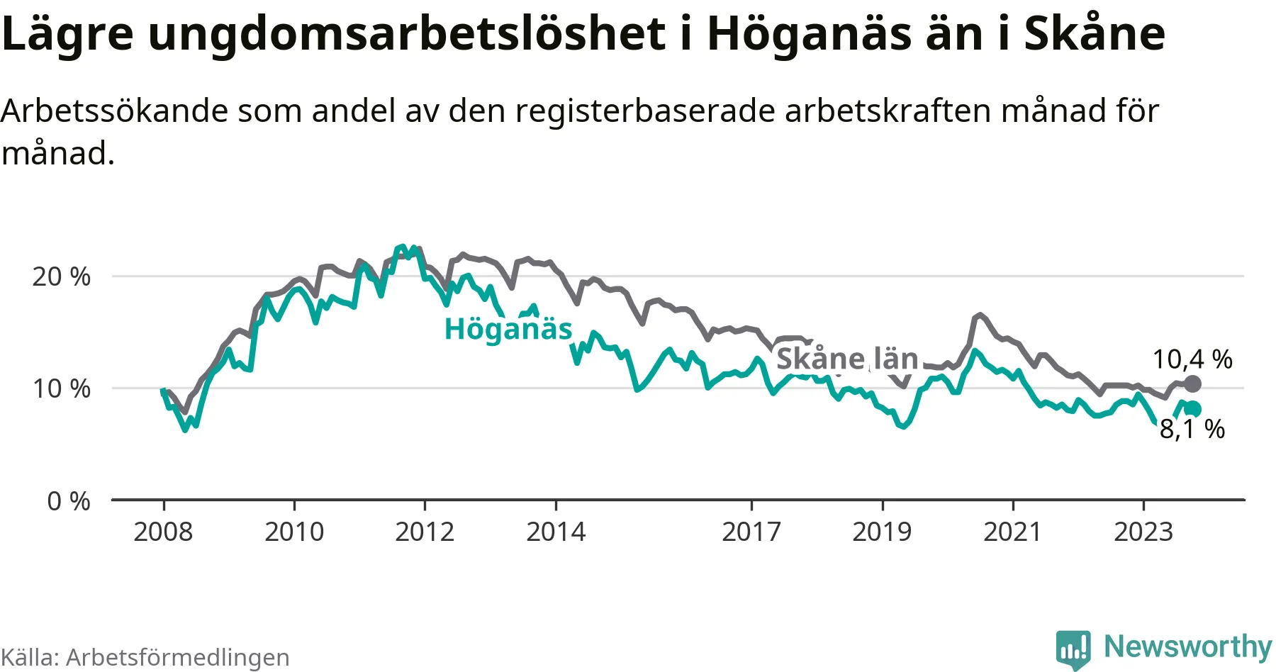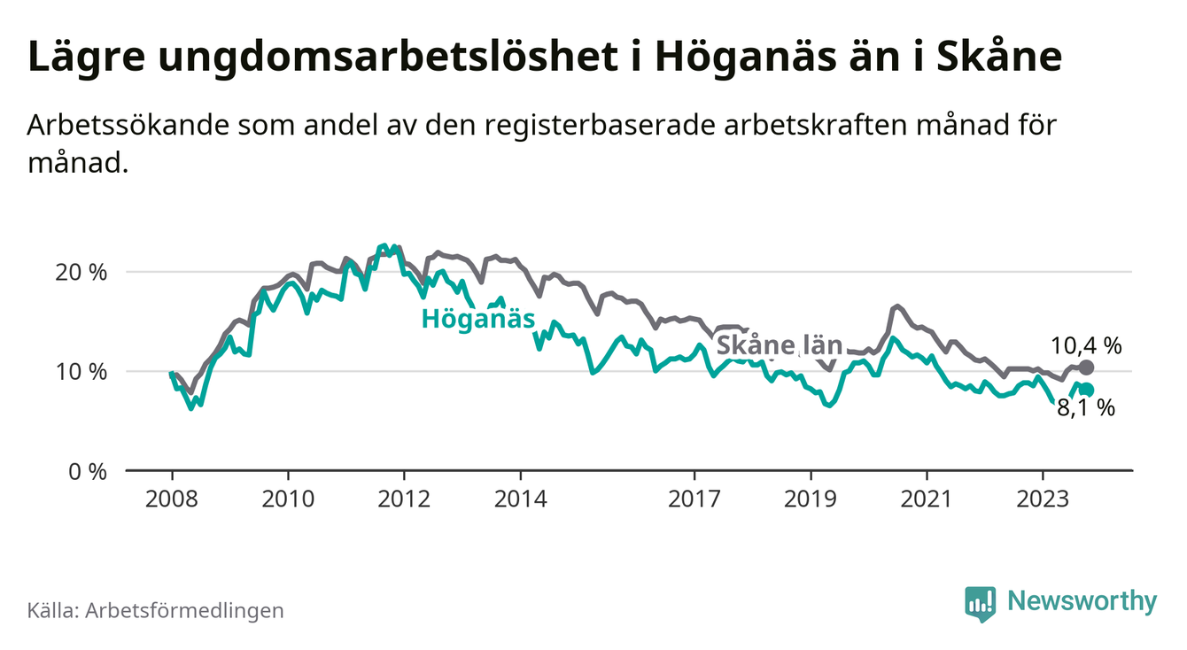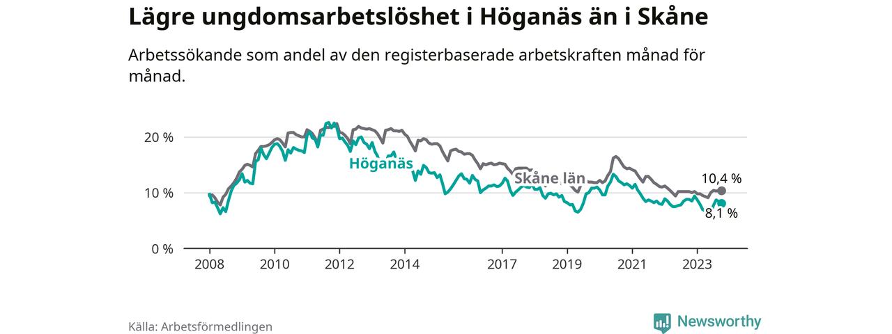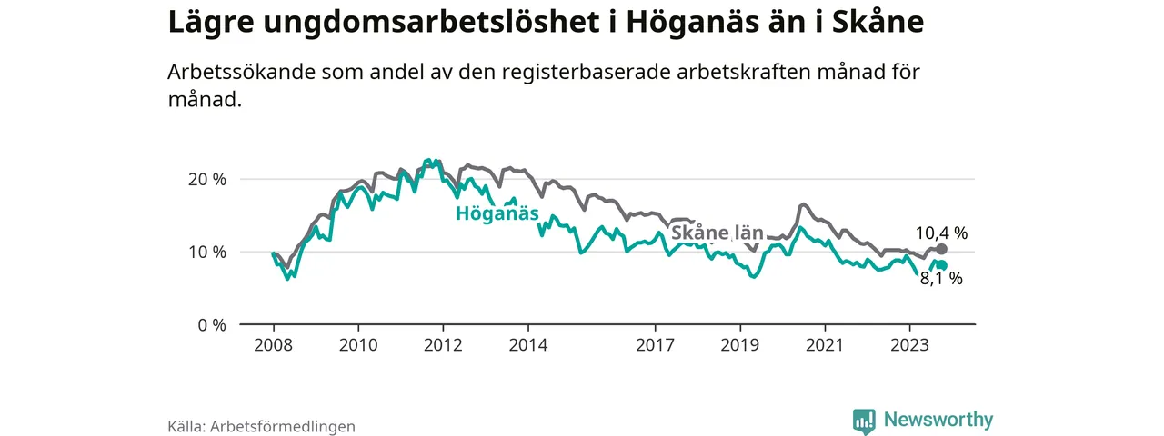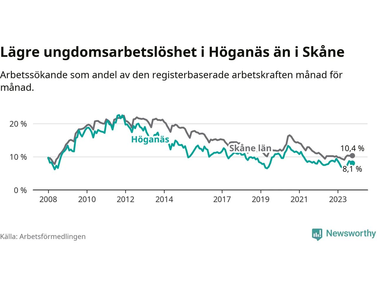 Precis som den totala arbetslösheten ligger ungdomsarbetslösheten i Höganäs lägre än i Skåne som helhet. Skillnaden mellan kommunen och länet är 2,3 procentenheter.