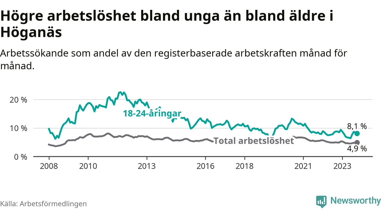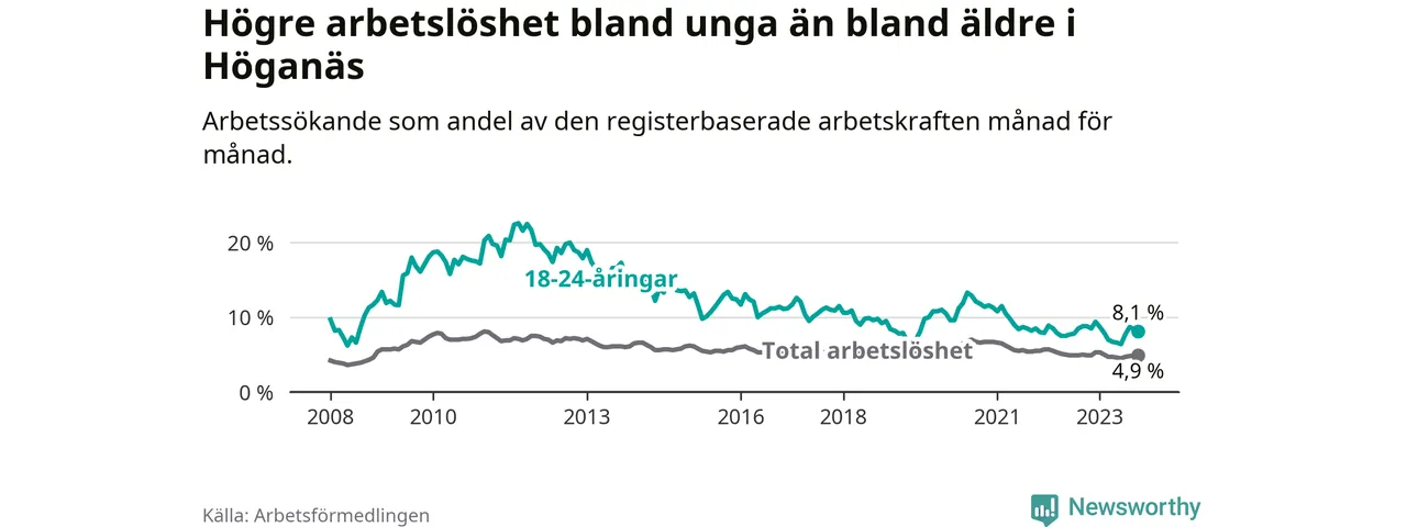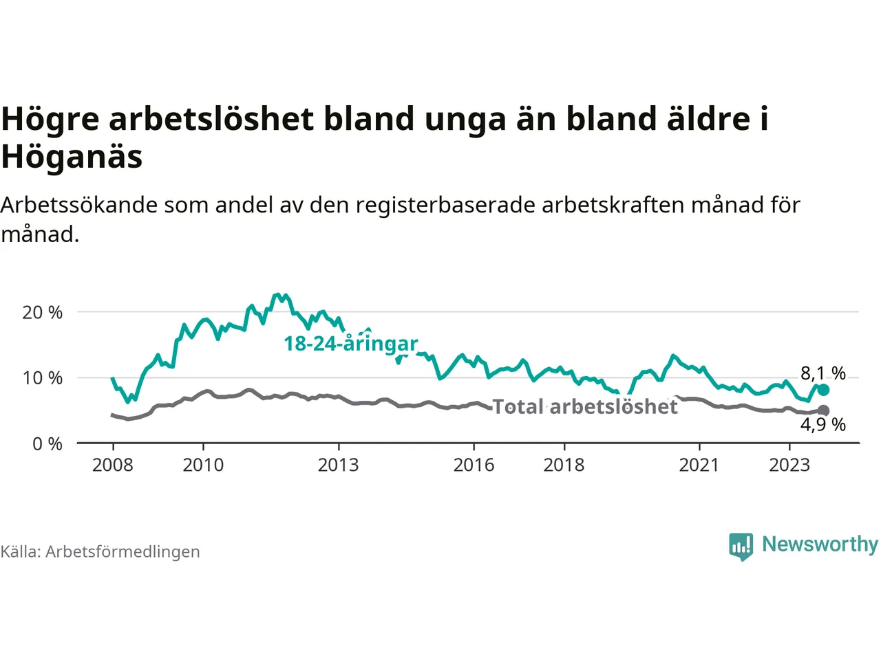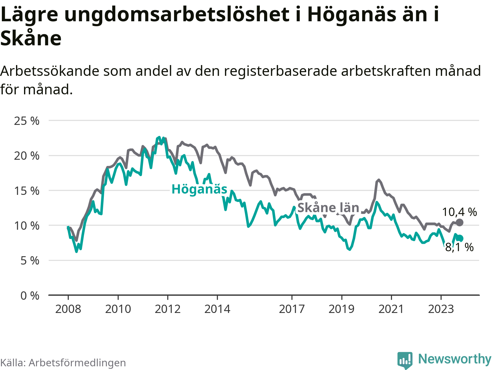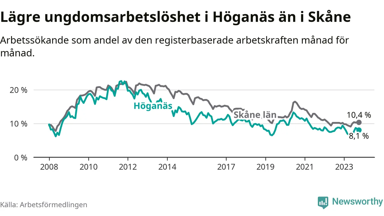 Precis som den totala arbetslösheten ligger ungdomsarbetslösheten i Höganäs lägre än i Skåne som helhet. Skillnaden mellan kommunen och länet är 2,3 procentenheter.