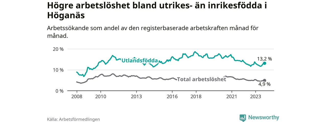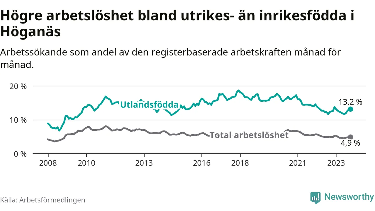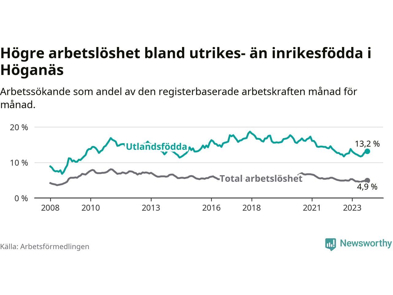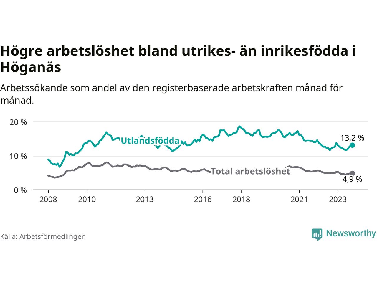 Arbetslösheten bland utlandsfödda var 13,2 procent i Höganäs under oktober månad, motsvarande 286 av 2 167 personer. Det är 0,7 procentenheter fler än vid samma tidpunkt i fjol (+40 om man räknar personer).