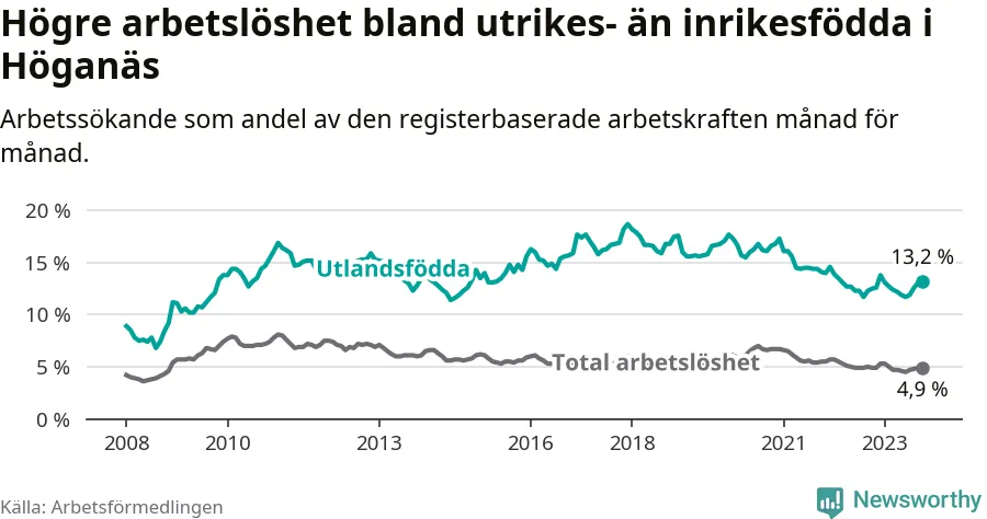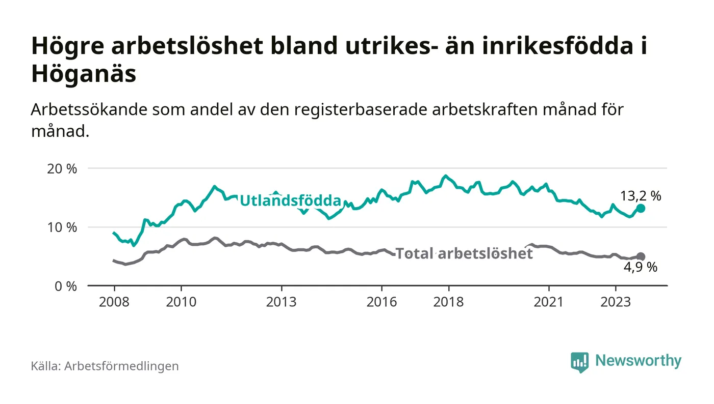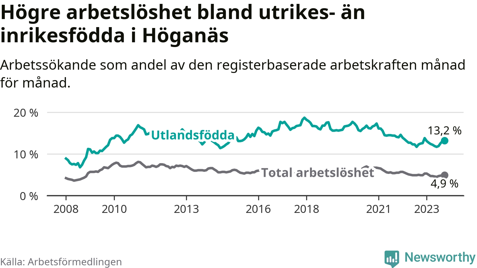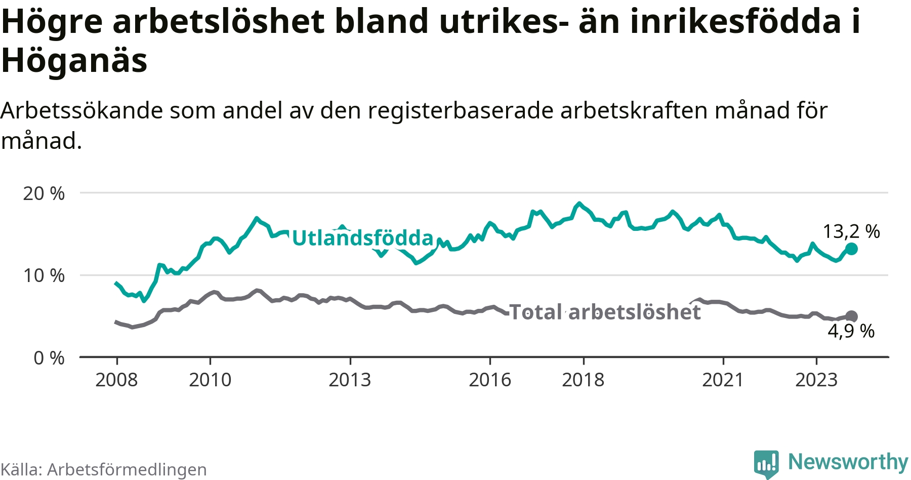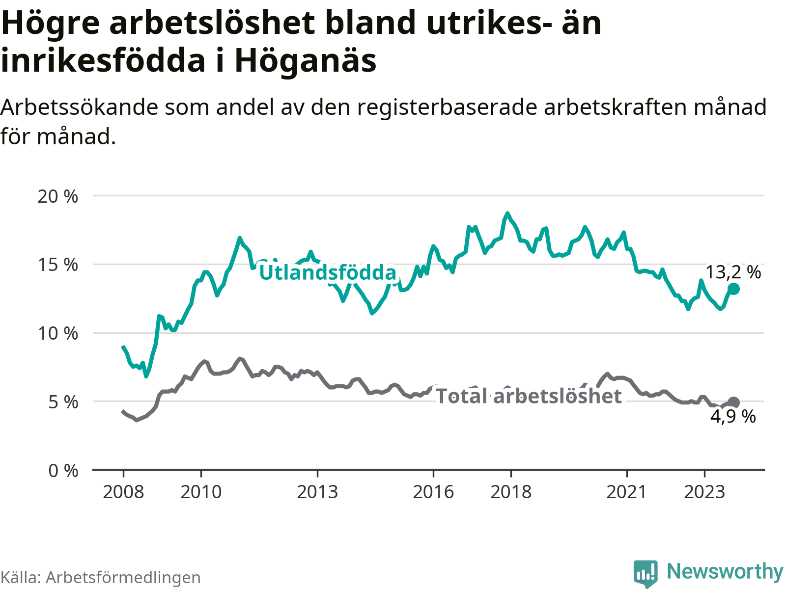 Arbetslösheten bland utlandsfödda var 13,2 procent i Höganäs under oktober månad, motsvarande 286 av 2 167 personer. Det är 0,7 procentenheter fler än vid samma tidpunkt i fjol (+40 om man räknar personer).