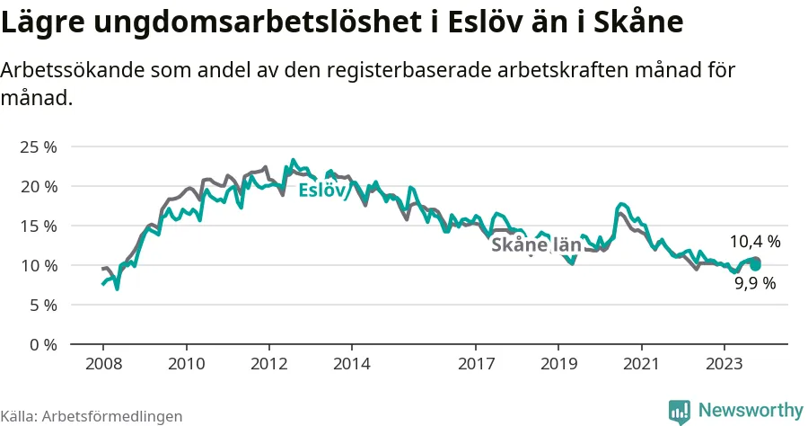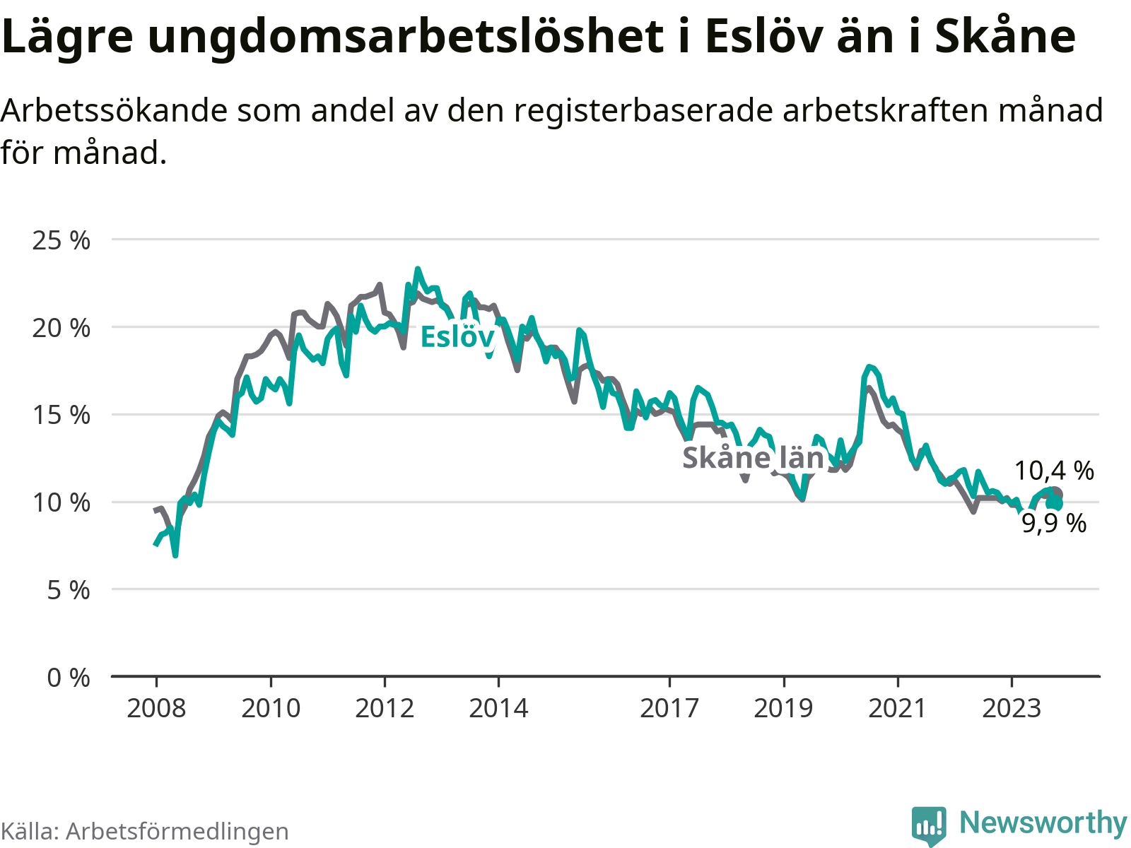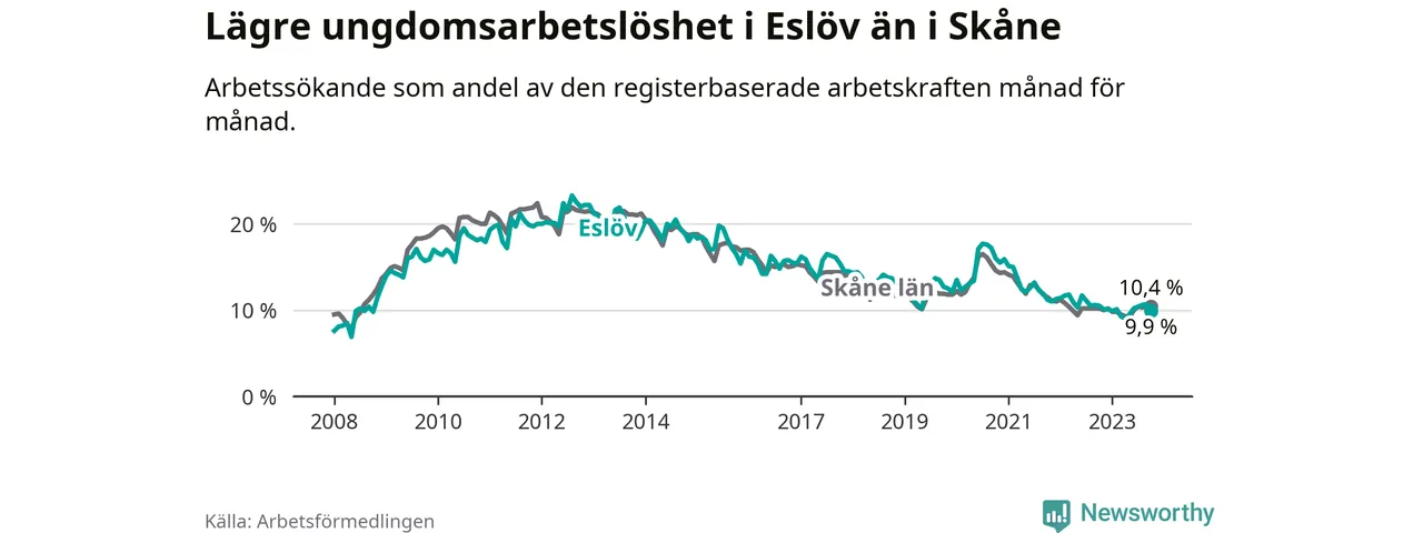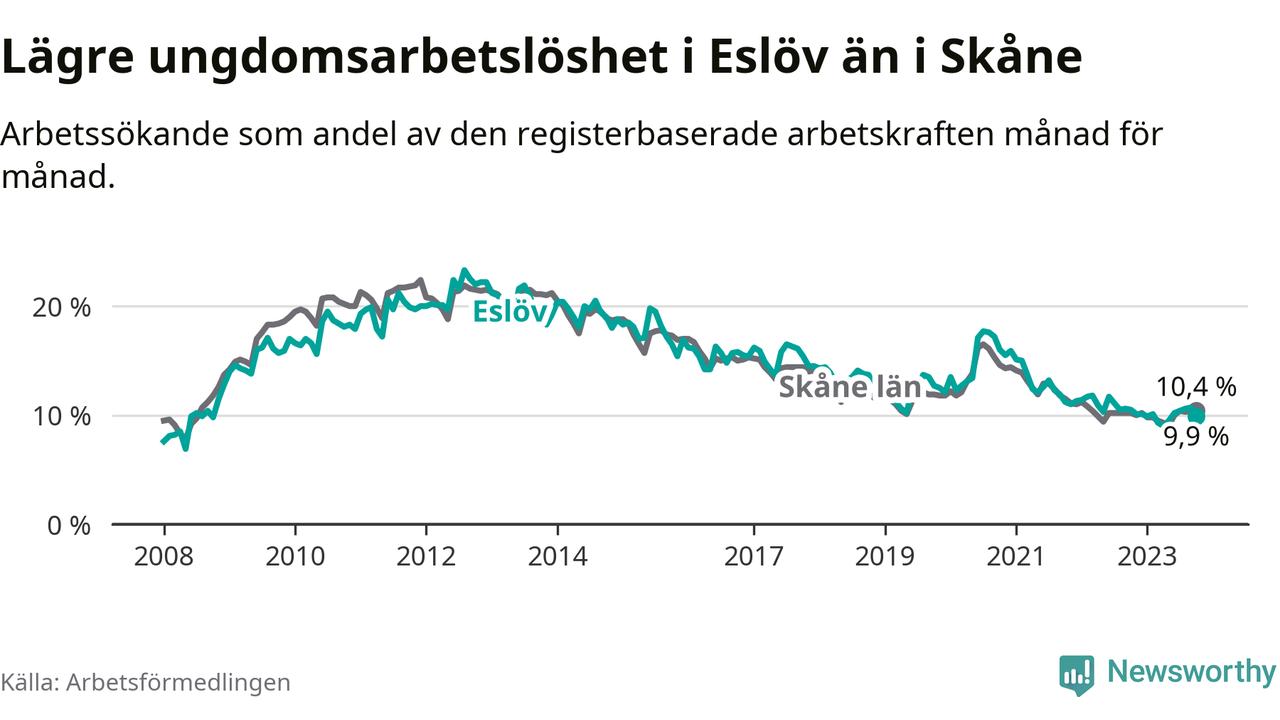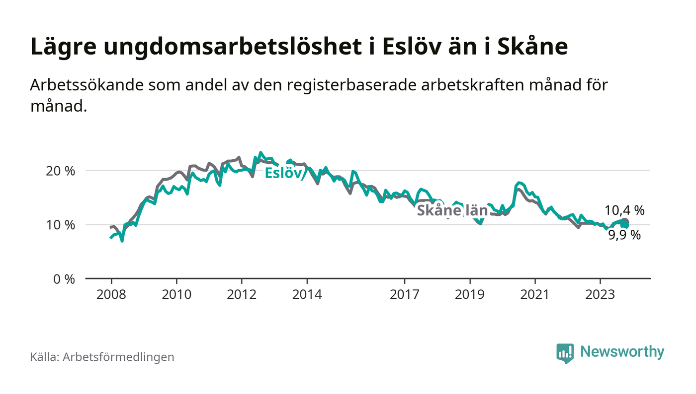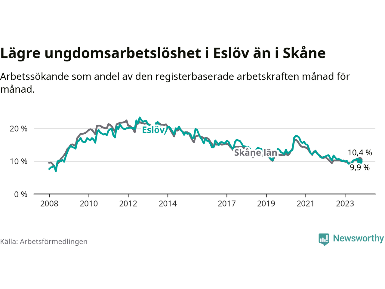 Precis som den totala arbetslösheten ligger ungdomsarbetslösheten i Eslöv lägre än i Skåne som helhet. Skillnaden mellan kommunen och länet är 0,5 procentenheter.