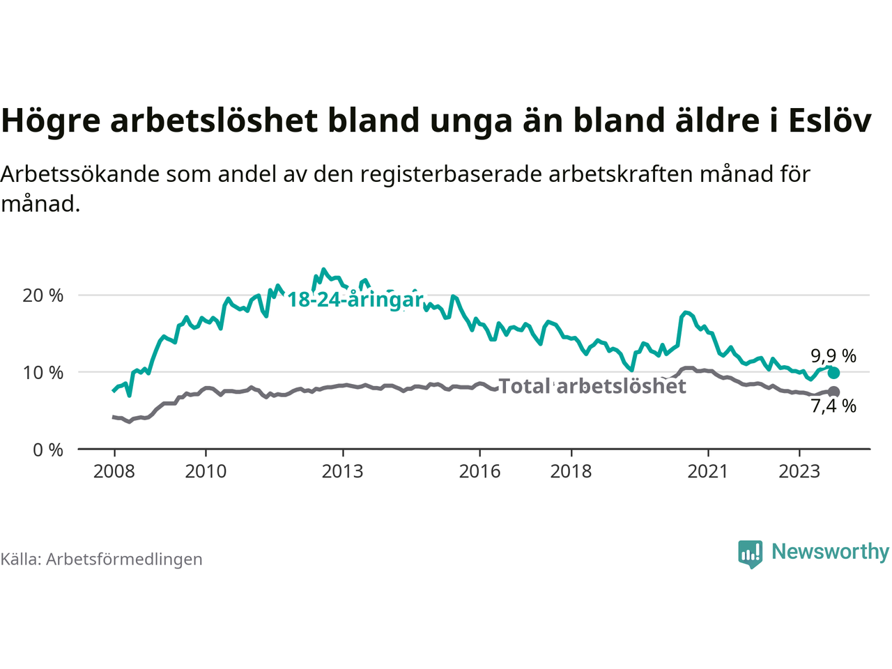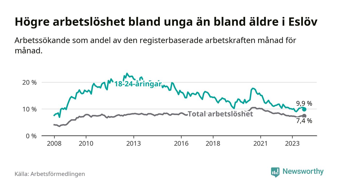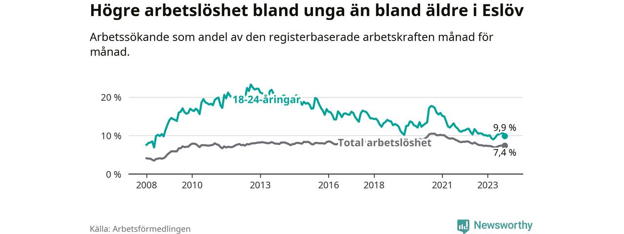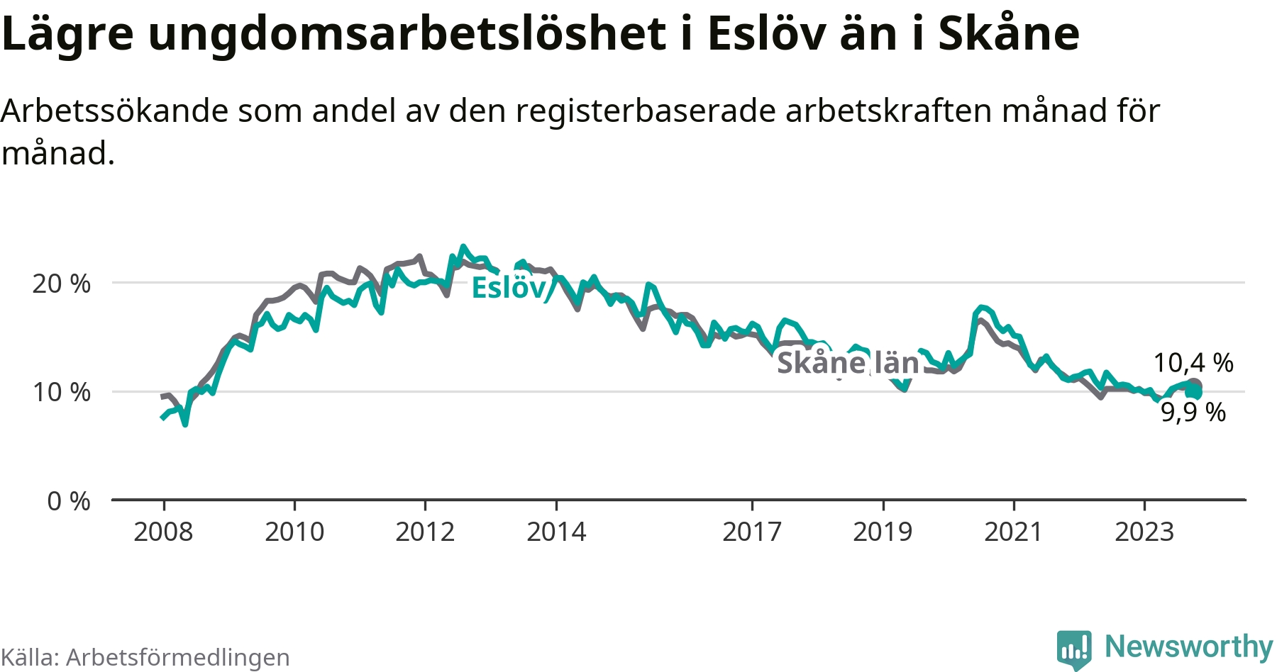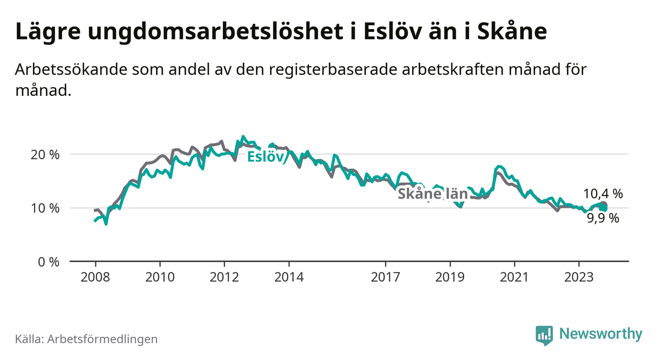 Precis som den totala arbetslösheten ligger ungdomsarbetslösheten i Eslöv lägre än i Skåne som helhet. Skillnaden mellan kommunen och länet är 0,5 procentenheter.