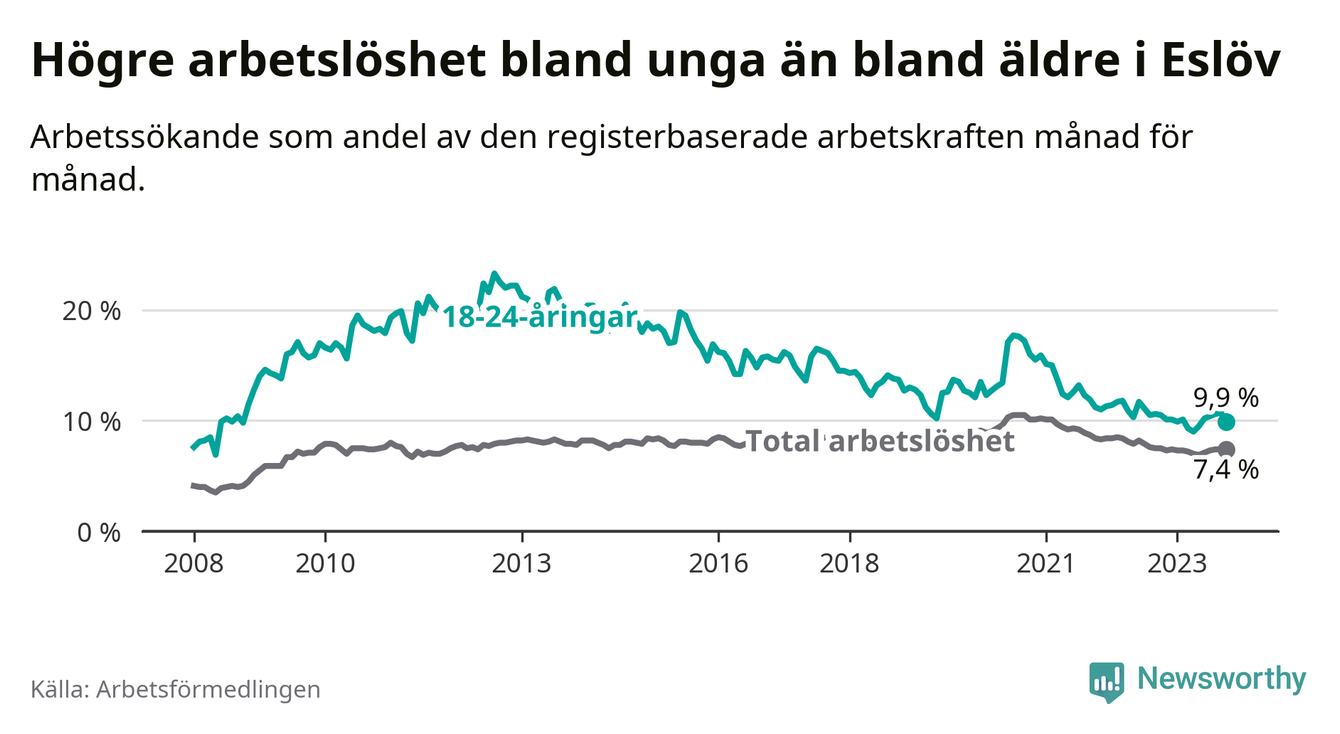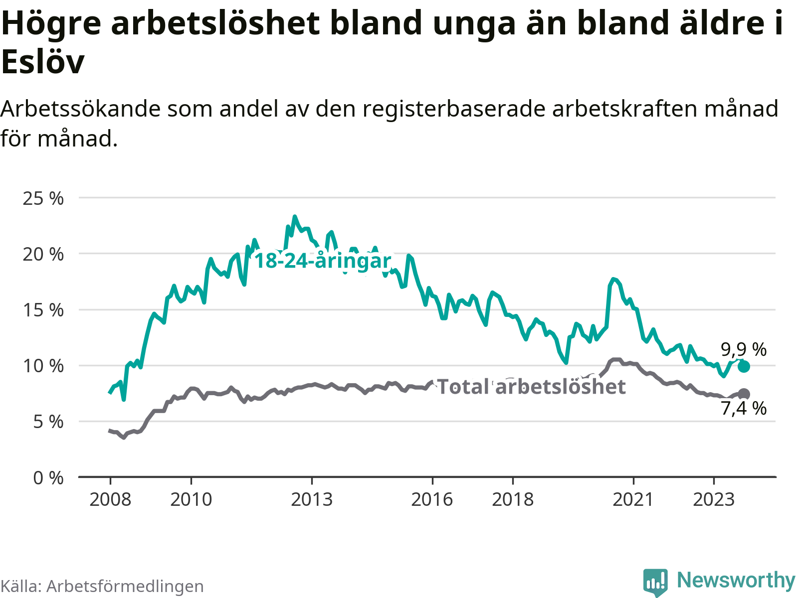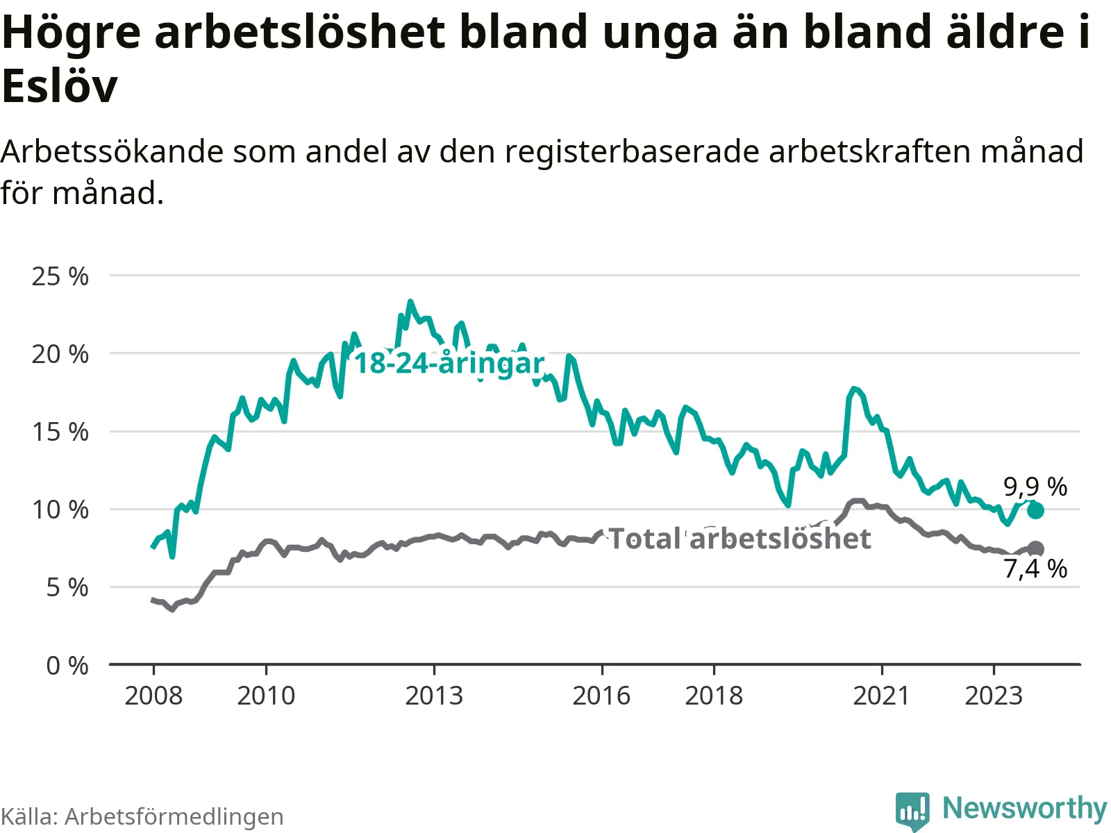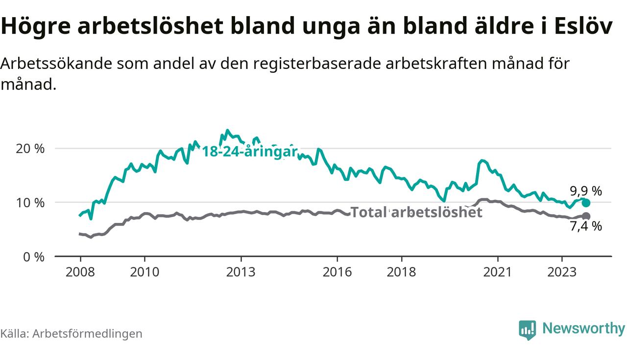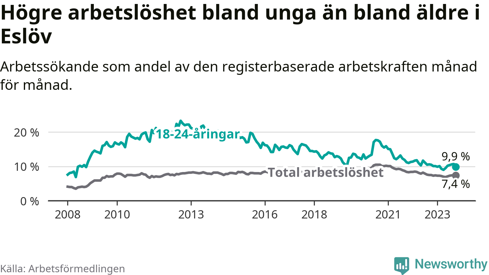 Precis som den totala arbetslösheten ligger ungdomsarbetslösheten i Eslöv lägre än i Skåne som helhet. Skillnaden mellan kommunen och länet är 0,5 procentenheter.