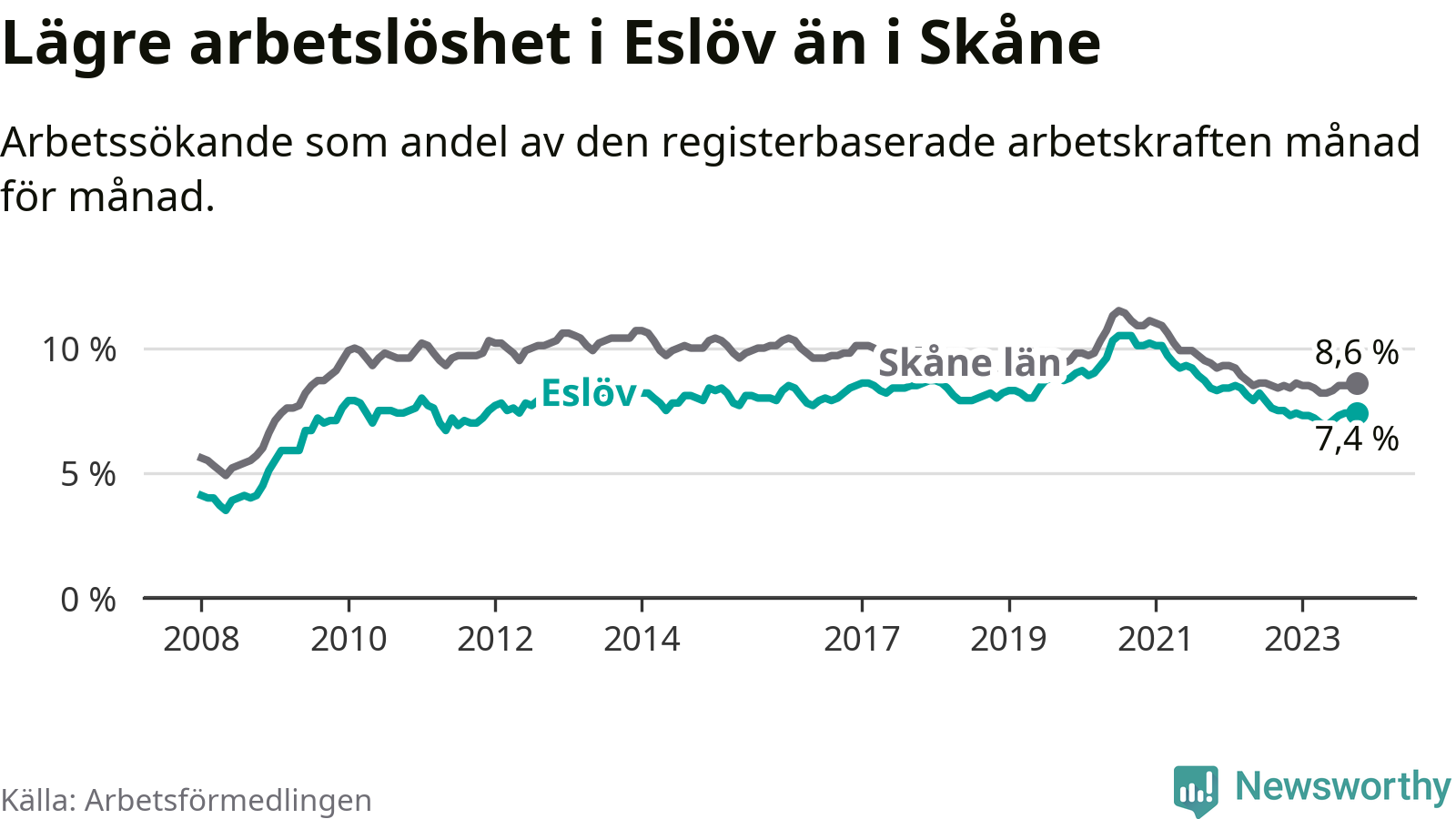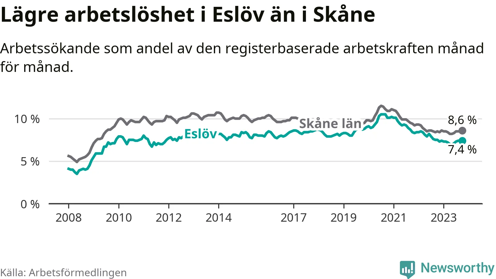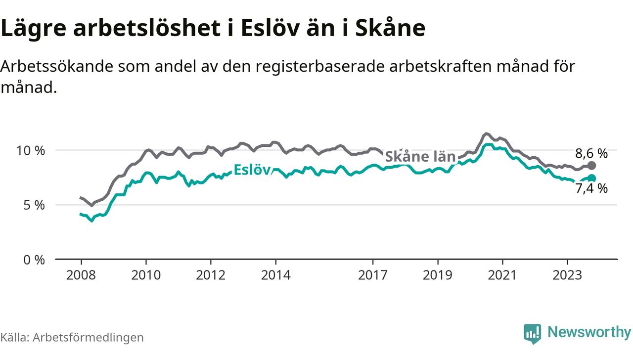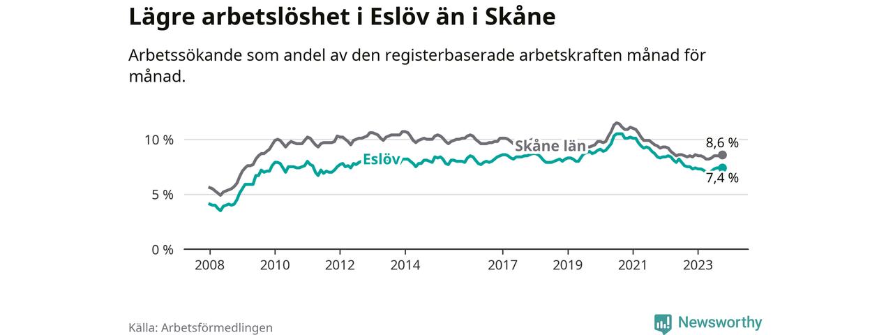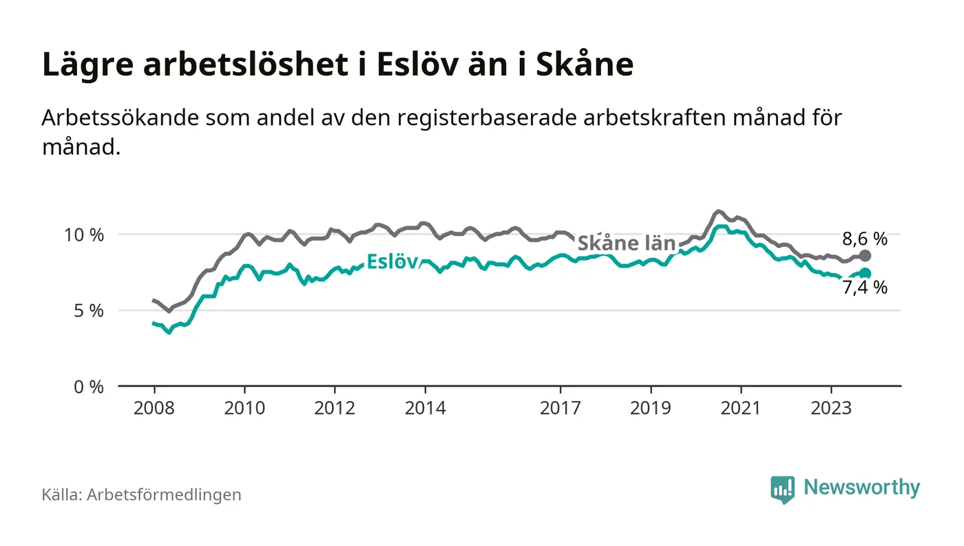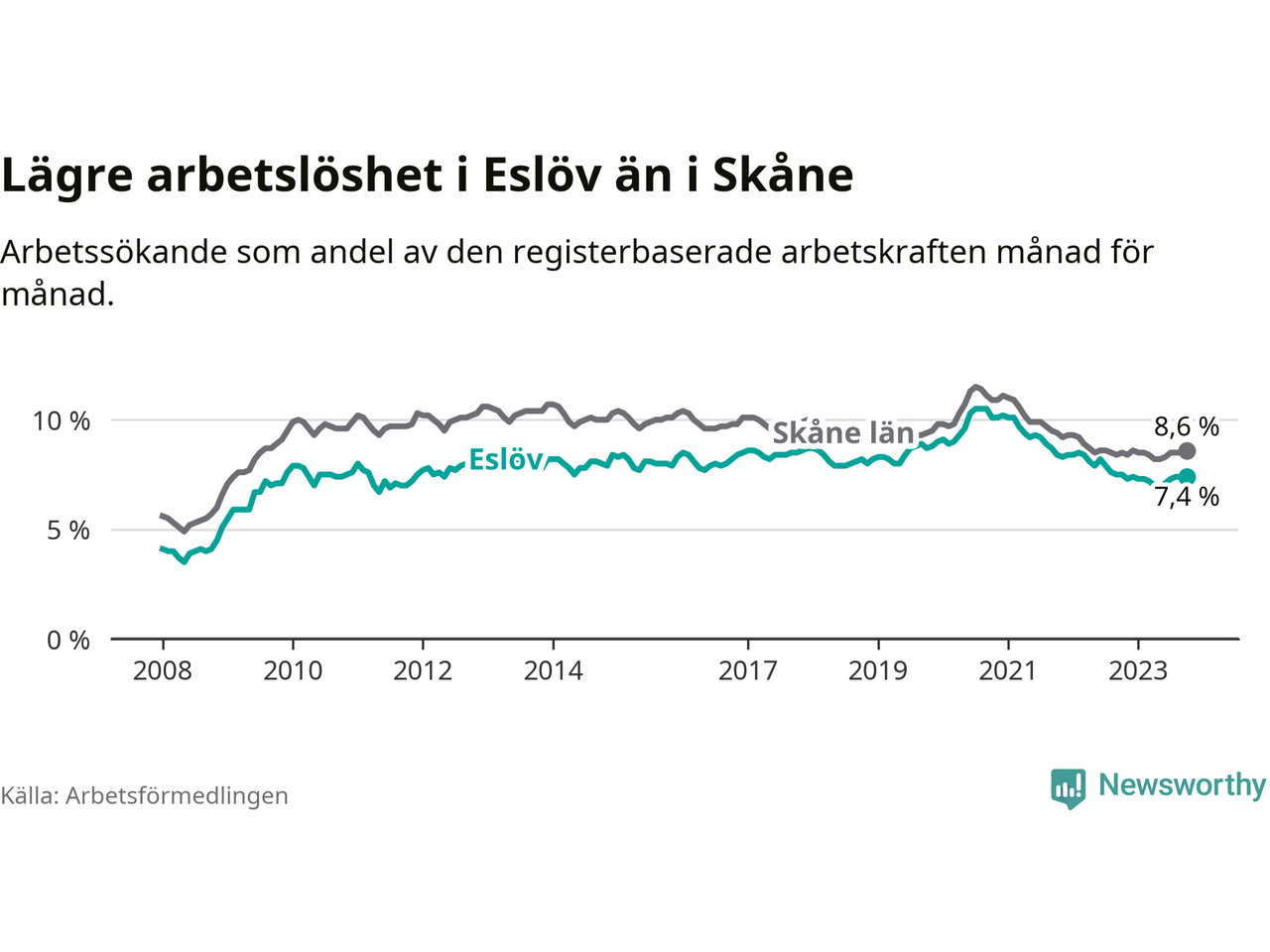 Det är 30:e månaden i följd som arbetslösheten i Eslöv är lägre än den var under samma tidpunkt året innan. Sedan april 2021 har arbetslösheten gått ner från 9,4 till 7,4 procent.