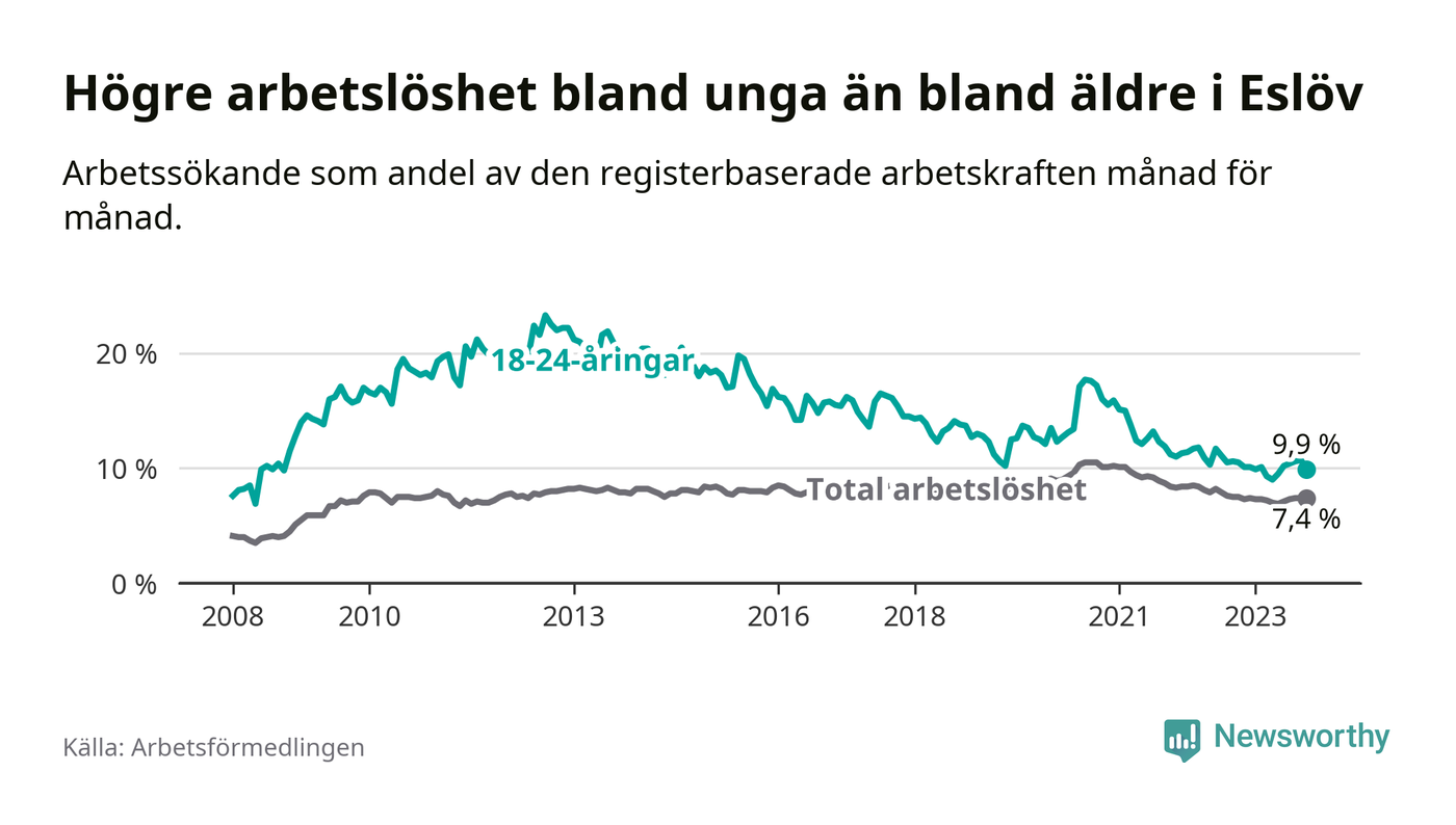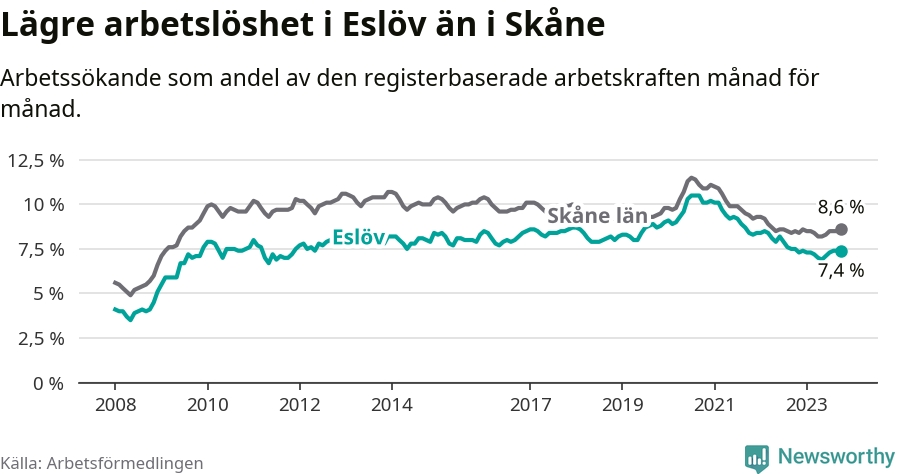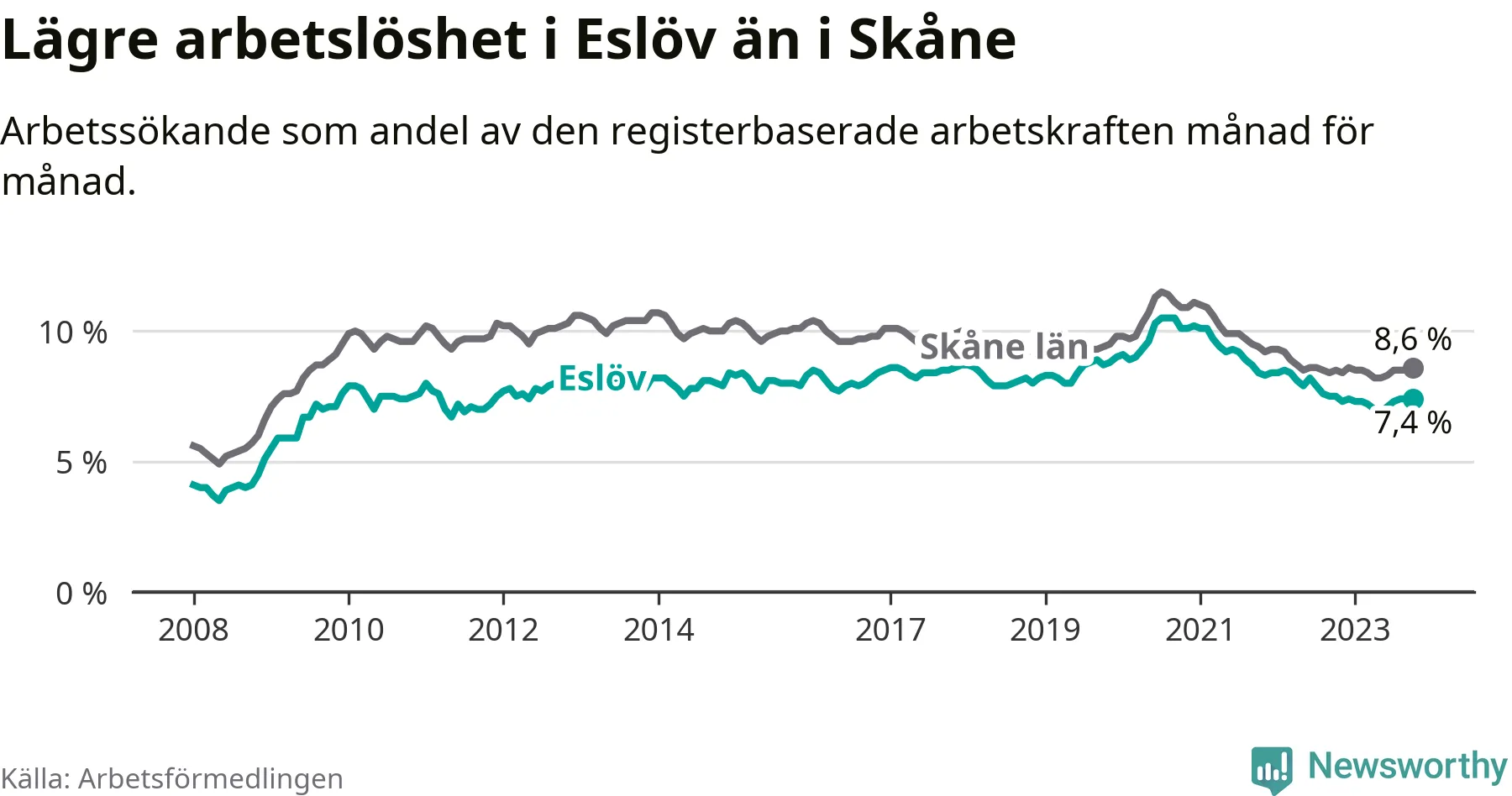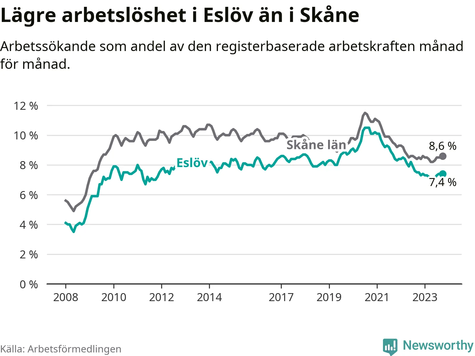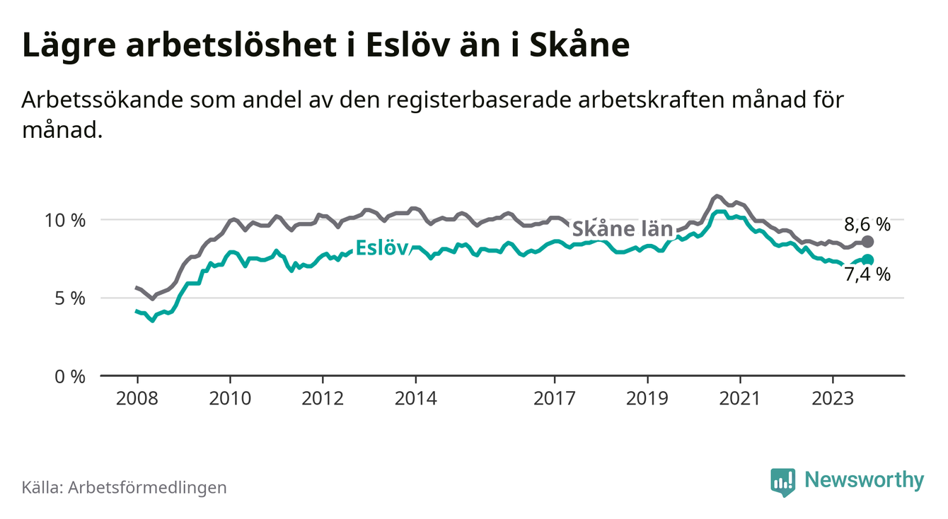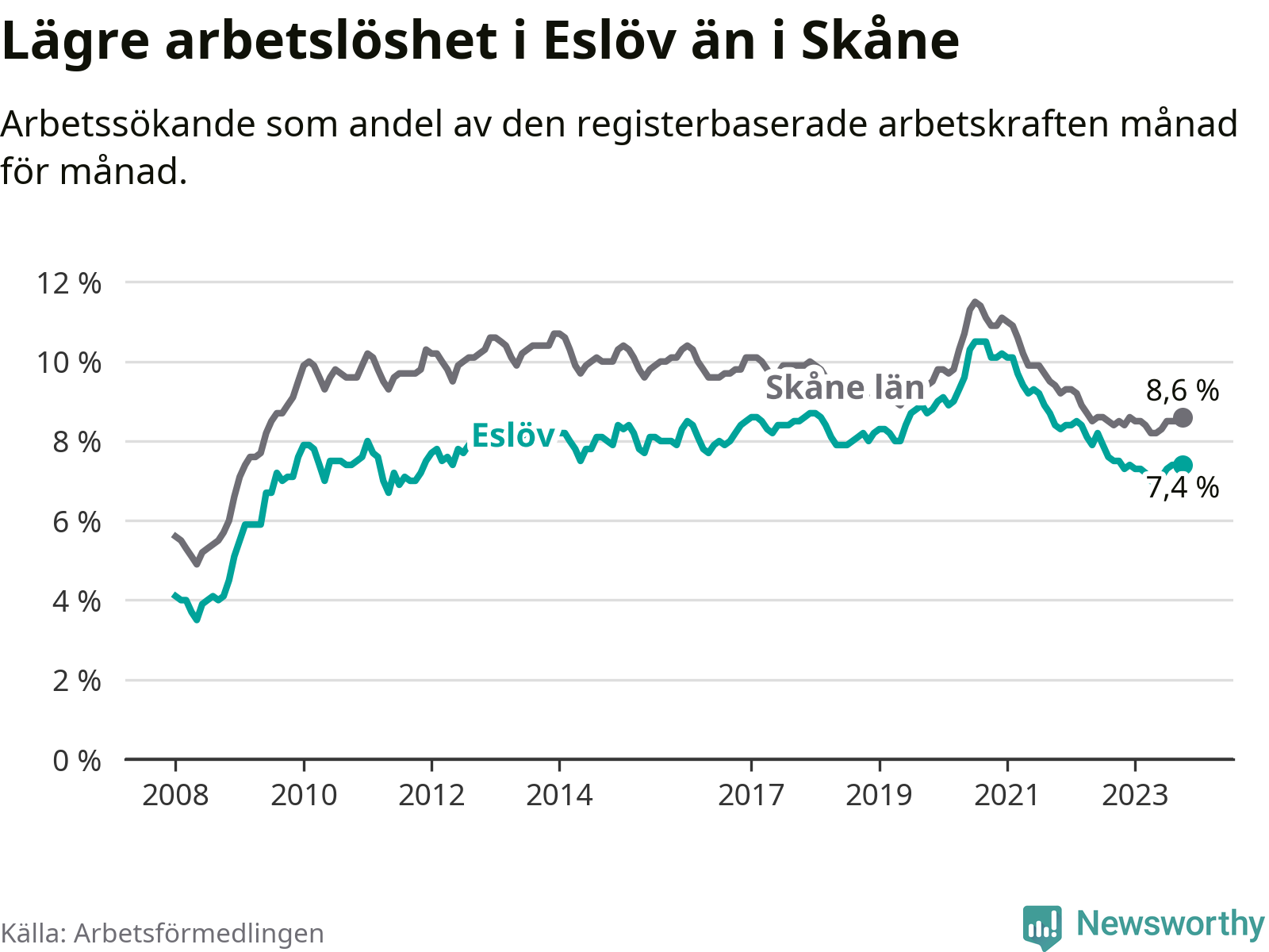 Det är 30:e månaden i följd som arbetslösheten i Eslöv är lägre än den var under samma tidpunkt året innan. Sedan april 2021 har arbetslösheten gått ner från 9,4 till 7,4 procent.
