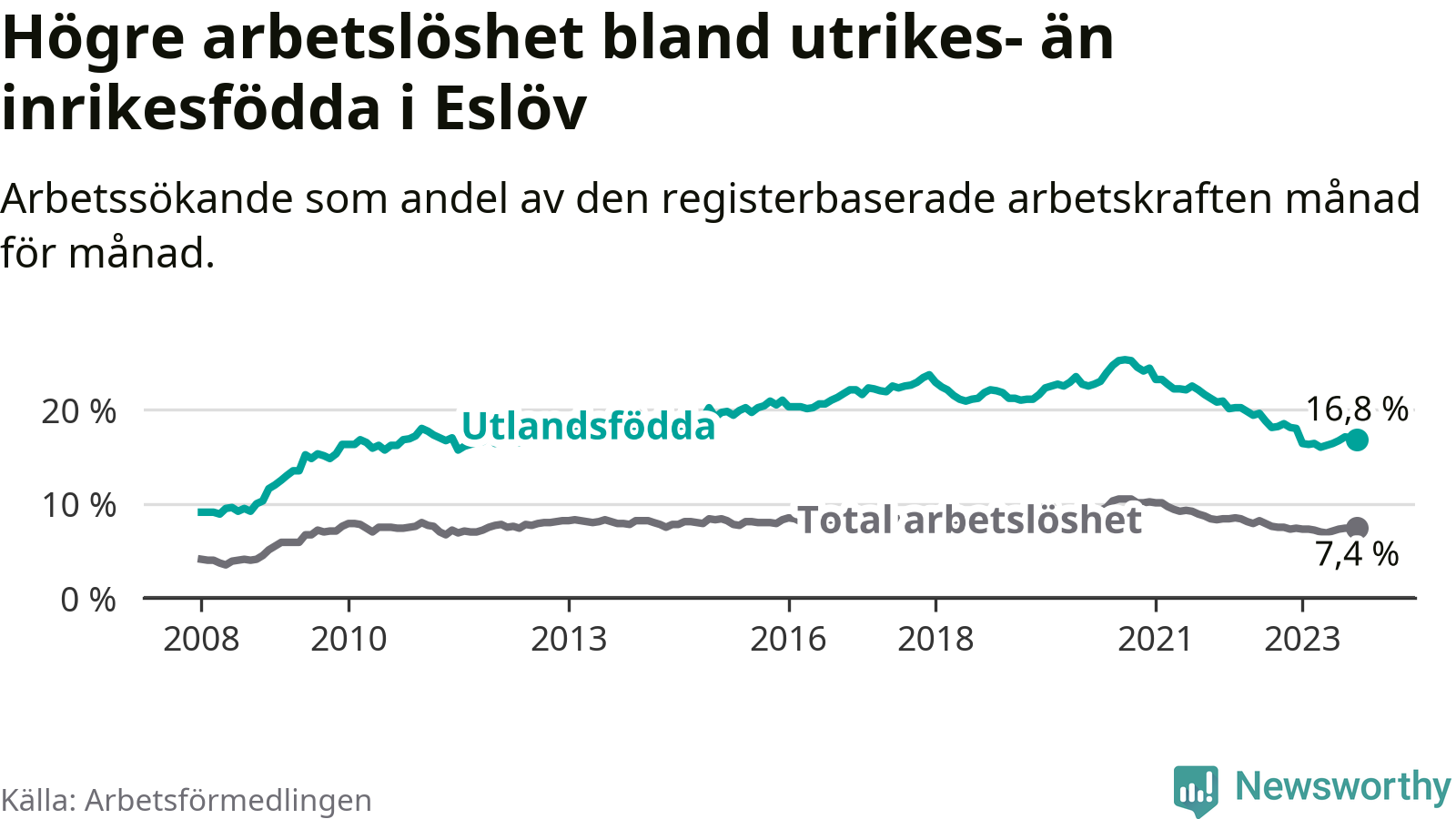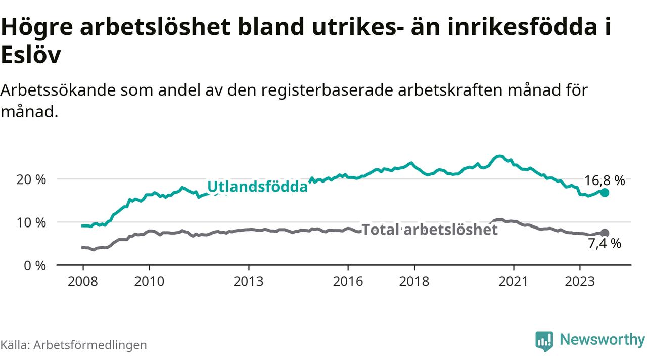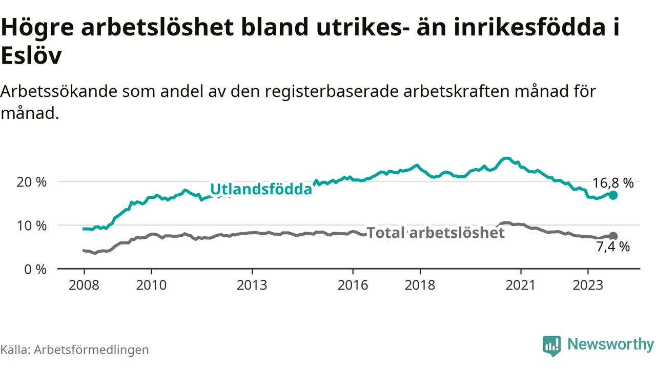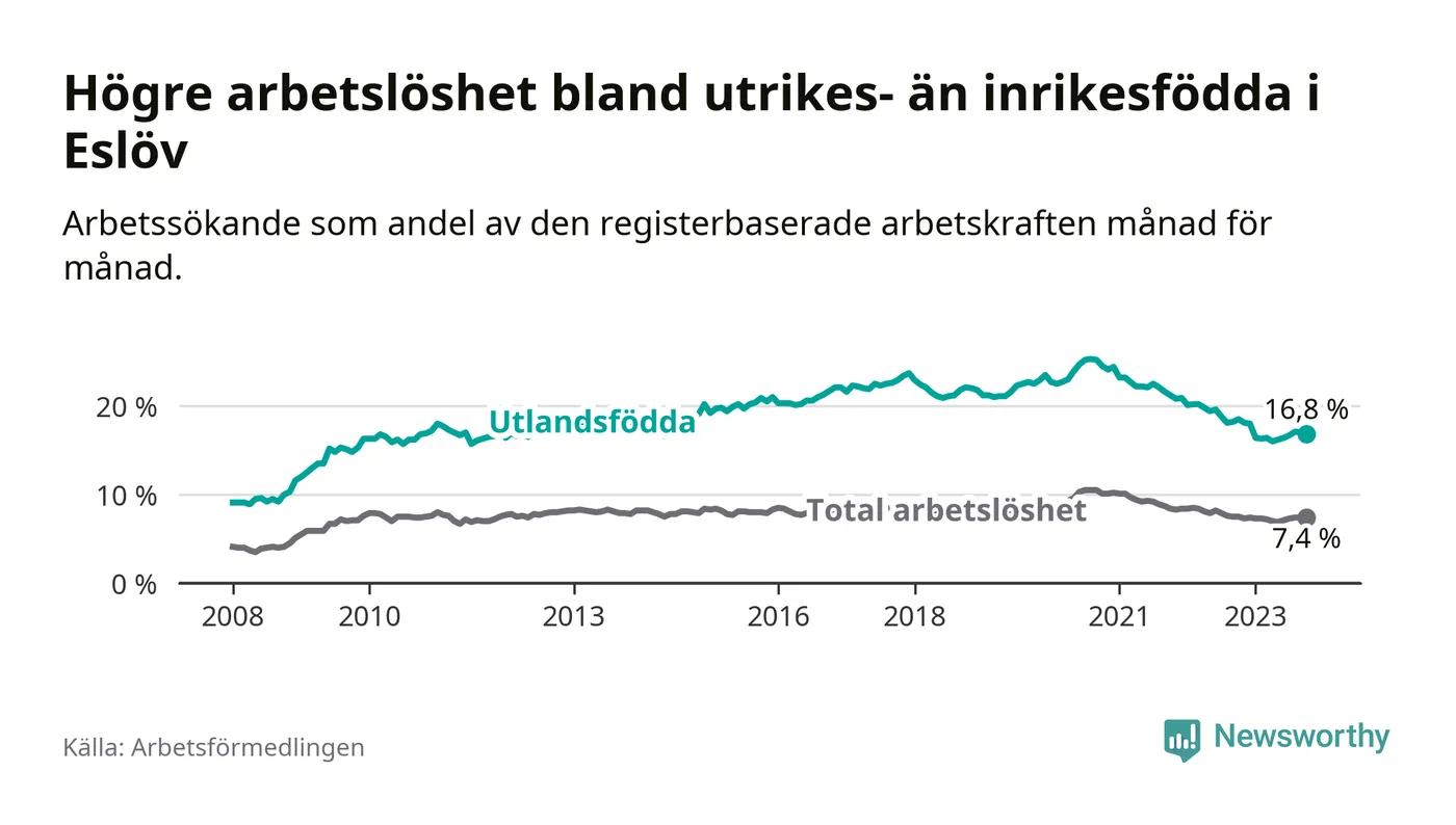 Skillnaden i arbetslöshet mellan utrikesfödda och hela befolkningen är 9,4 procentenheter i Eslöv. Det är en betydligt mindre skillnad än för ett år sedan (−1,6 procentenheter).
