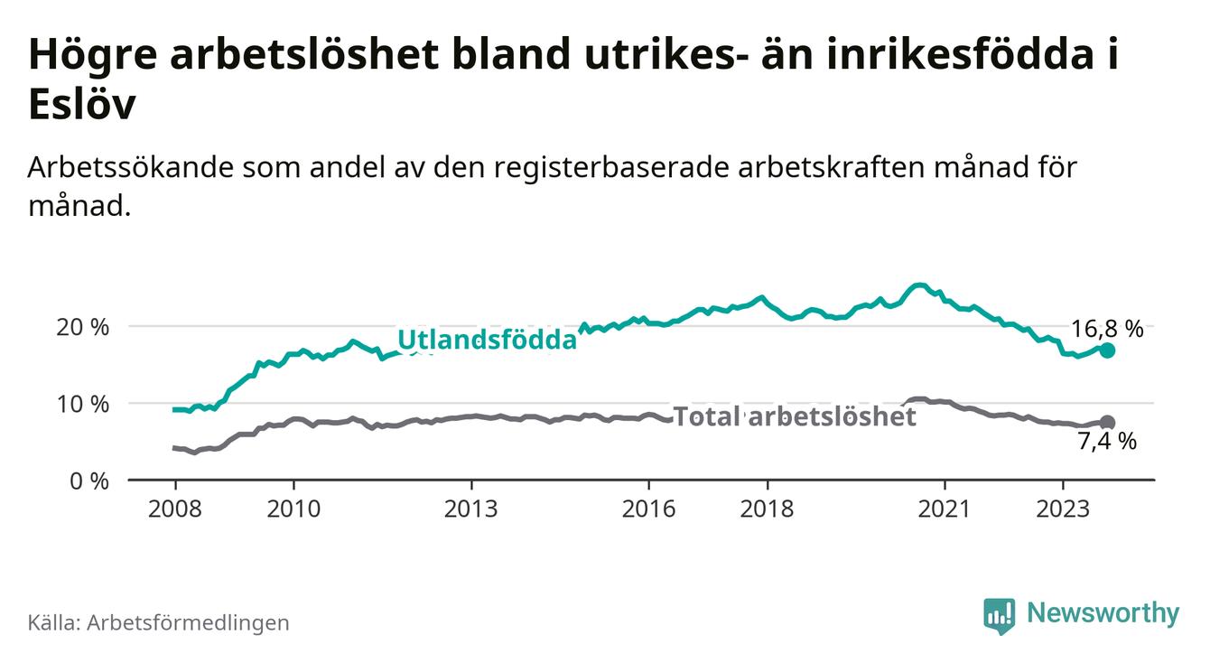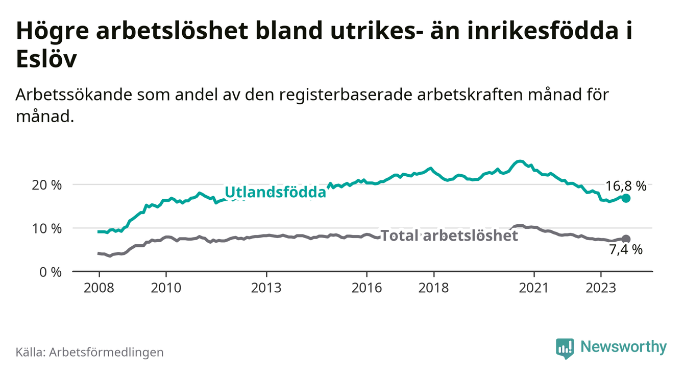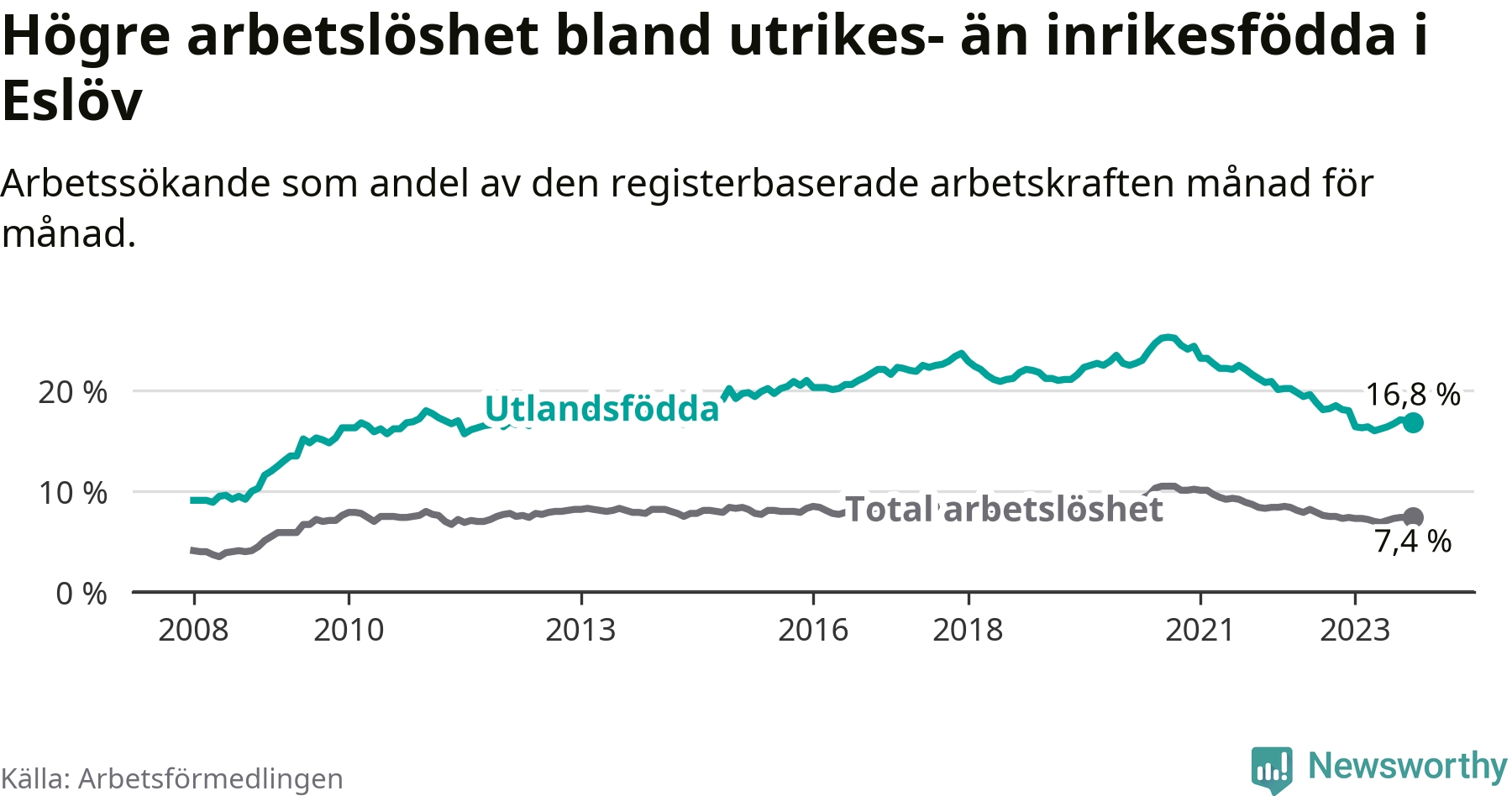 Skillnaden i arbetslöshet mellan utrikesfödda och hela befolkningen är 9,4 procentenheter i Eslöv. Det är en betydligt mindre skillnad än för ett år sedan (−1,6 procentenheter).