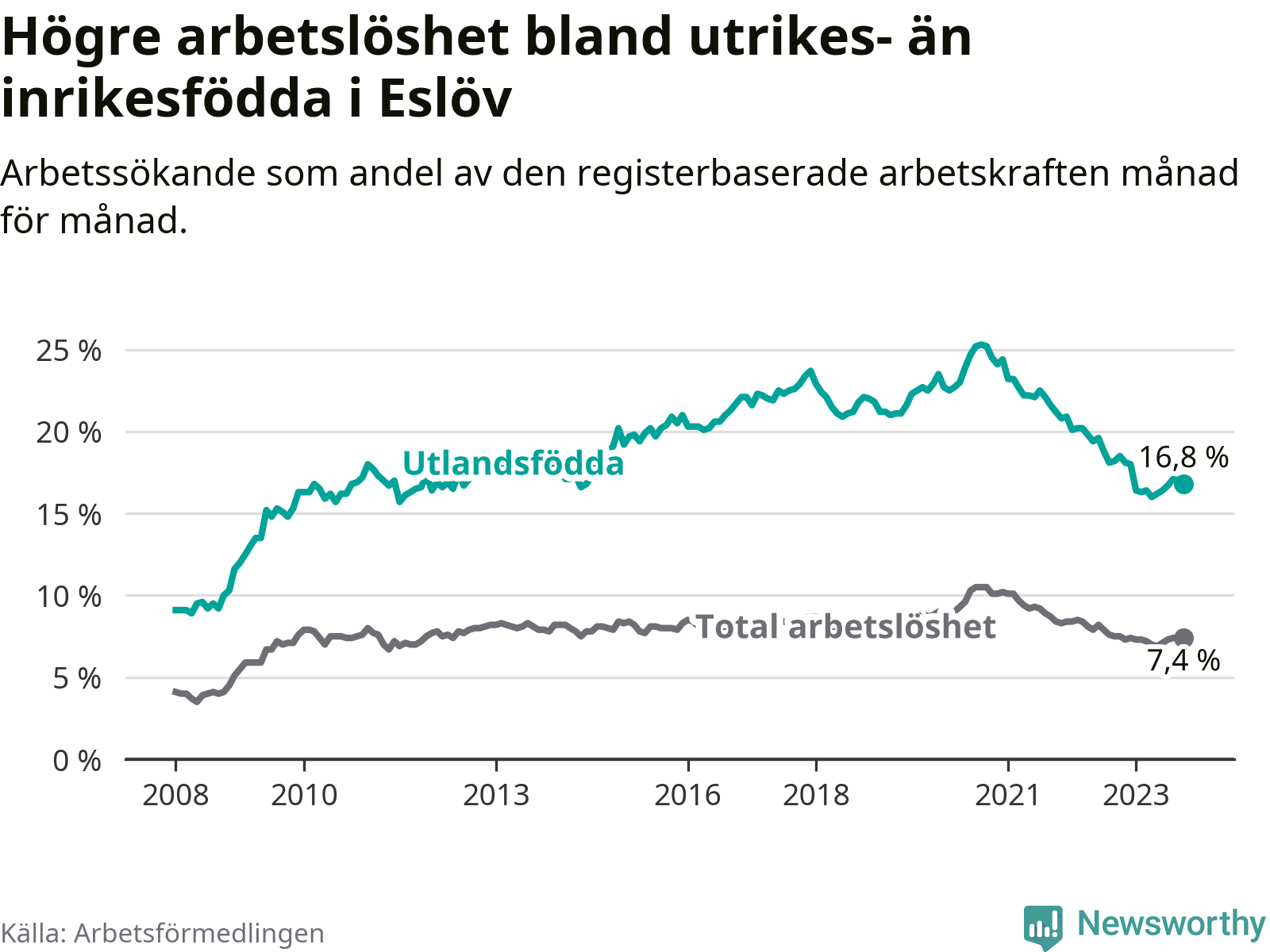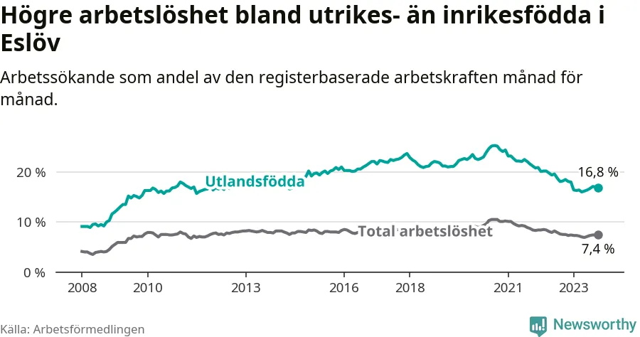 Arbetslösheten bland utlandsfödda var 16,8 procent i Eslöv under oktober månad, motsvarande 707 av 4 208 personer. Det är 1,7 procentenheter färre än vid samma tidpunkt i fjol (−9 om man räknar personer). Därmed har de utlandsföddas arbetslöshet varit lägre än vid samma tidpunkt i fjol i över två år i sträck. Sedan mars 2021 har arbetslösheten bland utlandsfödda minskat från 22,7 till 16,8 procent.