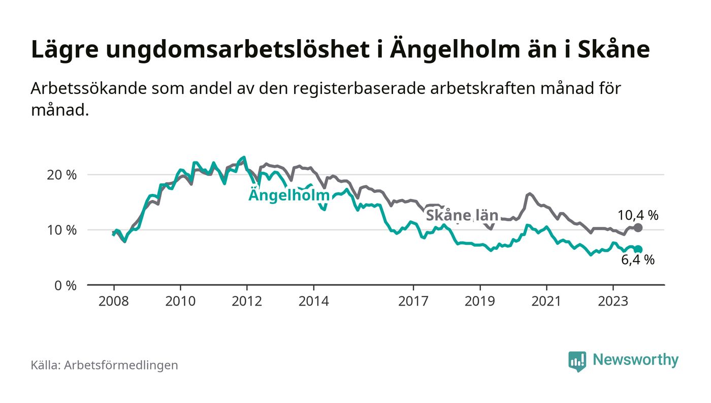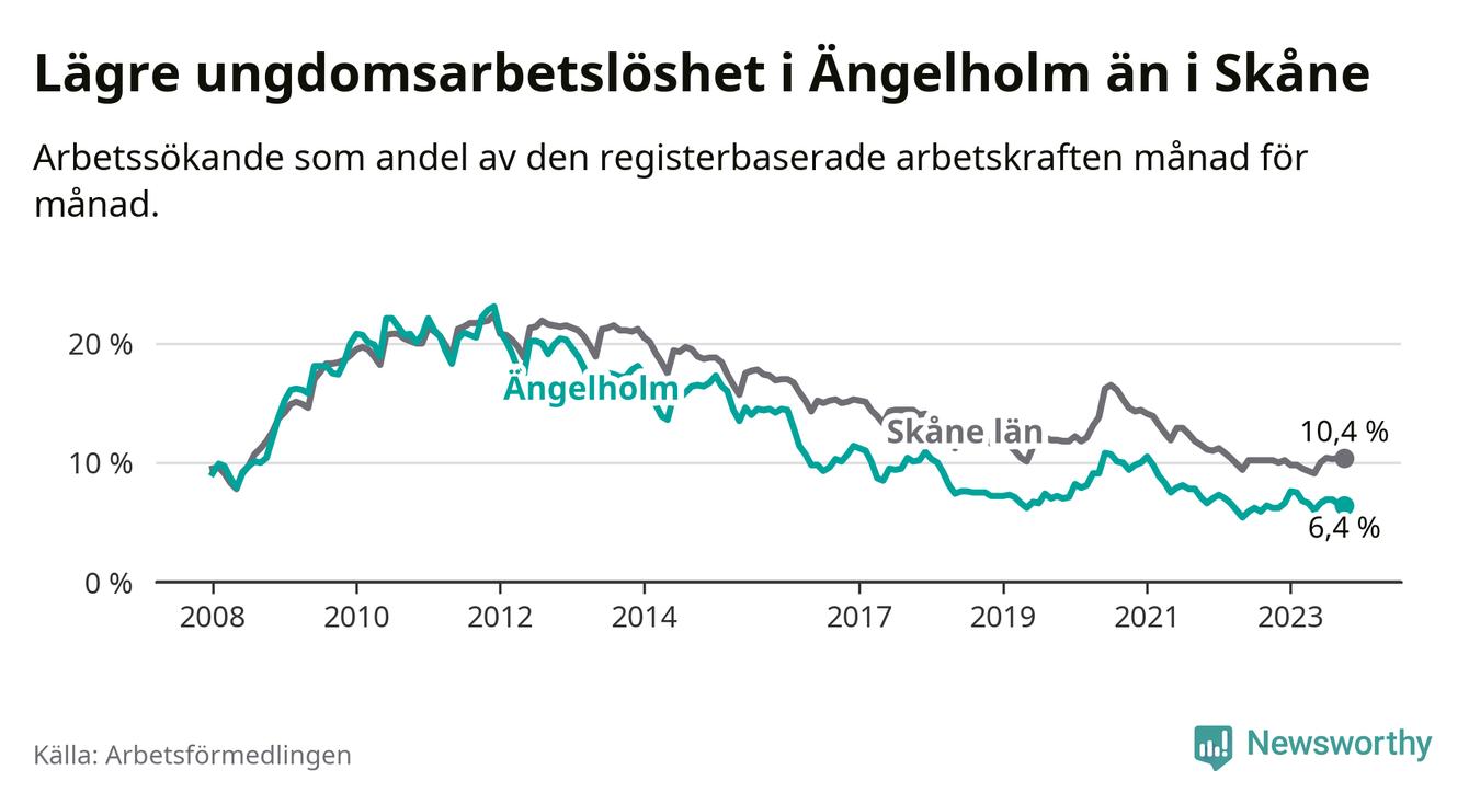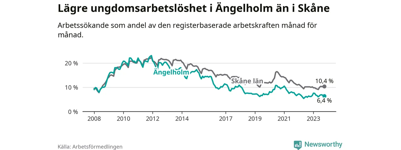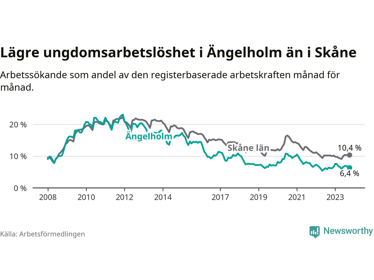 Precis som den totala arbetslösheten ligger ungdomsarbetslösheten i Ängelholm lägre än i Skåne som helhet. Skillnaden mellan kommunen och länet är 4,0 procentenheter.