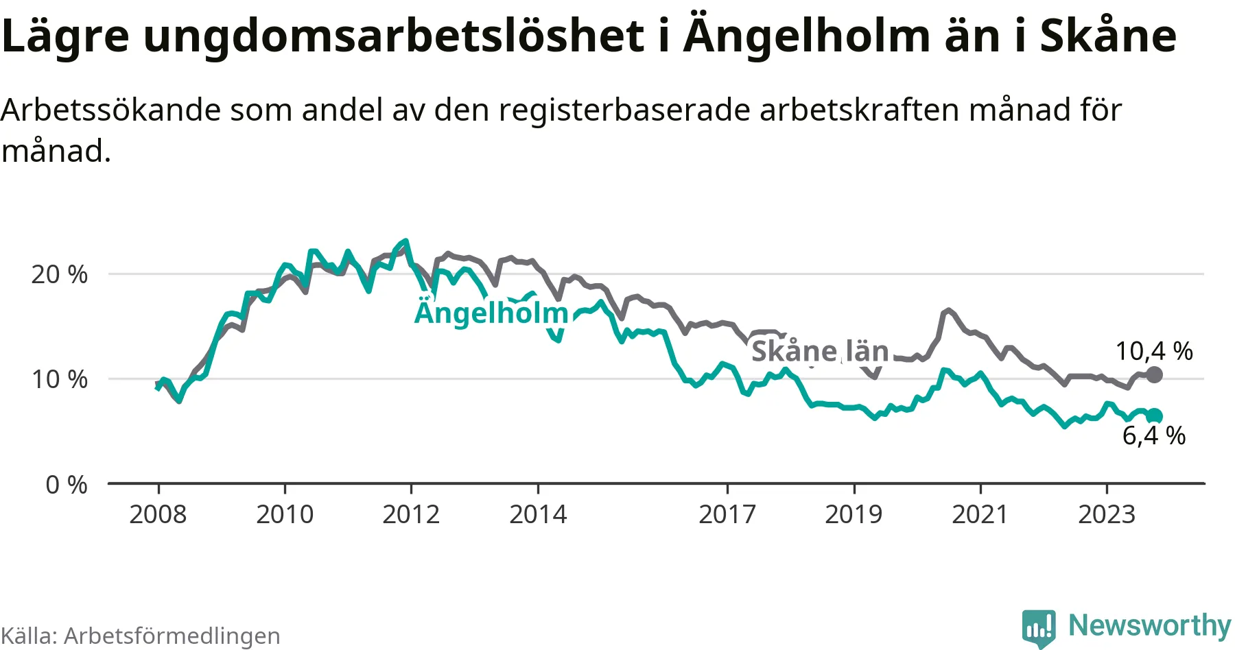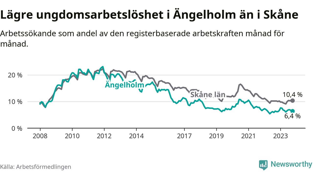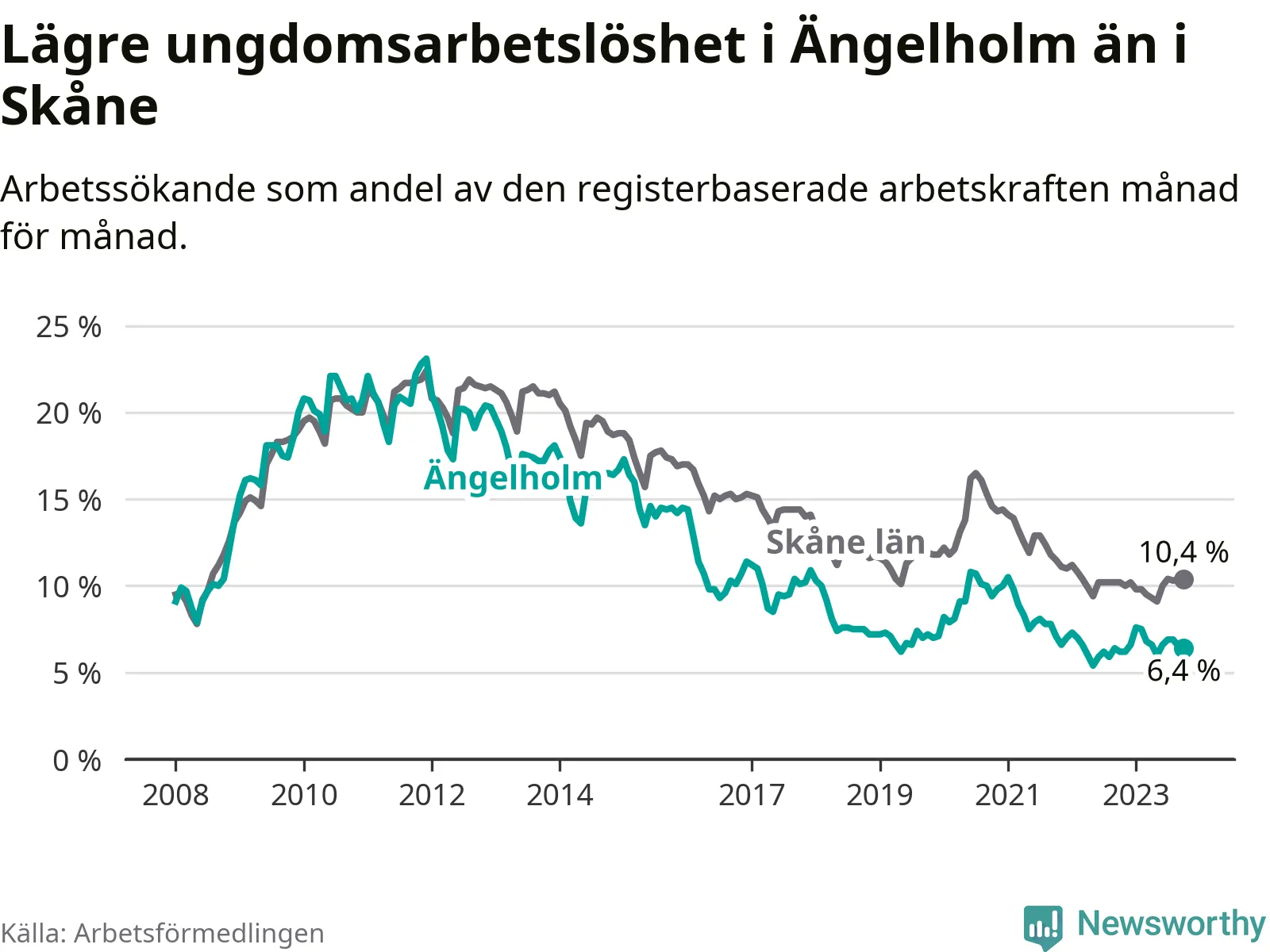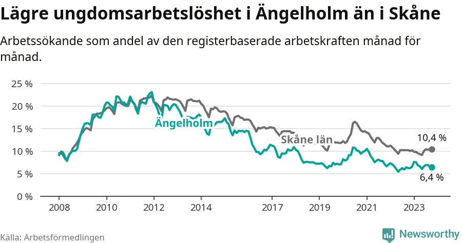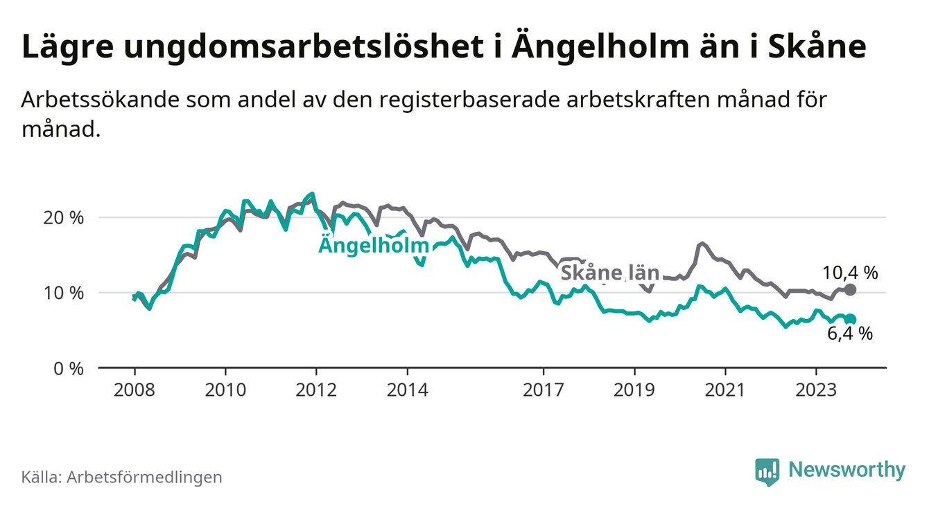 Precis som den totala arbetslösheten ligger ungdomsarbetslösheten i Ängelholm lägre än i Skåne som helhet. Skillnaden mellan kommunen och länet är 4,0 procentenheter.