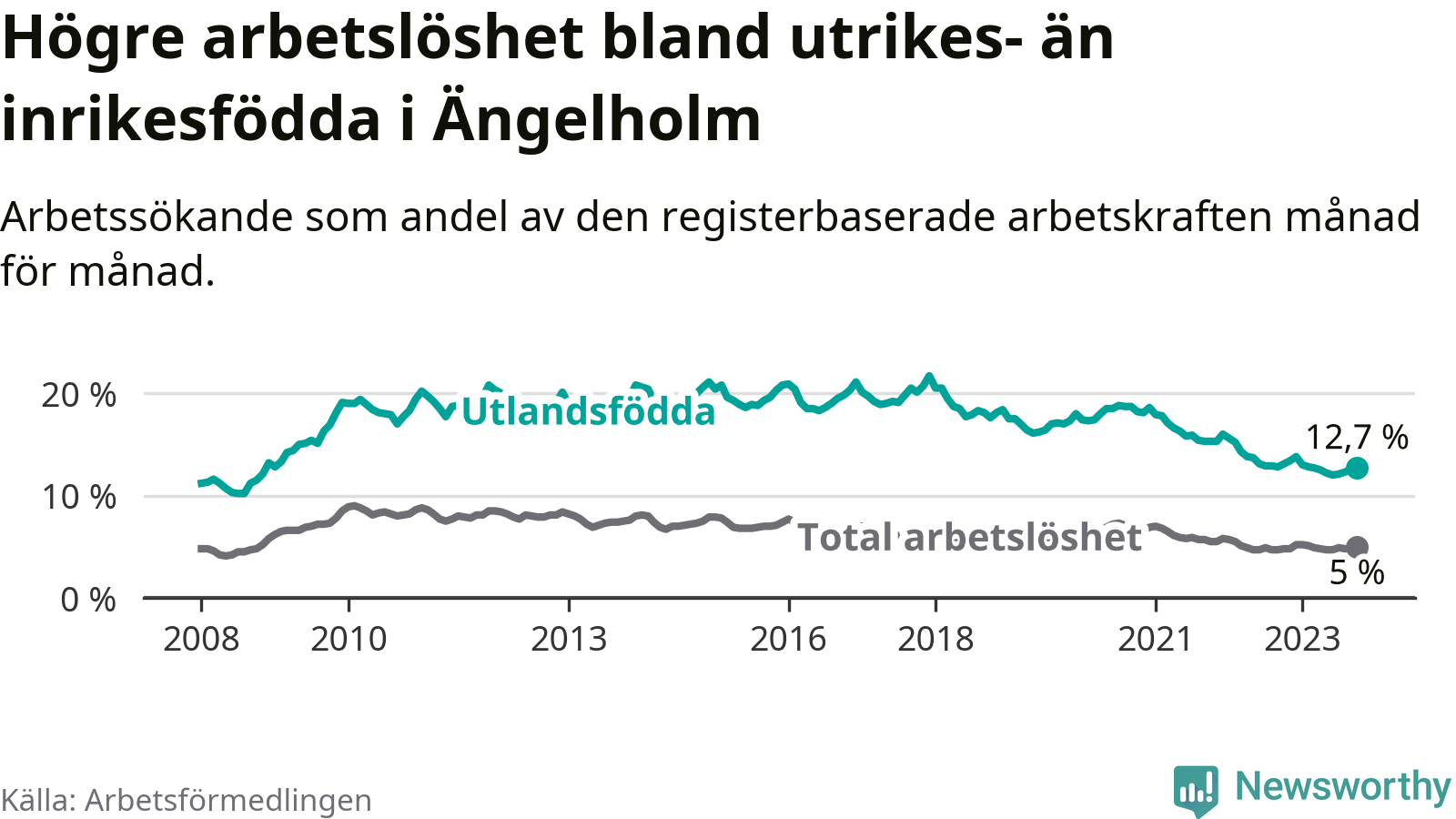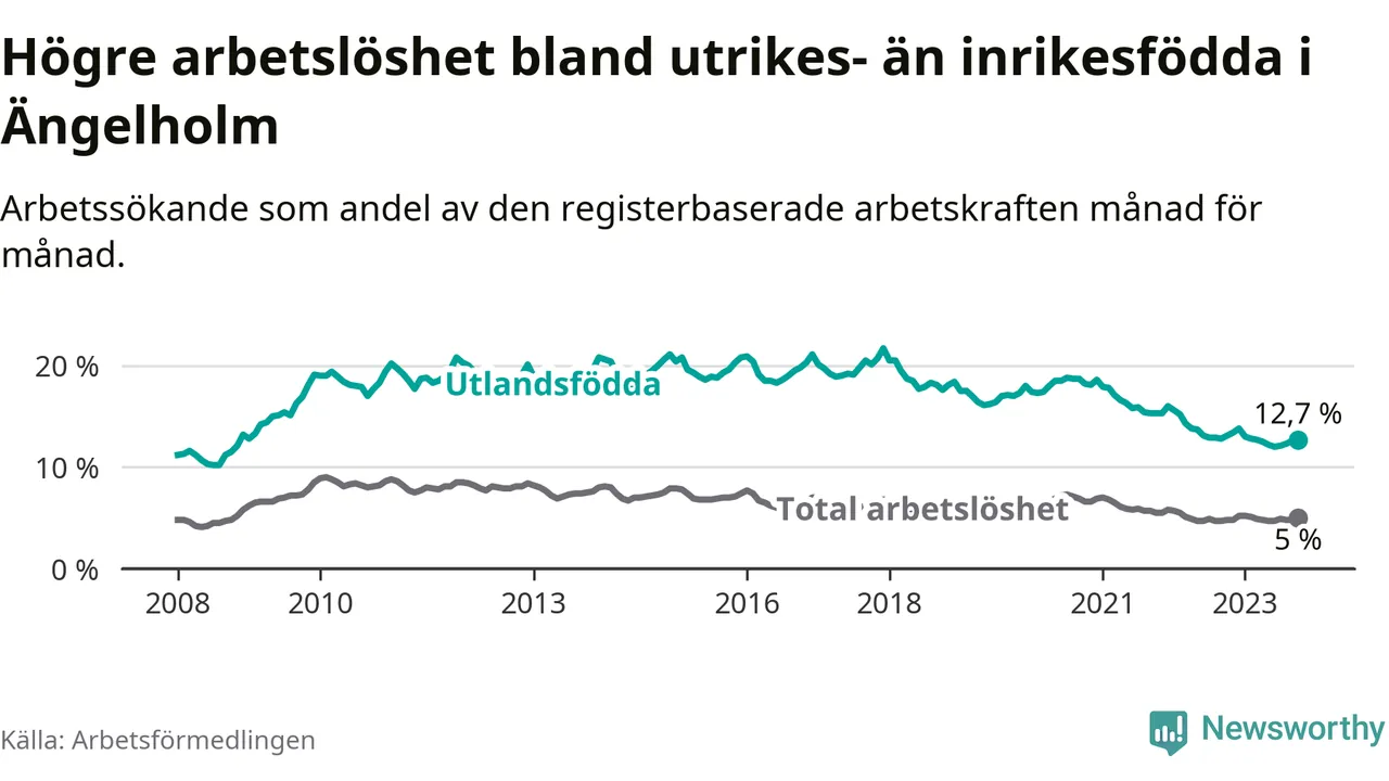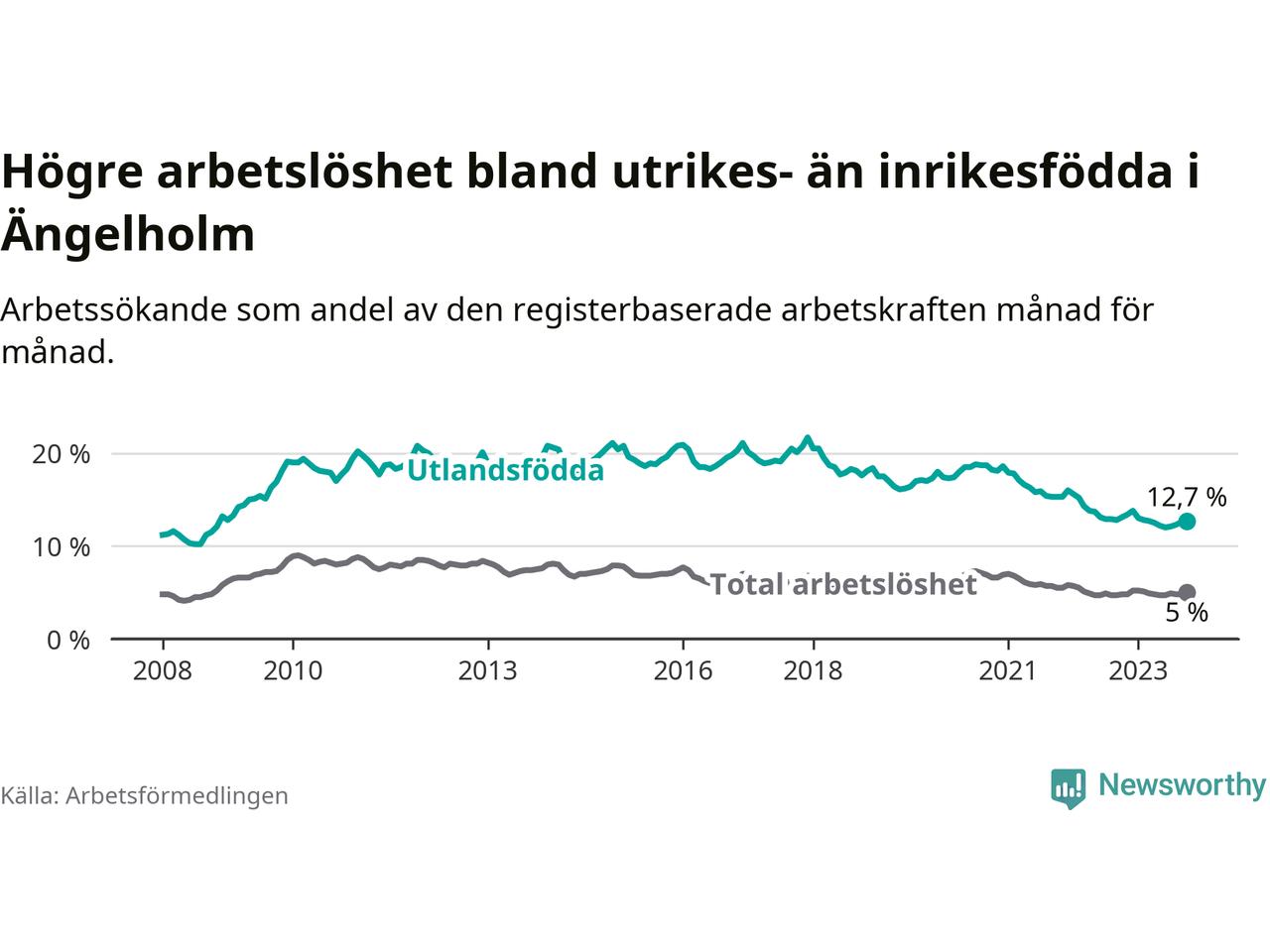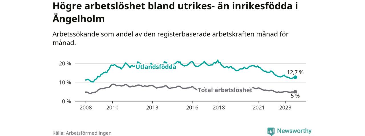 Skillnaden i arbetslöshet mellan utrikesfödda och hela befolkningen är 7,7 procentenheter i Ängelholm. Det är en mindre skillnad än för ett år sedan (−0,6 procentenheter).