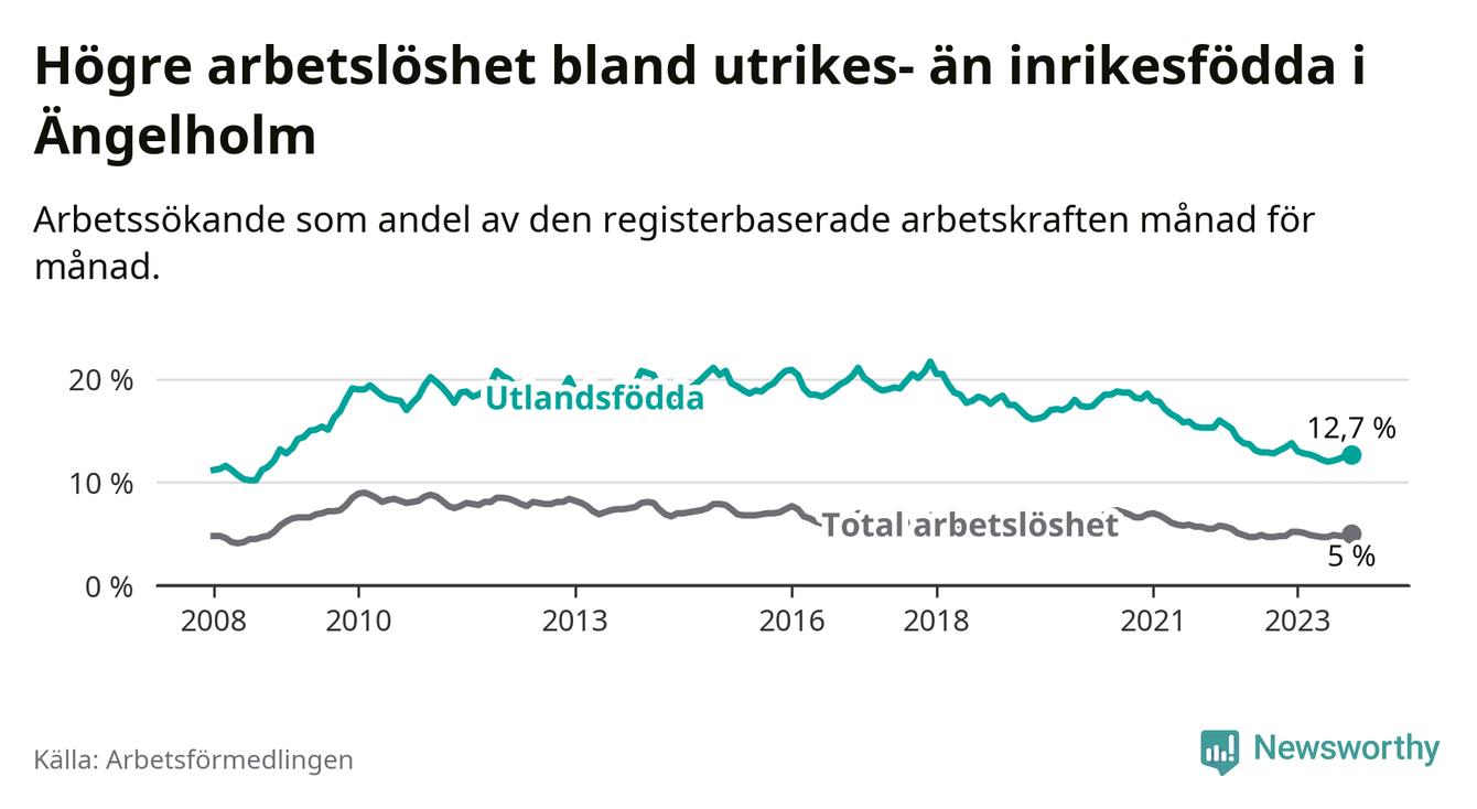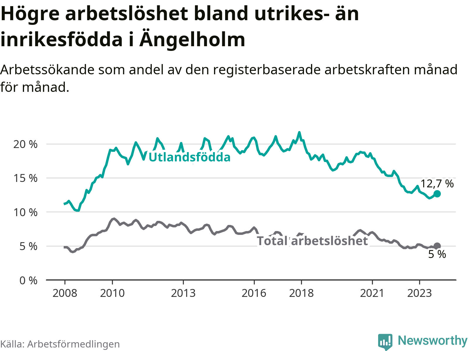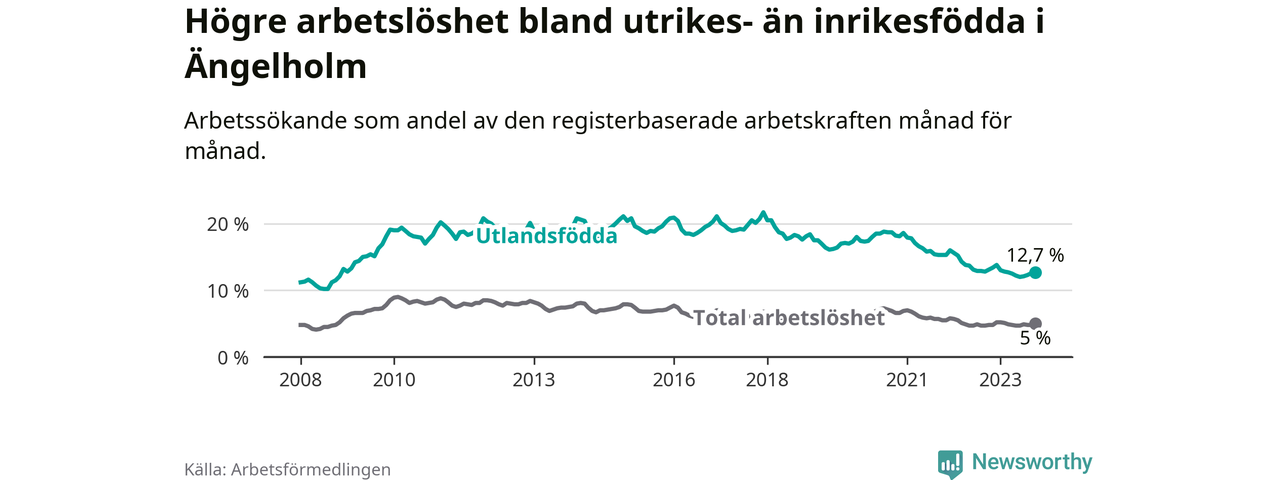 Skillnaden i arbetslöshet mellan utrikesfödda och hela befolkningen är 7,7 procentenheter i Ängelholm. Det är en mindre skillnad än för ett år sedan (−0,6 procentenheter).