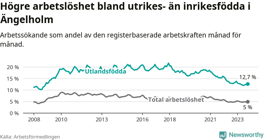 Arbetslösheten bland utlandsfödda var 12,7 procent i Ängelholm under oktober månad, motsvarande 429 av 3 378 personer. Det är 0,4 procentenheter färre än vid samma tidpunkt i fjol (+29 om man räknar personer). Därmed har de utlandsföddas arbetslöshet varit lägre än vid samma tidpunkt i fjol i över två år i sträck. Sedan februari 2021 har arbetslösheten bland utlandsfödda minskat från 17,8 till 12,7 procent.