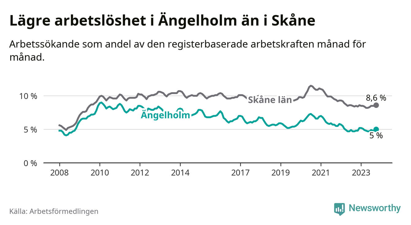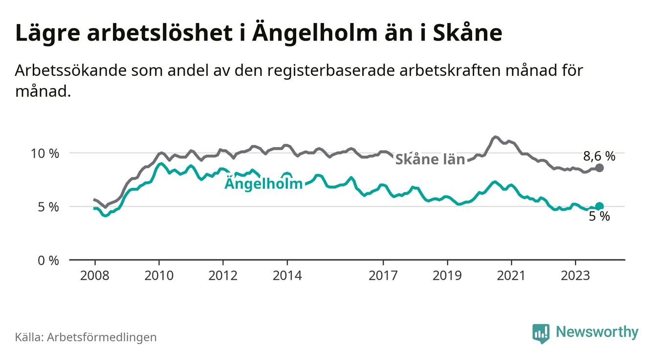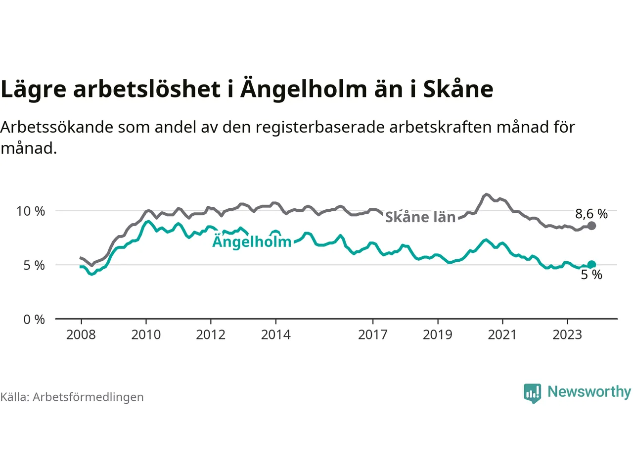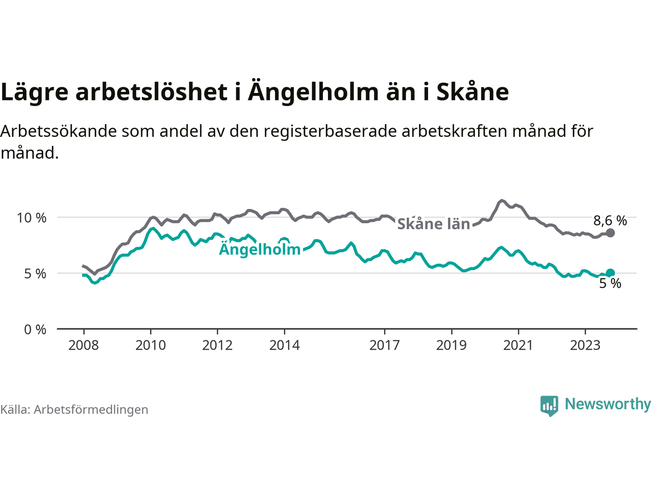 Även om arbetslösheten i Ängelholm alltså ökar, så ligger den fortfarande under snittet i hela Skåne län (5,0 procent i kommunen, jämfört med 8,6 procent i hela länet). Vellinge har den lägsta arbetslösheten i länet (3,3 procent), medan Malmö har den högsta (12,3 procent). För att Ängelholm skulle komma ner i samma arbetslöshetsnivå som Vellinge skulle 362 personer behöva sysselsättas.