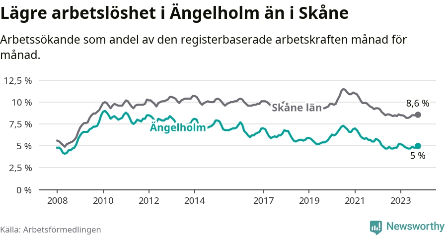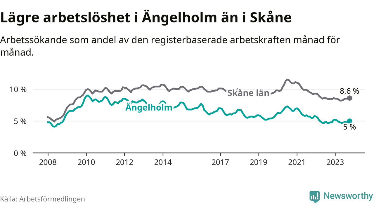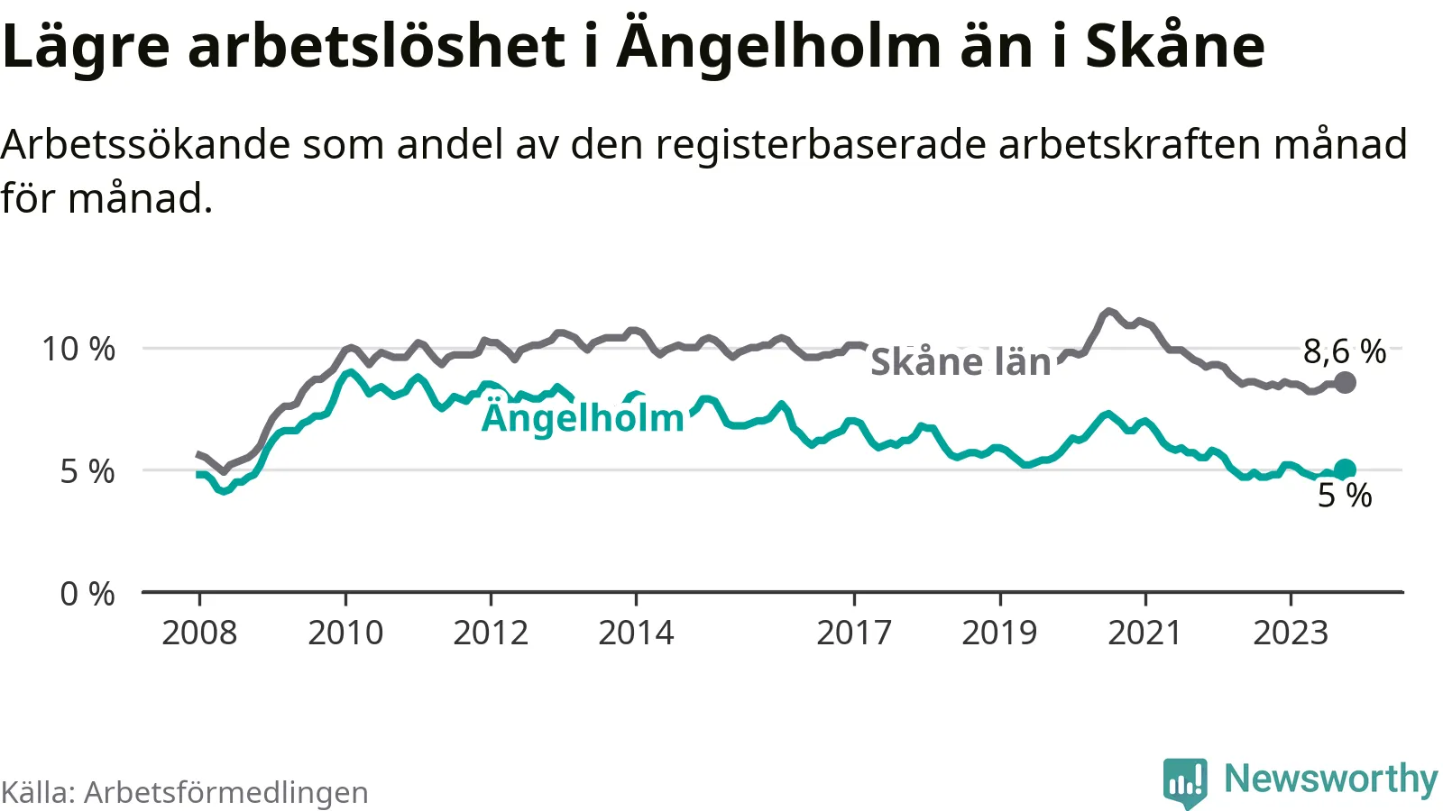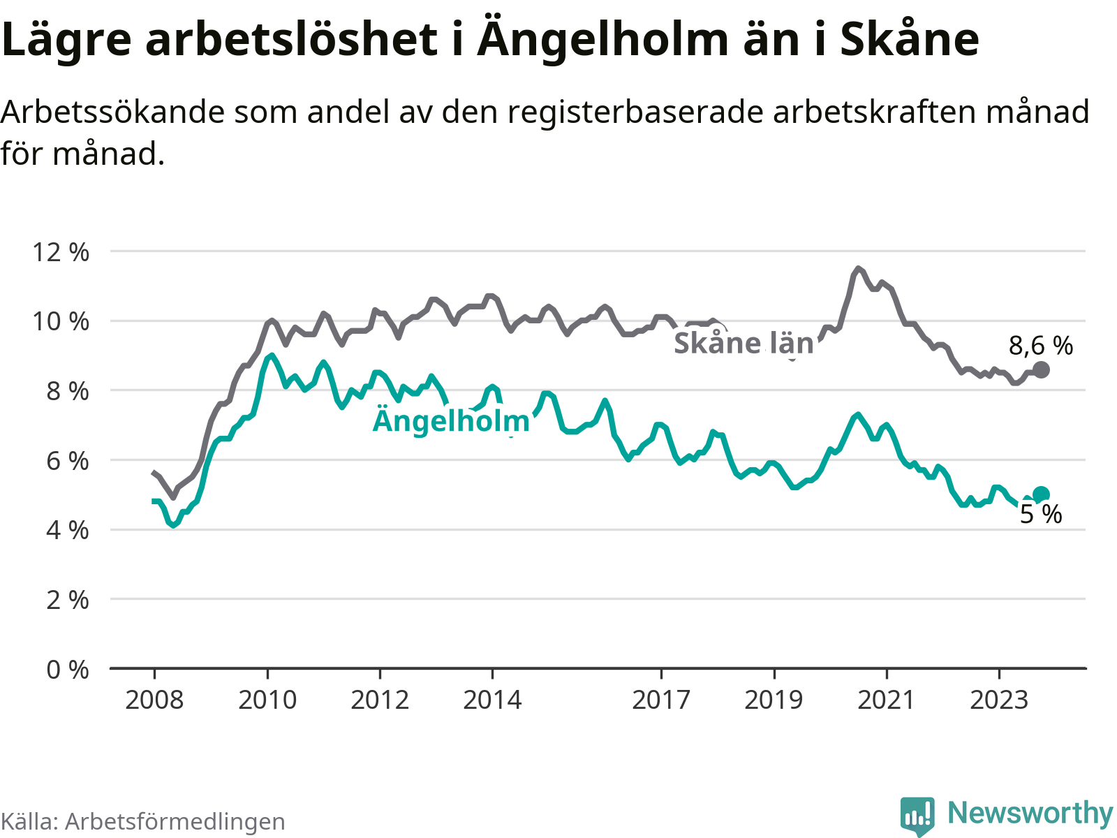 Även om arbetslösheten i Ängelholm alltså ökar, så ligger den fortfarande under snittet i hela Skåne län (5,0 procent i kommunen, jämfört med 8,6 procent i hela länet). Vellinge har den lägsta arbetslösheten i länet (3,3 procent), medan Malmö har den högsta (12,3 procent). För att Ängelholm skulle komma ner i samma arbetslöshetsnivå som Vellinge skulle 362 personer behöva sysselsättas.