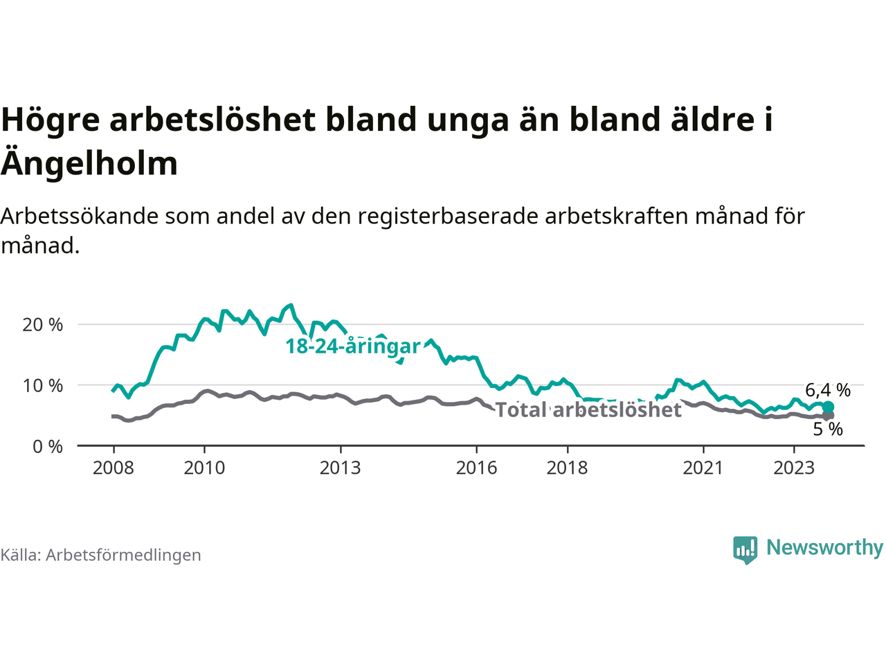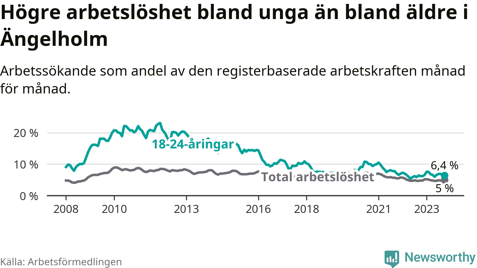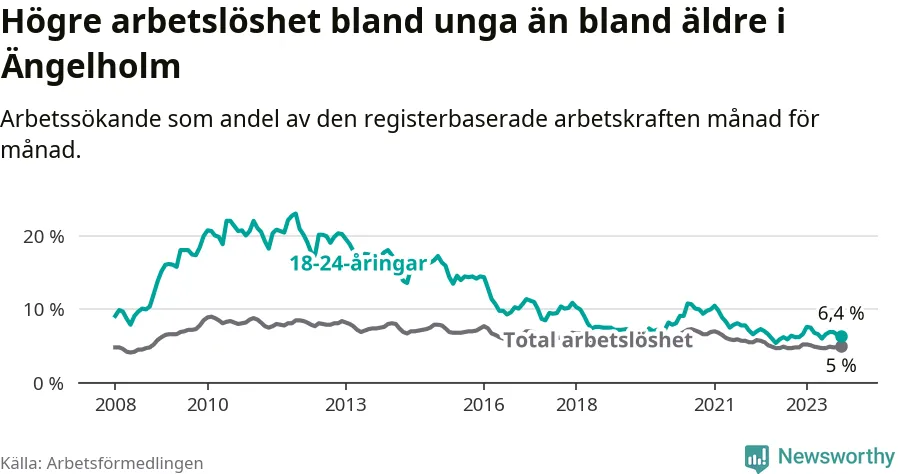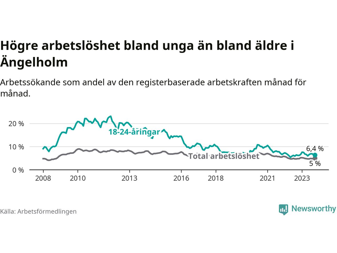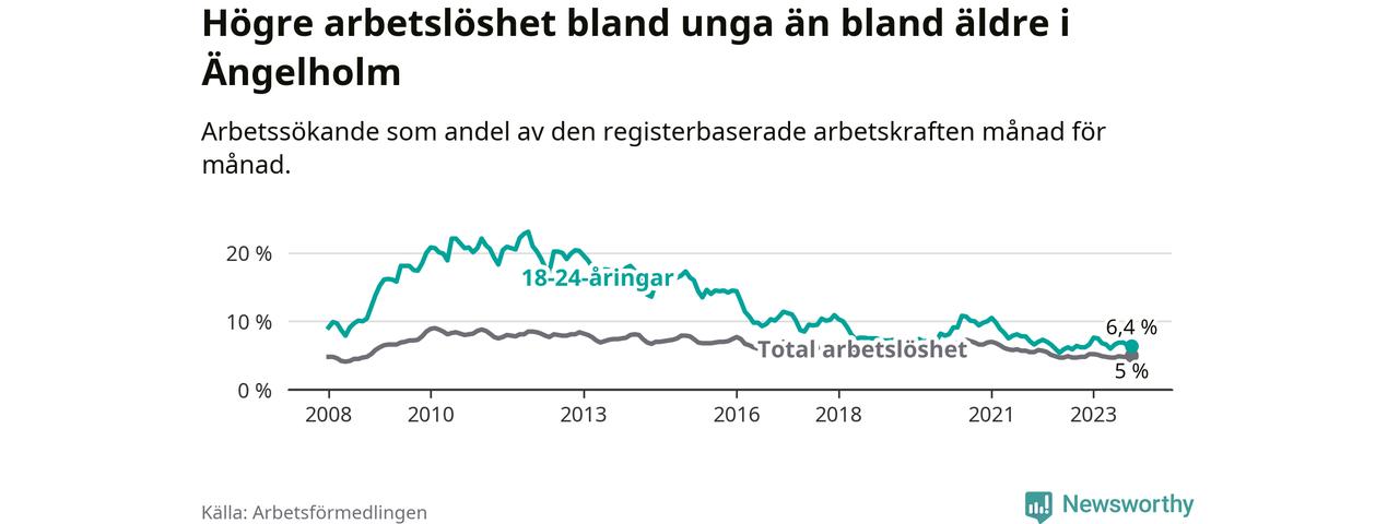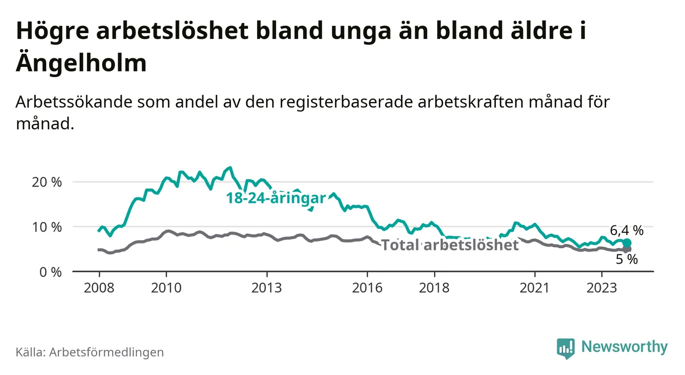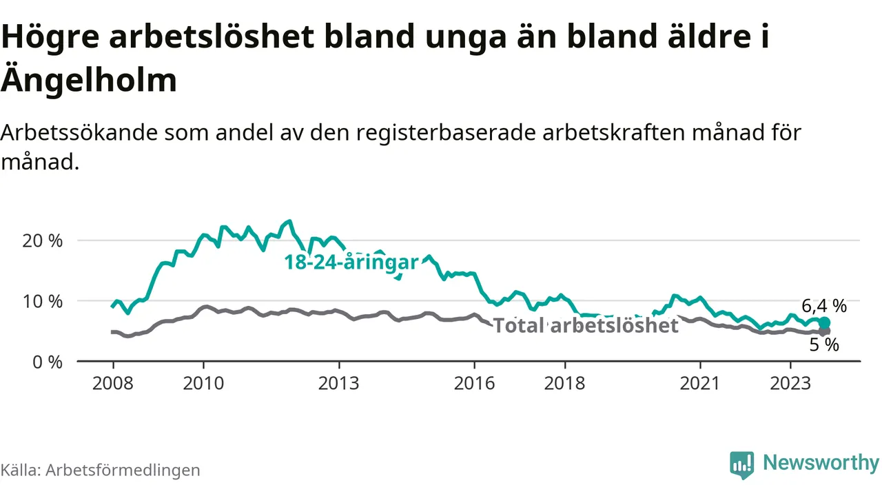 I och med den senaste månadens uppgång har de ungas arbetslöshet i Ängelholm stigit tio månader i följd (upp från 6,6 procent i december 2022 till 6,4 procent nu).