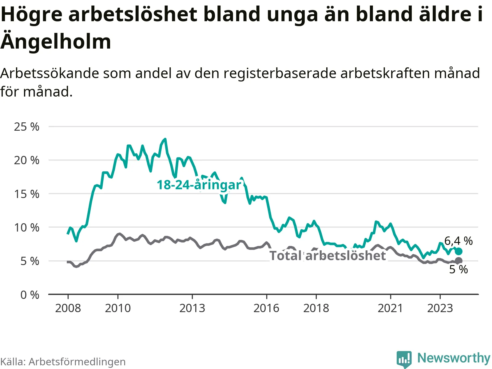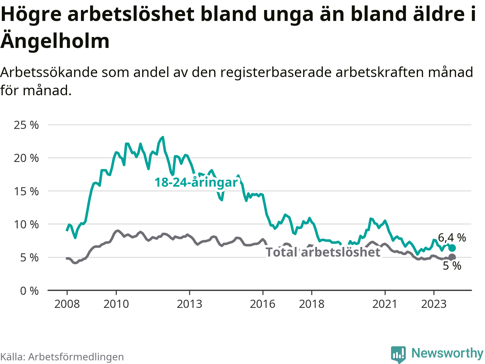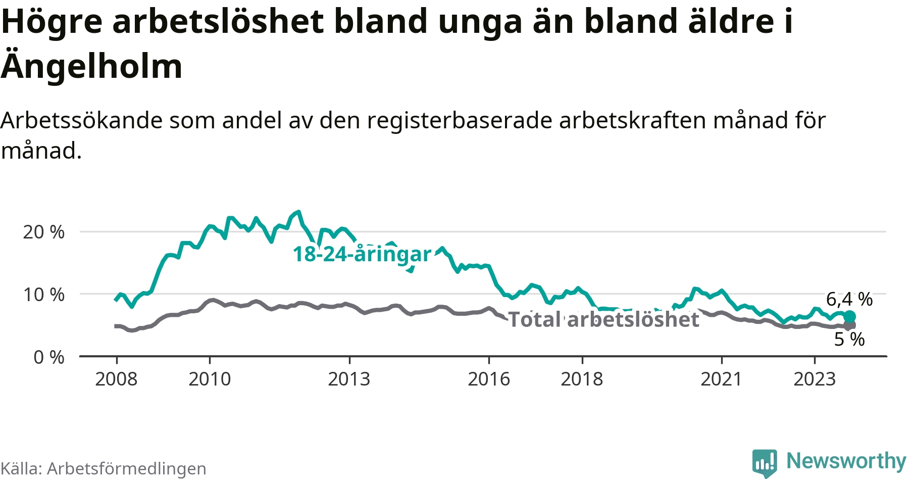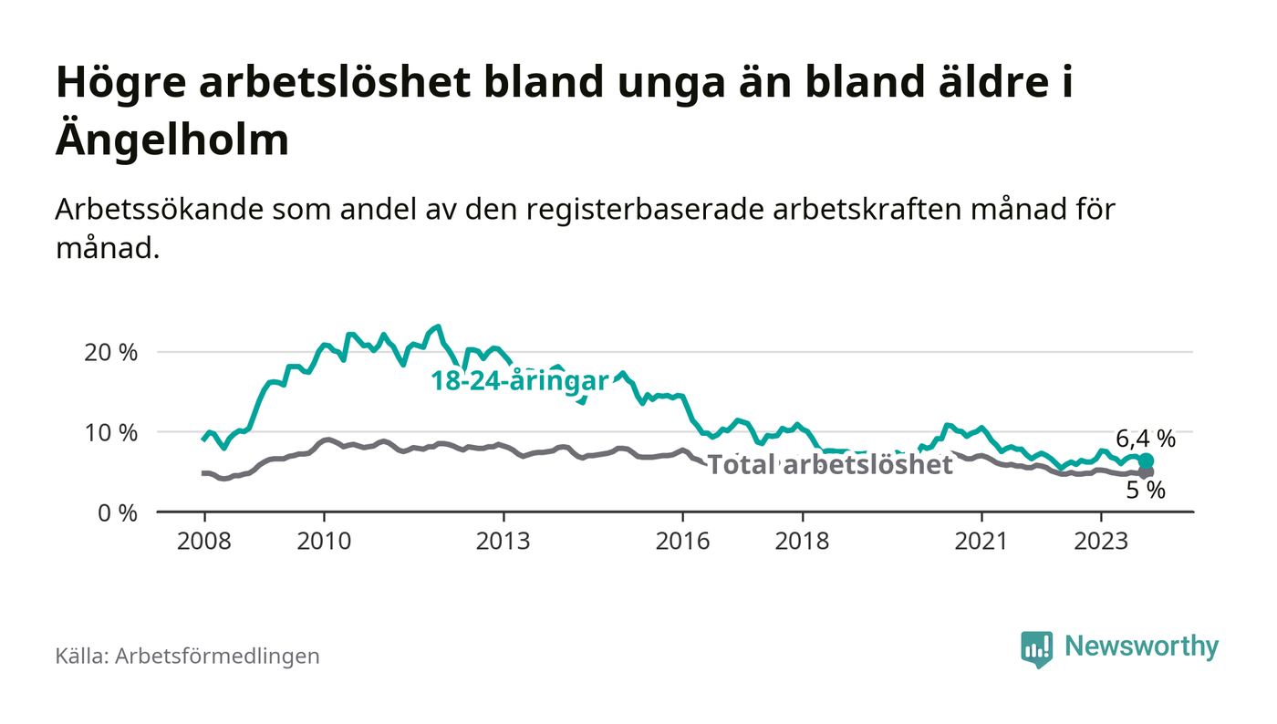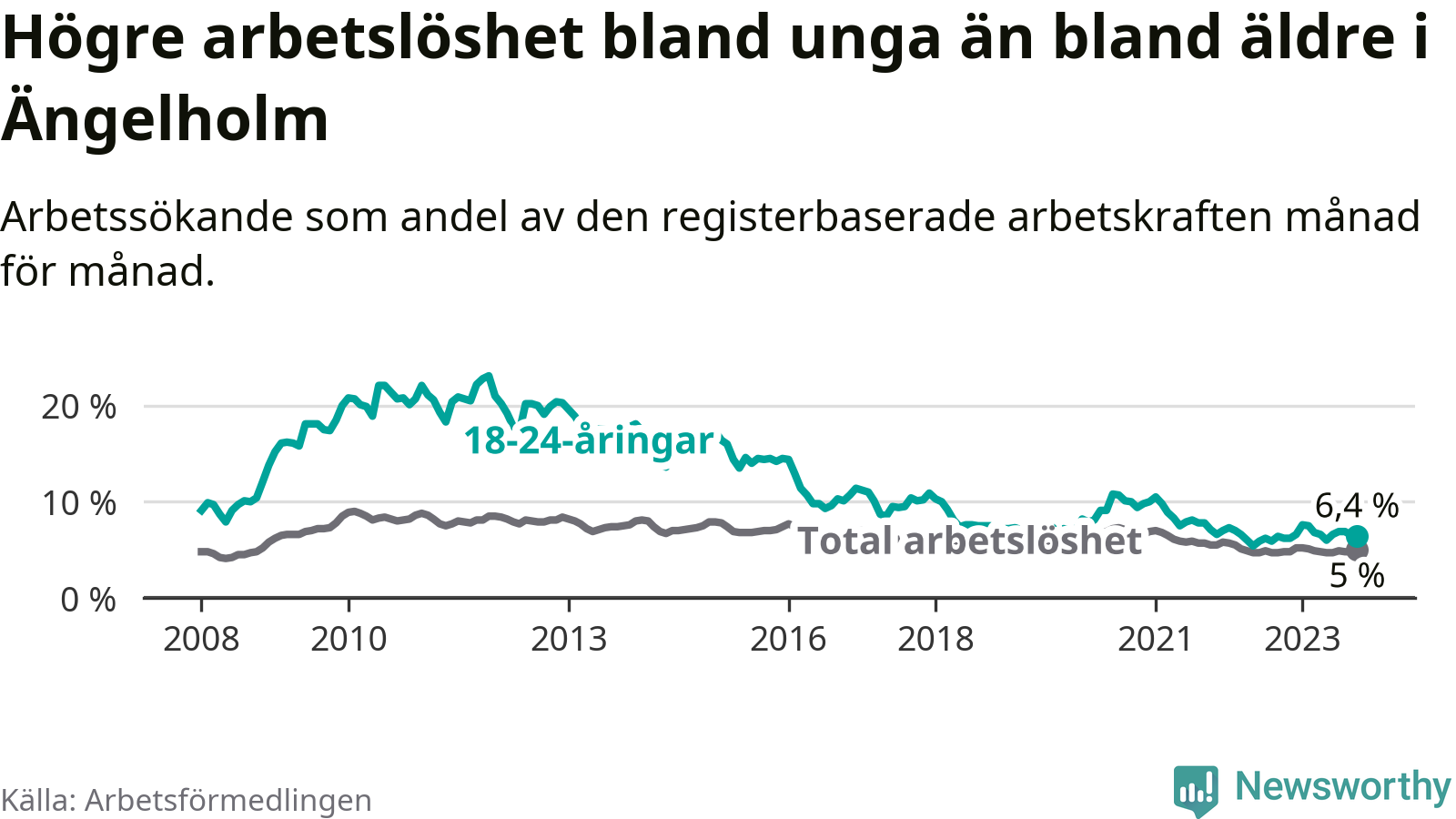 I och med den senaste månadens uppgång har de ungas arbetslöshet i Ängelholm stigit tio månader i följd (upp från 6,6 procent i december 2022 till 6,4 procent nu).