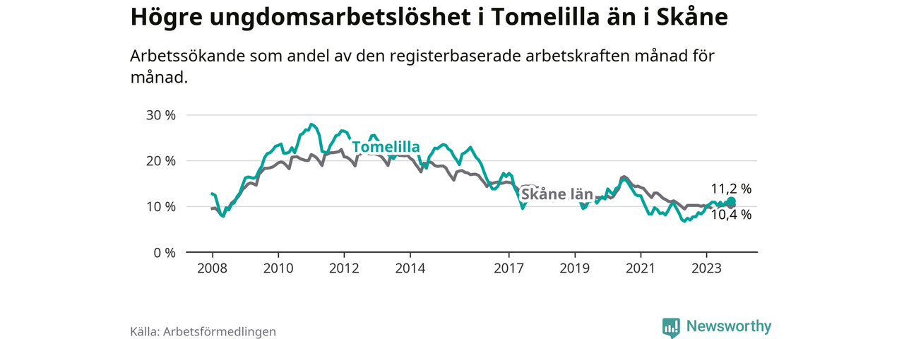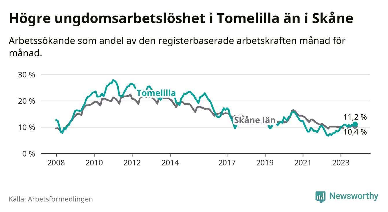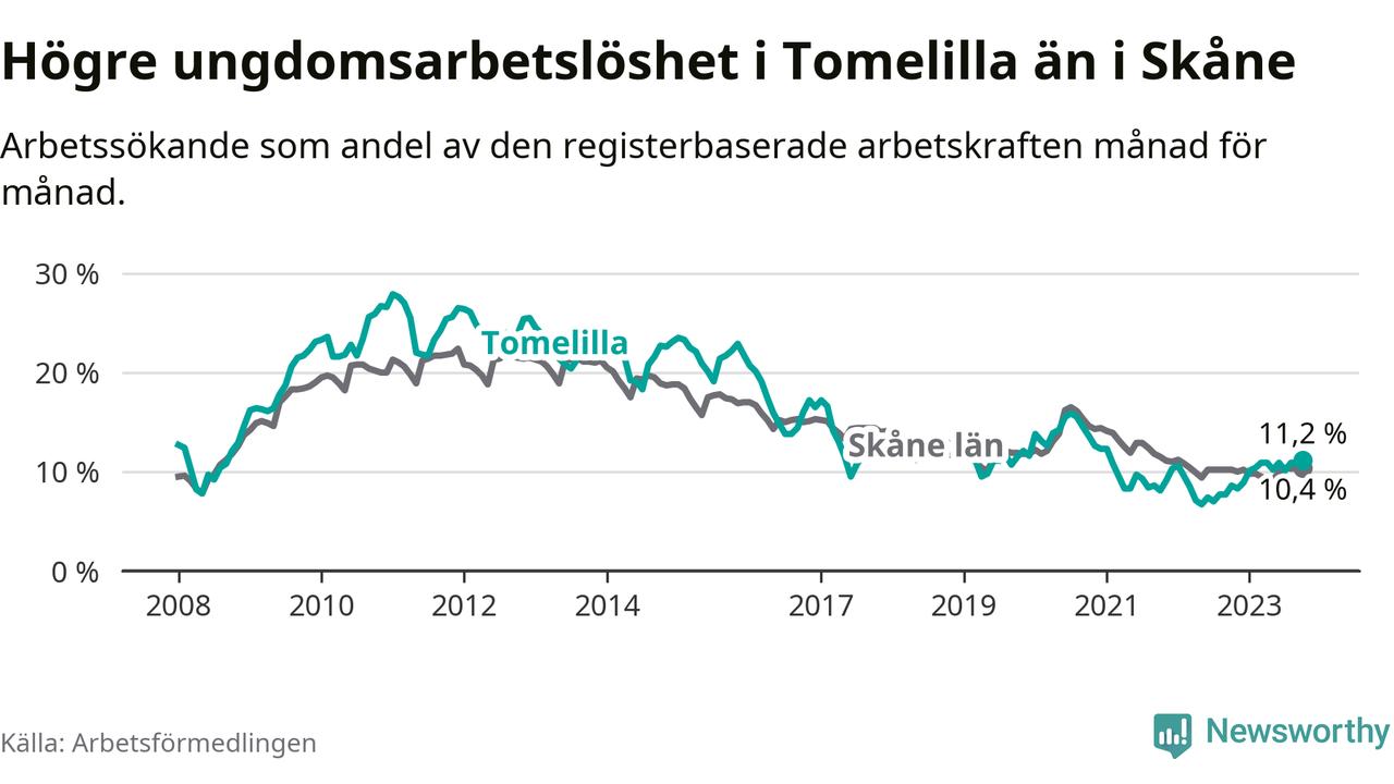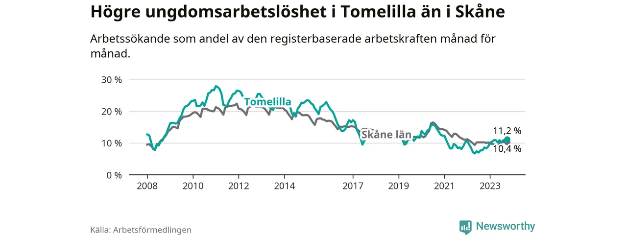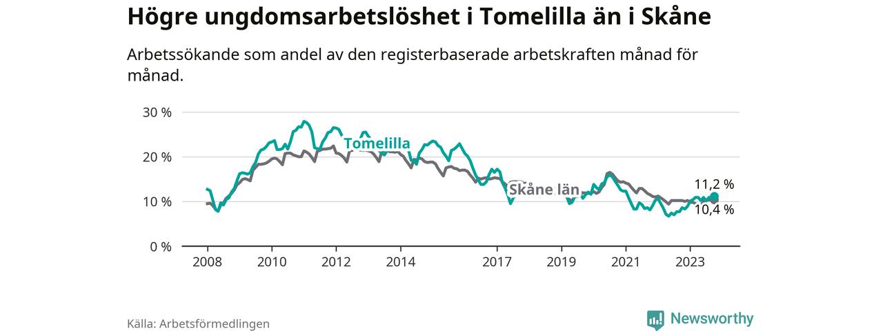 Medan Tomelilla har lägre total arbetslöshet än Skåne, ligger ungdomsarbetslösheten 0,8 procentenheter högre i Tomelilla.