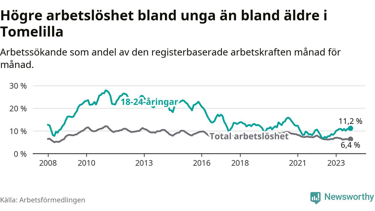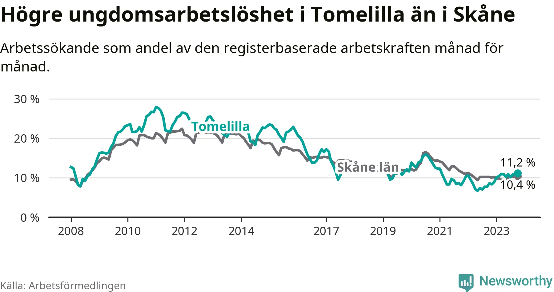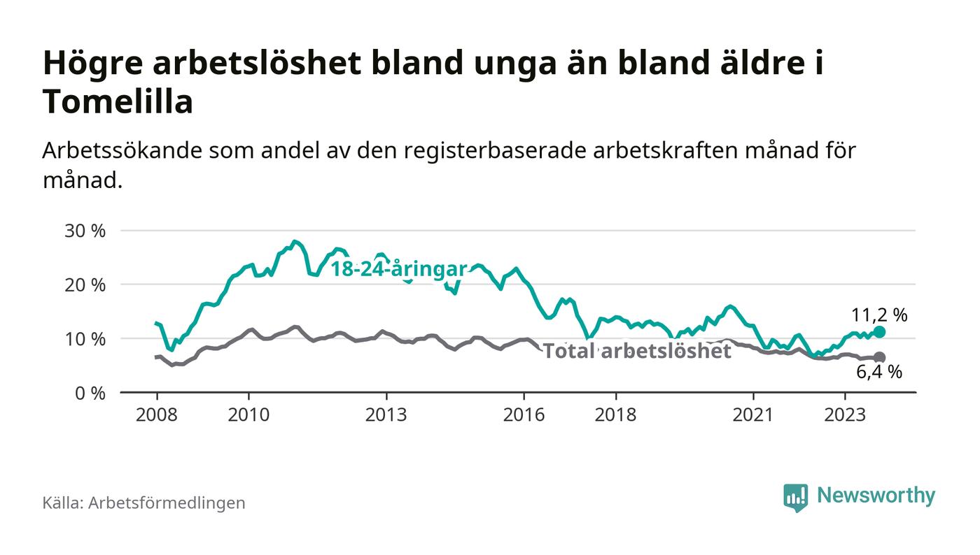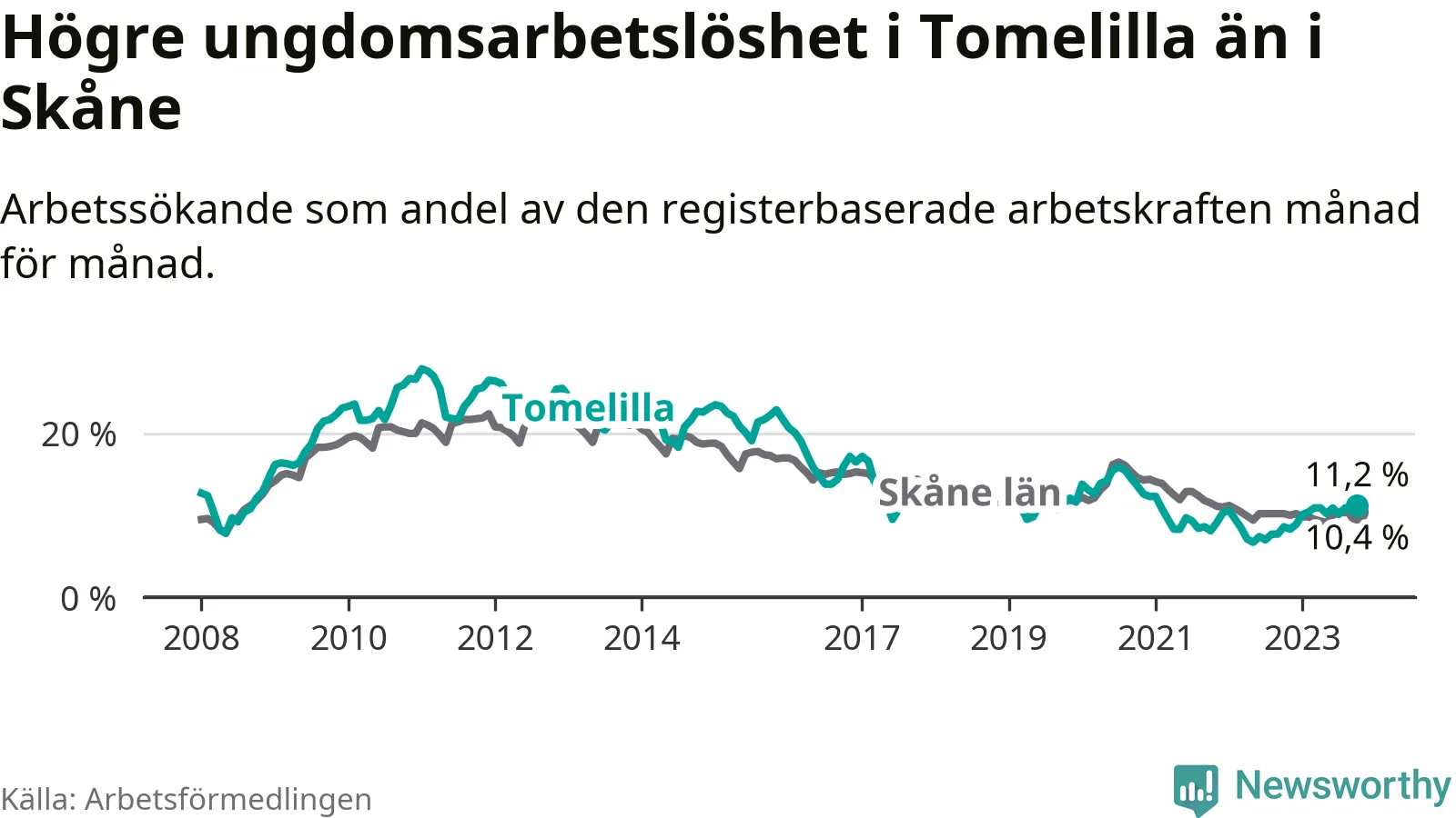 Medan Tomelilla har lägre total arbetslöshet än Skåne, ligger ungdomsarbetslösheten 0,8 procentenheter högre i Tomelilla.
