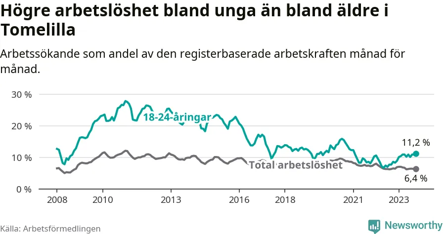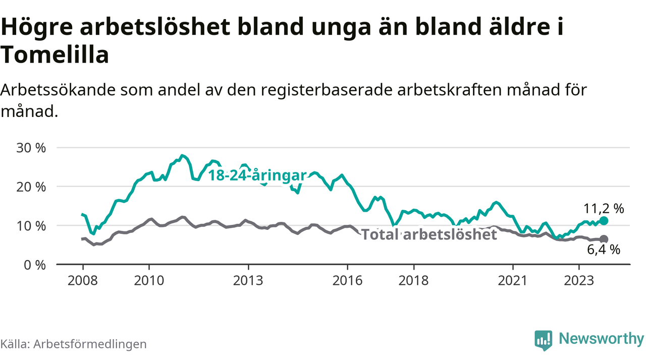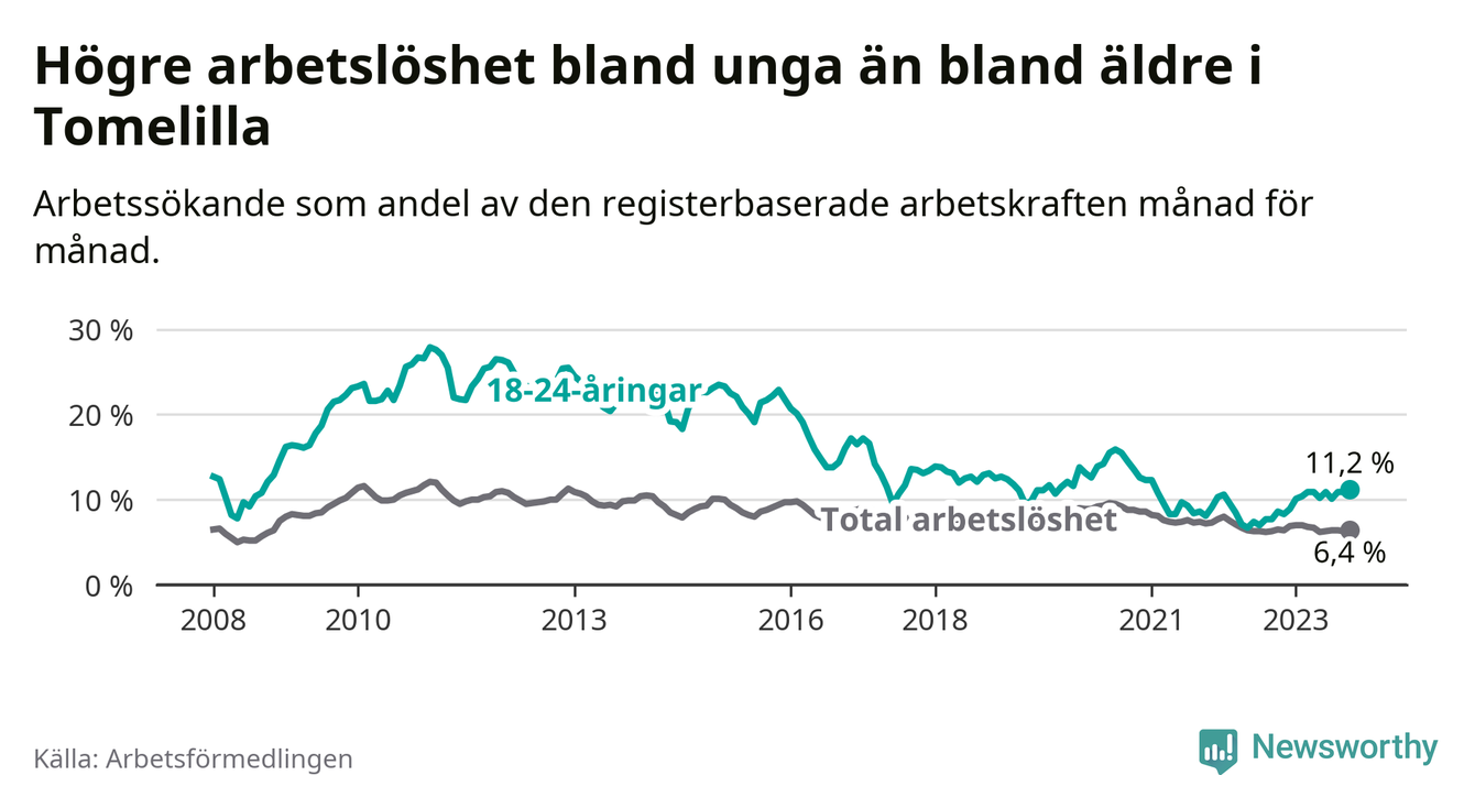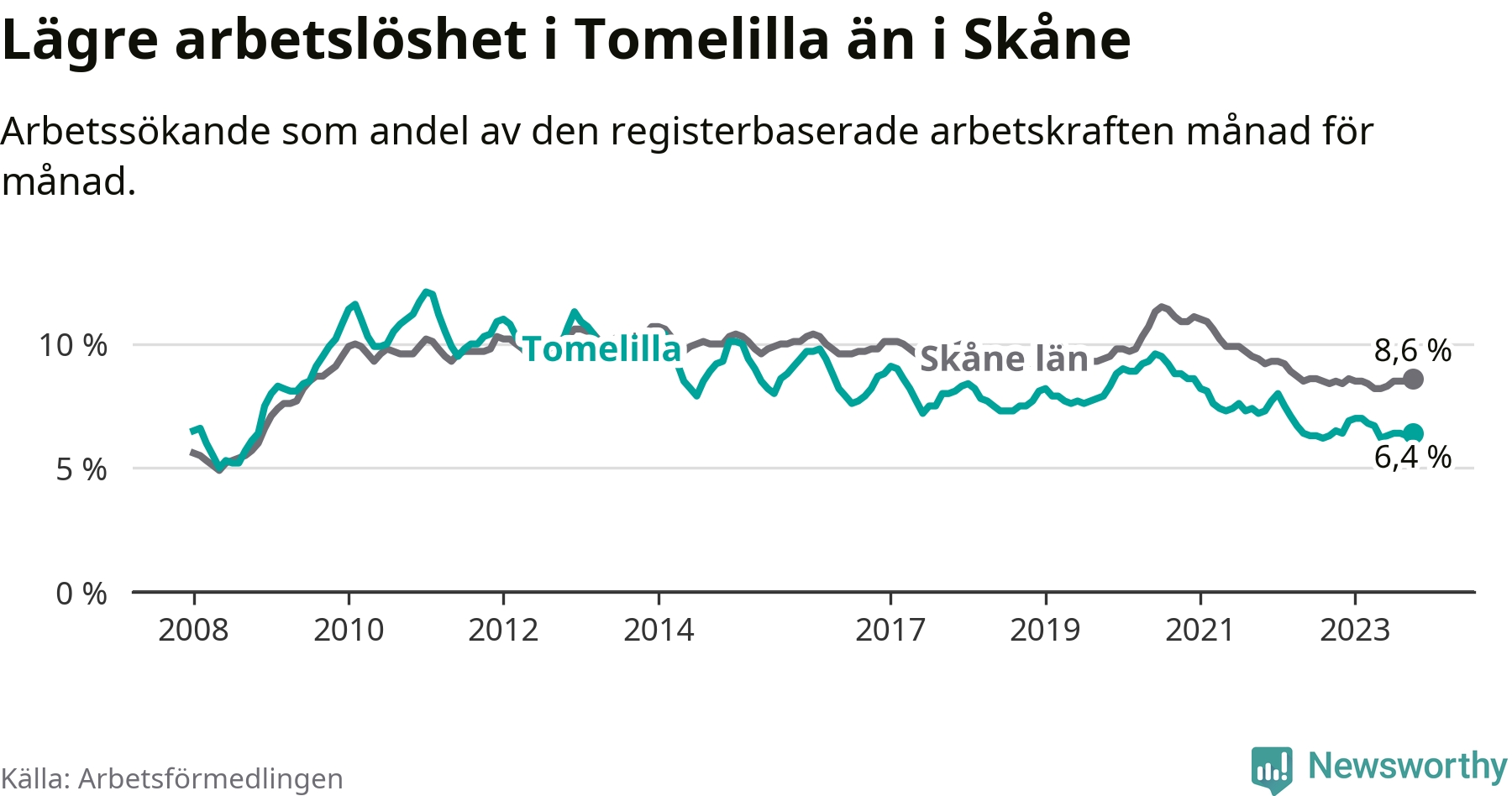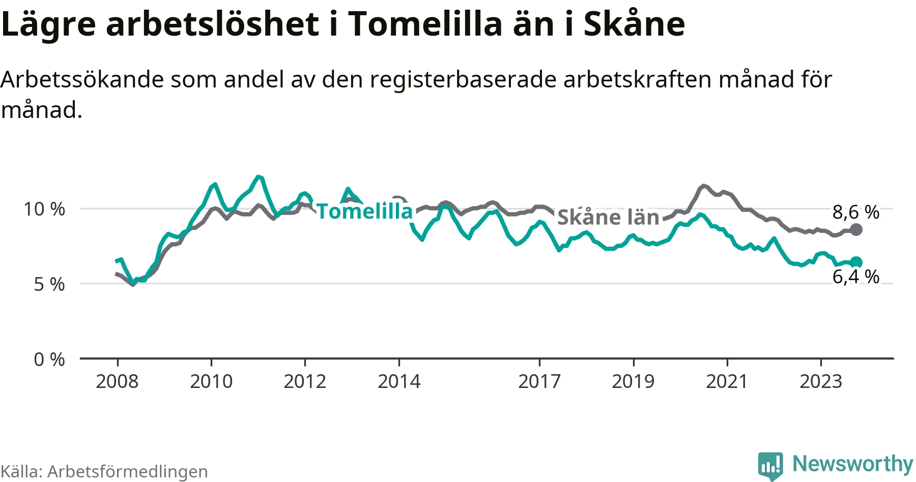 Medan Tomelilla har lägre total arbetslöshet än Skåne, ligger ungdomsarbetslösheten 0,8 procentenheter högre i Tomelilla.
