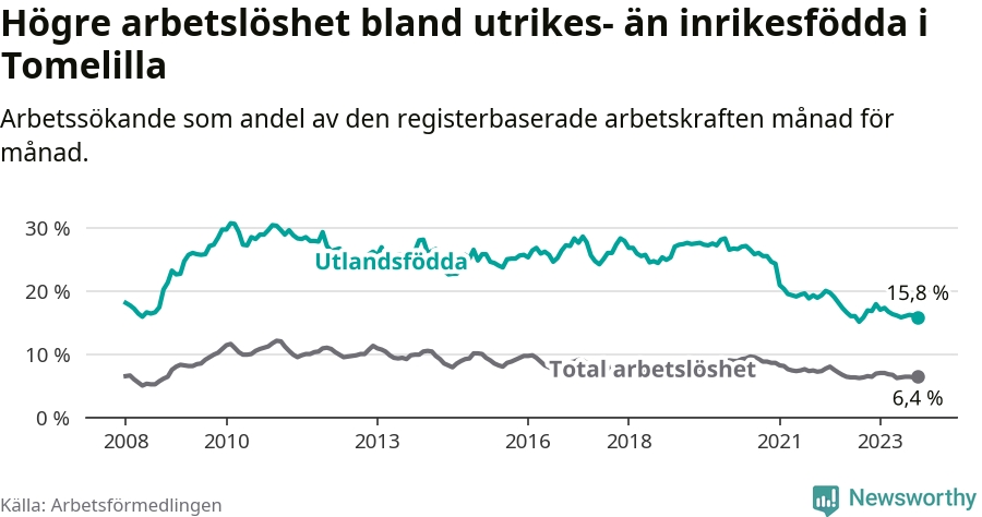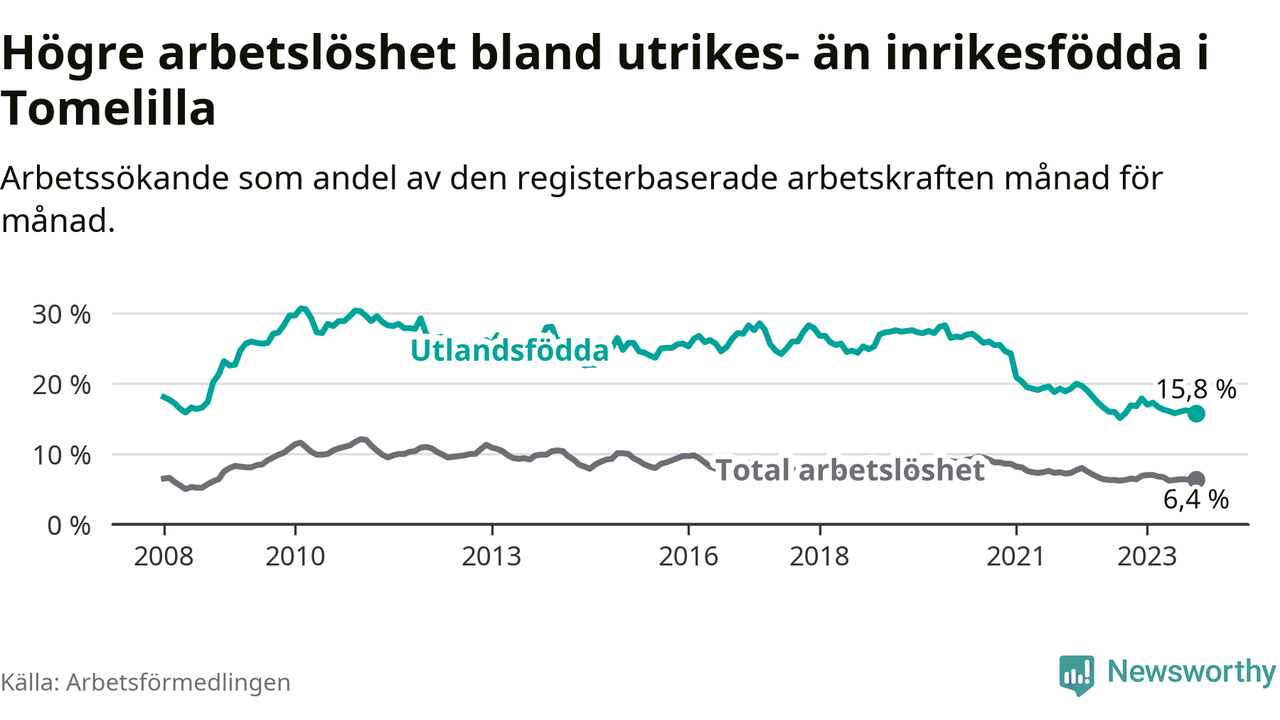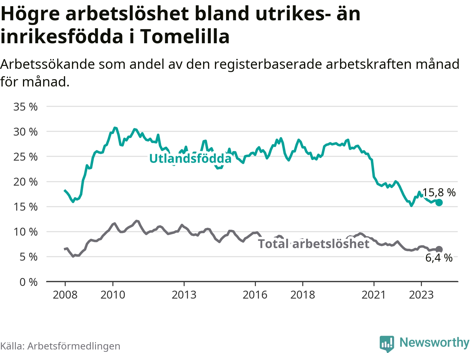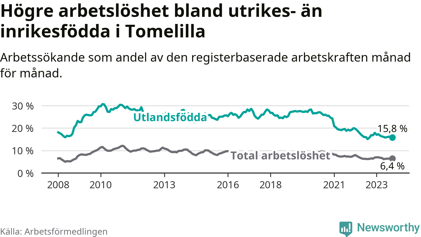 Arbetslösheten bland utlandsfödda var 15,8 procent i Tomelilla under oktober månad, motsvarande 161 av 1 019 personer. Det är 1,1 procentenheter färre än vid samma tidpunkt i fjol (+1 om man räknar personer). Den senaste månadens nedgång innebär ett trendbrott. Under de två föregående månaderna hade arbetslösheten bland utlandsfödda varit högre än motsvarande tidpunkt året innan.