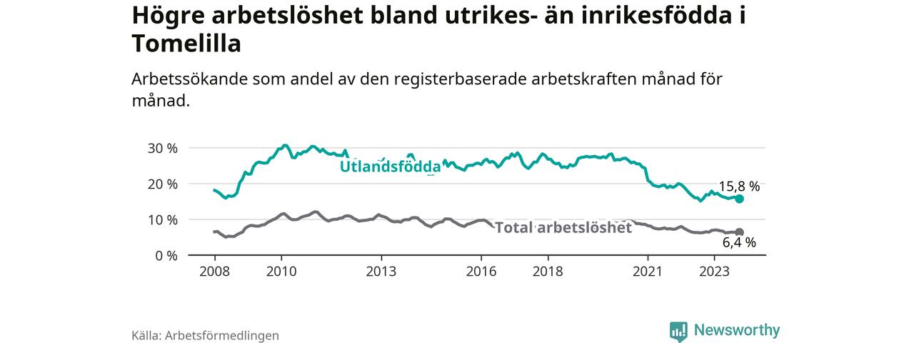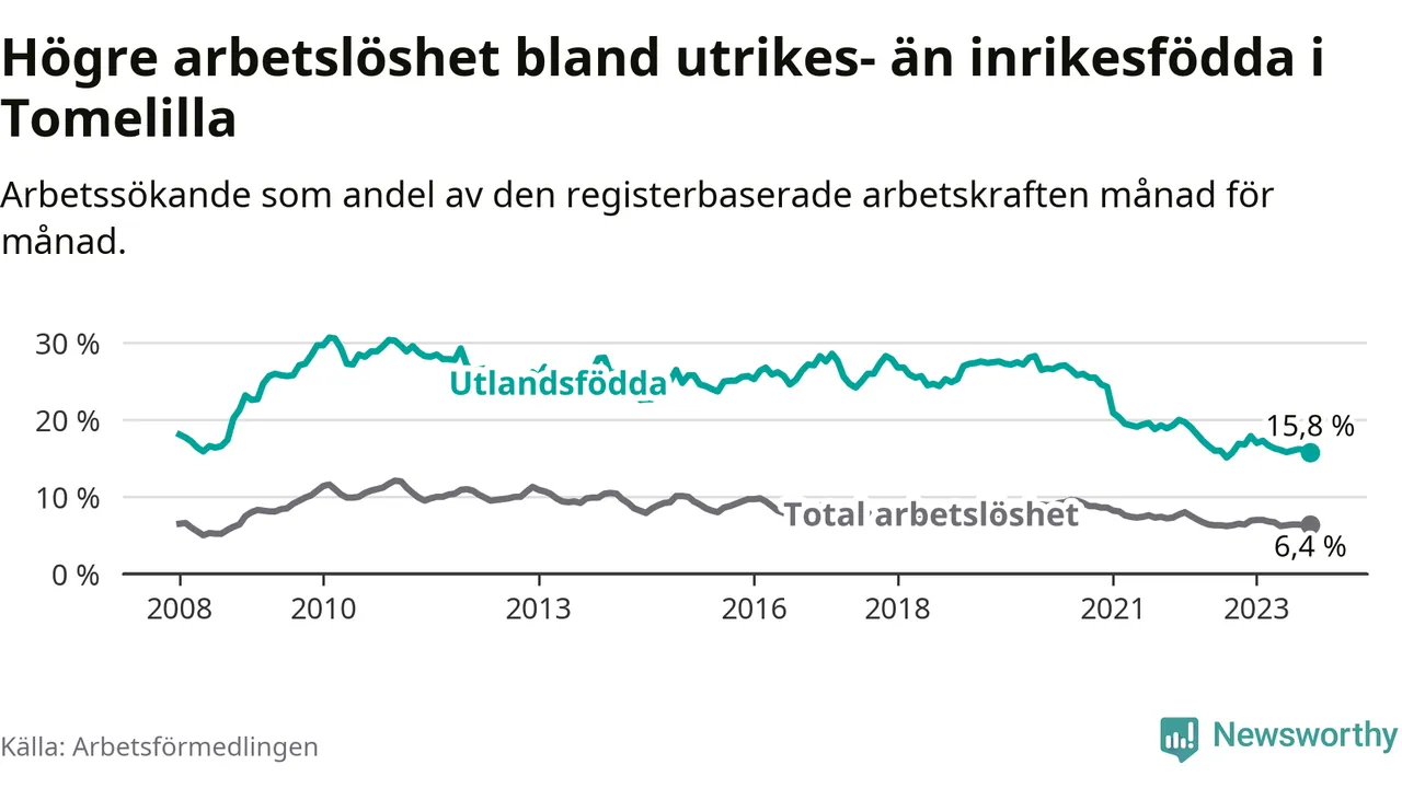 Skillnaden i arbetslöshet mellan utrikesfödda och hela befolkningen är 9,4 procentenheter i Tomelilla. Det är en mindre skillnad än för ett år sedan (−1,0 procentenheter).