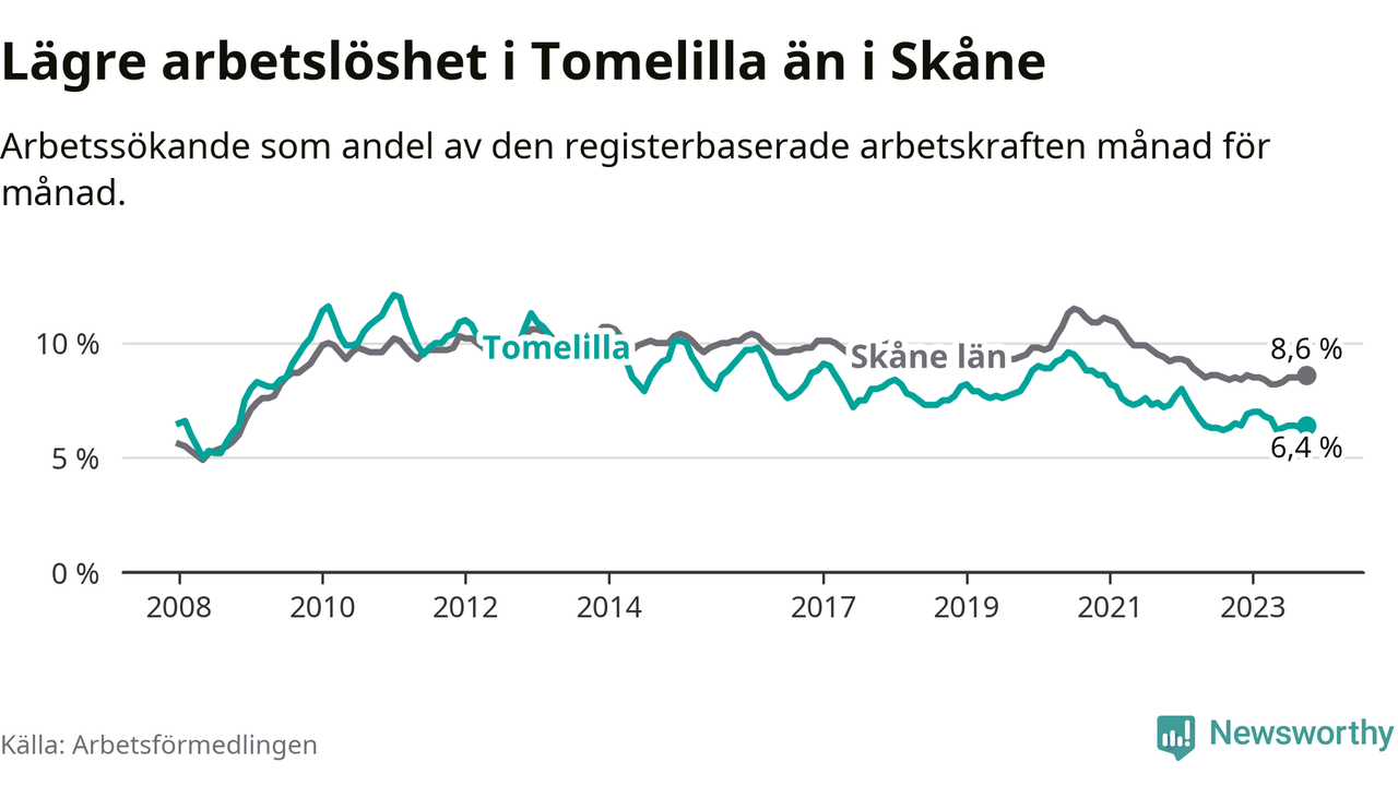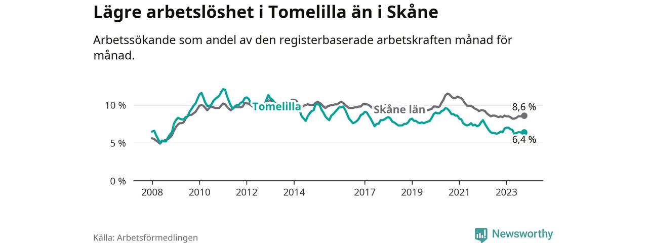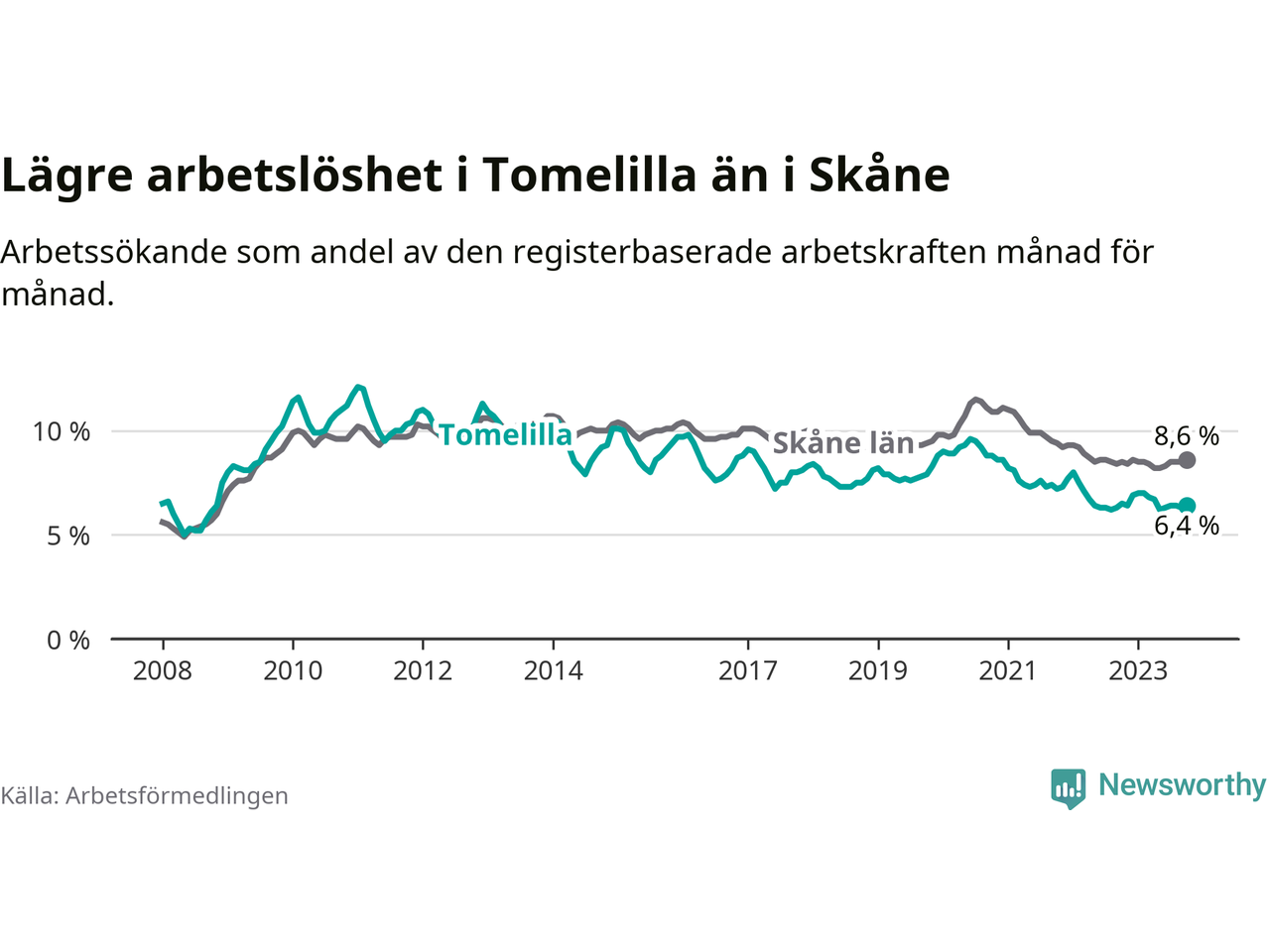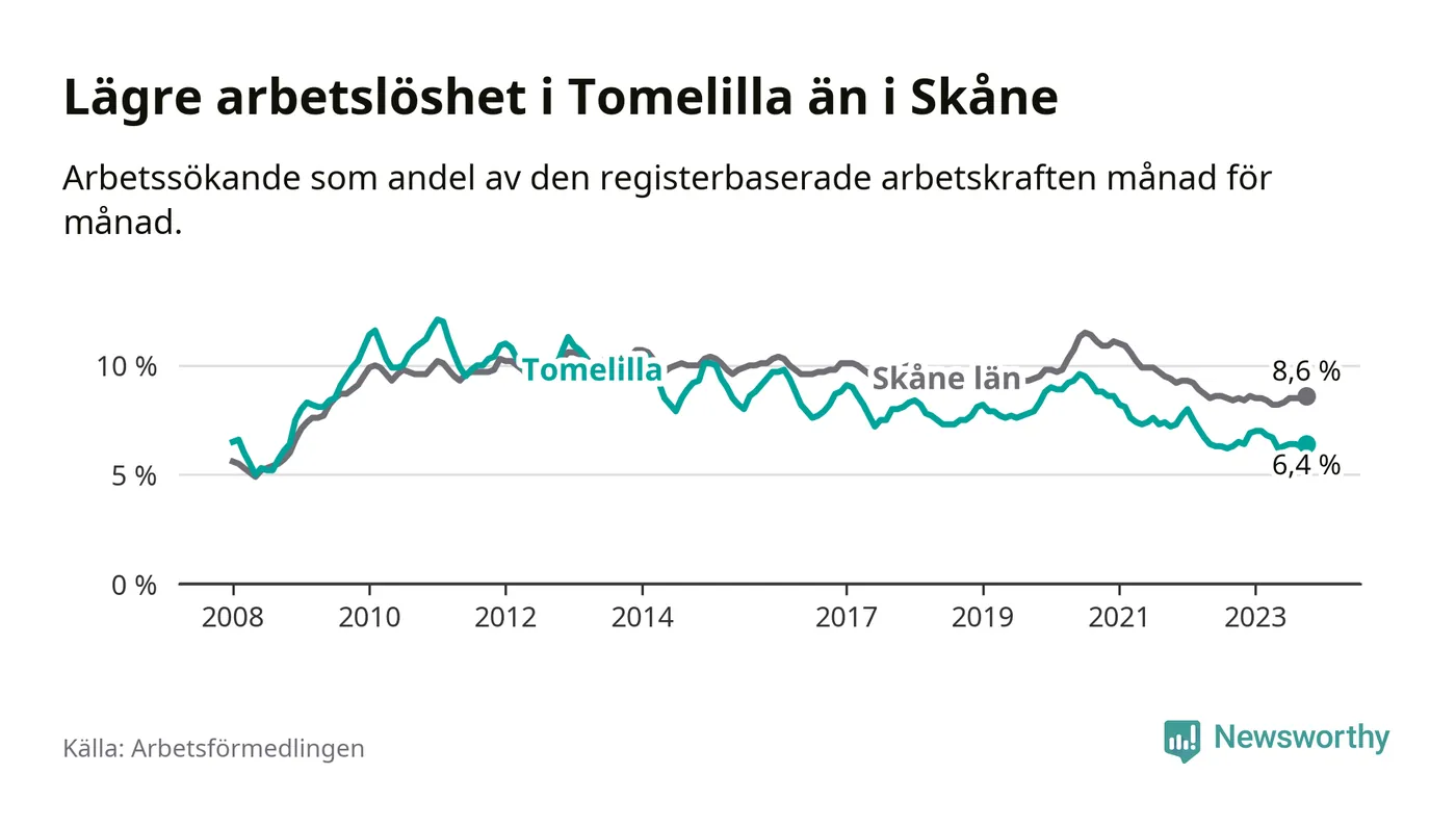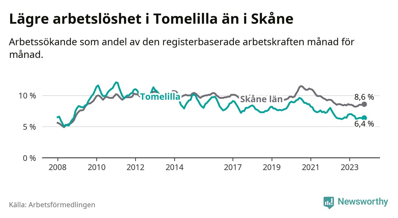 Tomelilla hade redan tidigare lägre arbetslöshet än snittet i hela Skåne län och nu växer klyftan (6,4 procent i kommunen, jämfört med 8,6 procent i hela länet). Vellinge har den lägsta arbetslösheten i länet (3,3 procent), medan Malmö har den högsta (12,3 procent). För att Tomelilla skulle komma ner i samma arbetslöshetsnivå som Vellinge skulle 195 personer behöva sysselsättas.