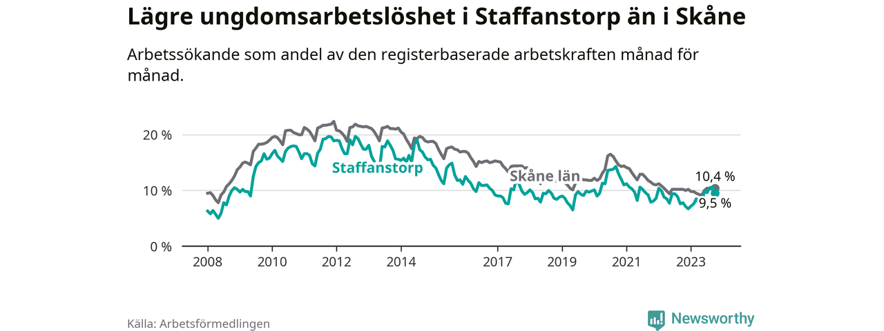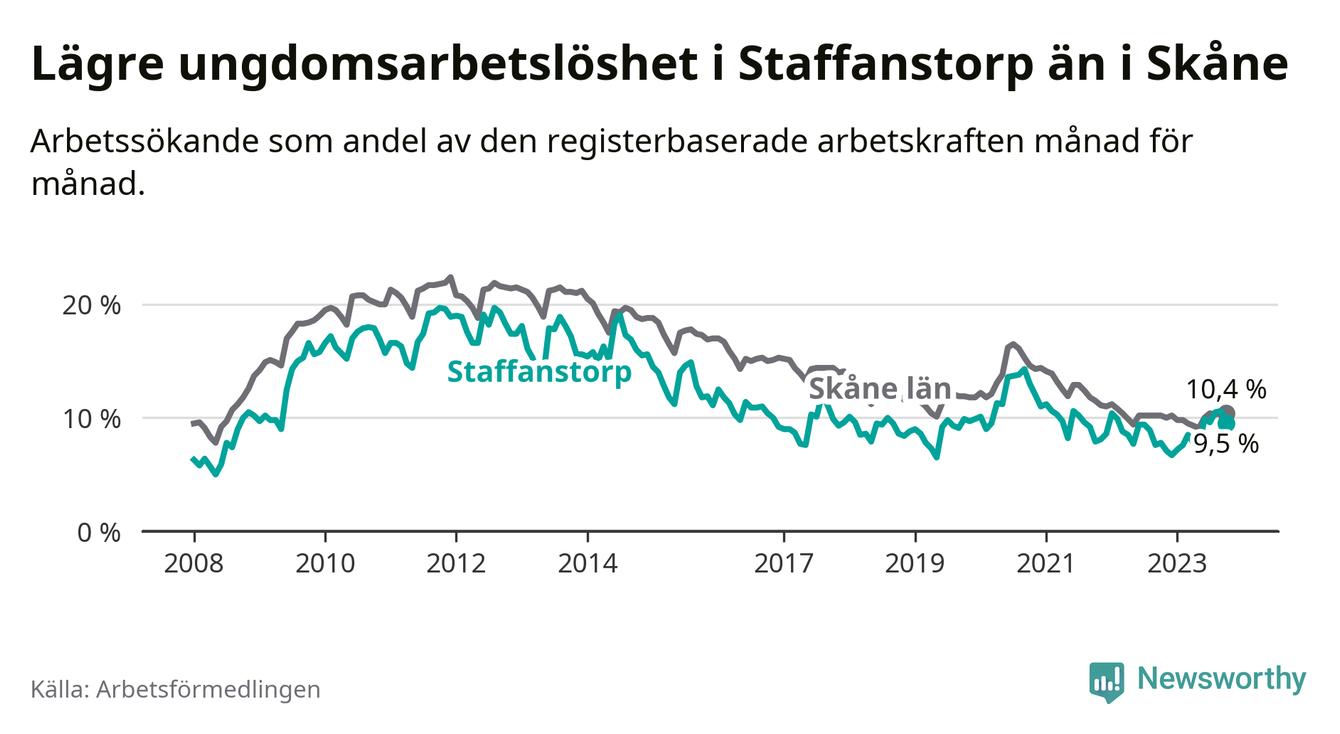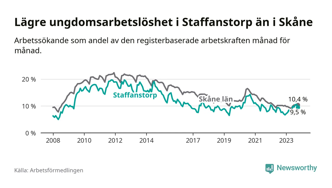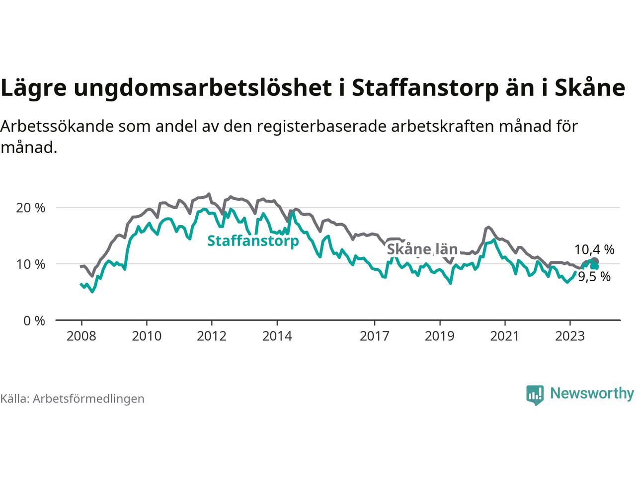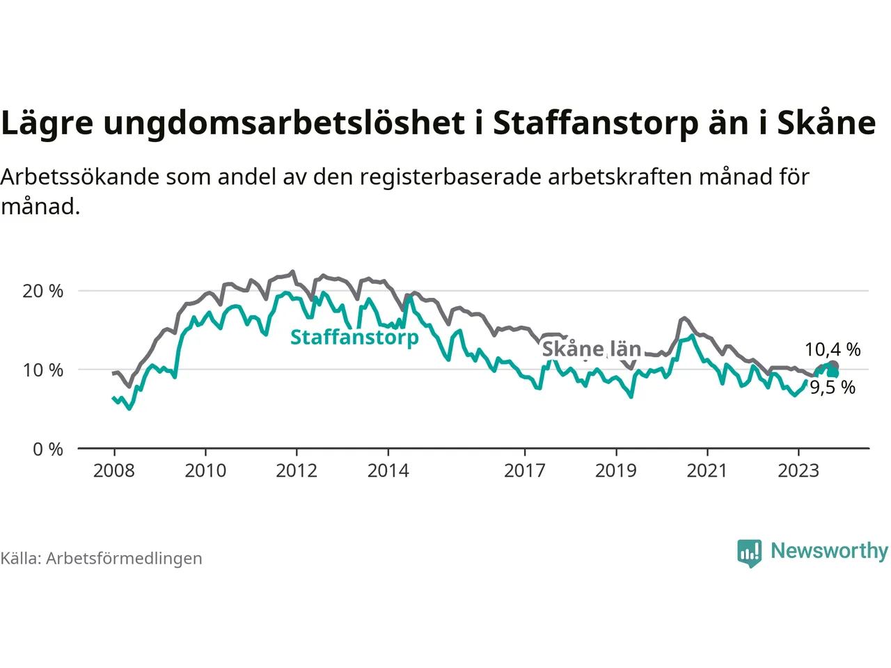 Precis som den totala arbetslösheten ligger ungdomsarbetslösheten i Staffanstorp lägre än i Skåne som helhet. Skillnaden mellan kommunen och länet är 0,9 procentenheter.
