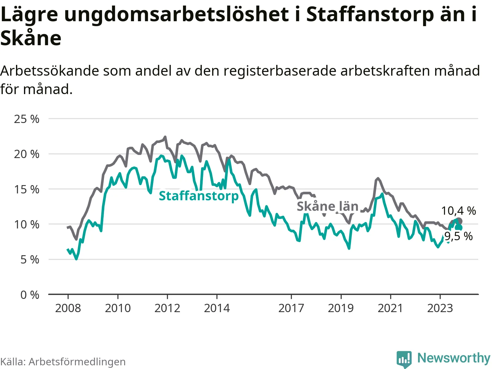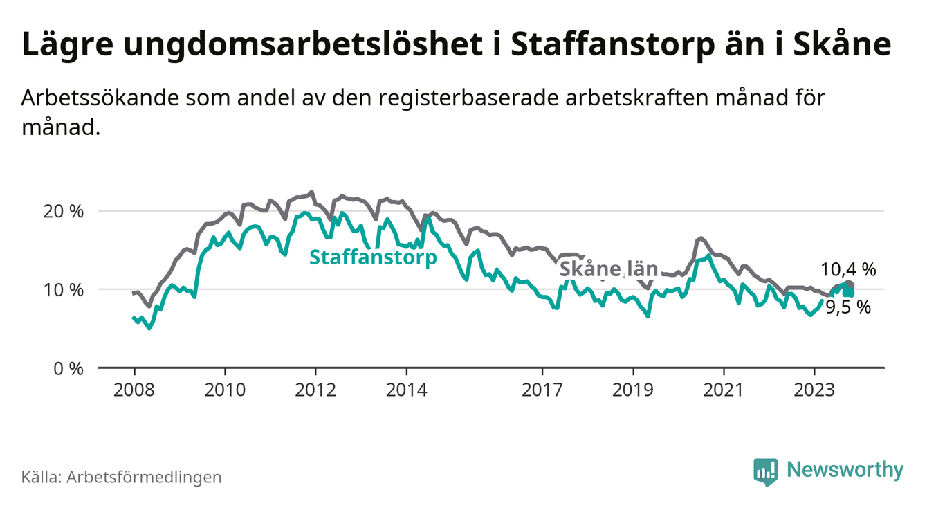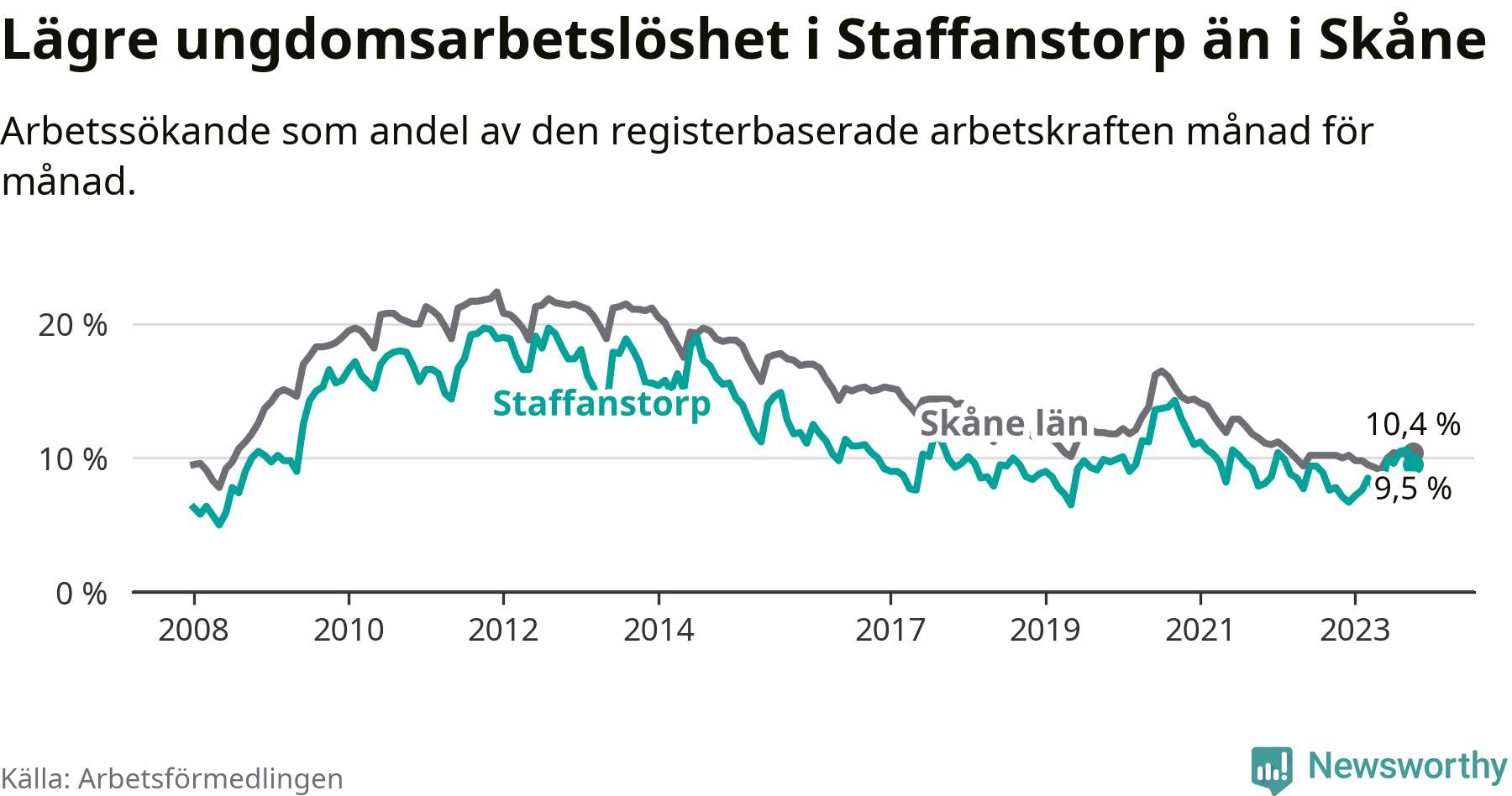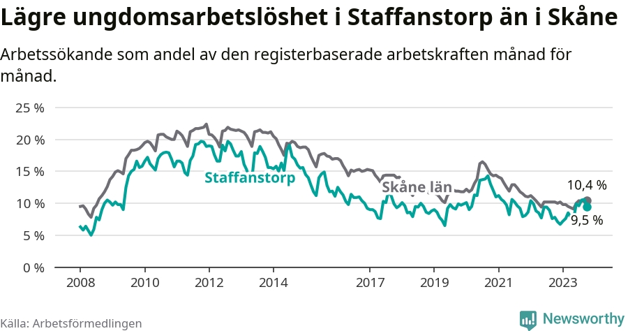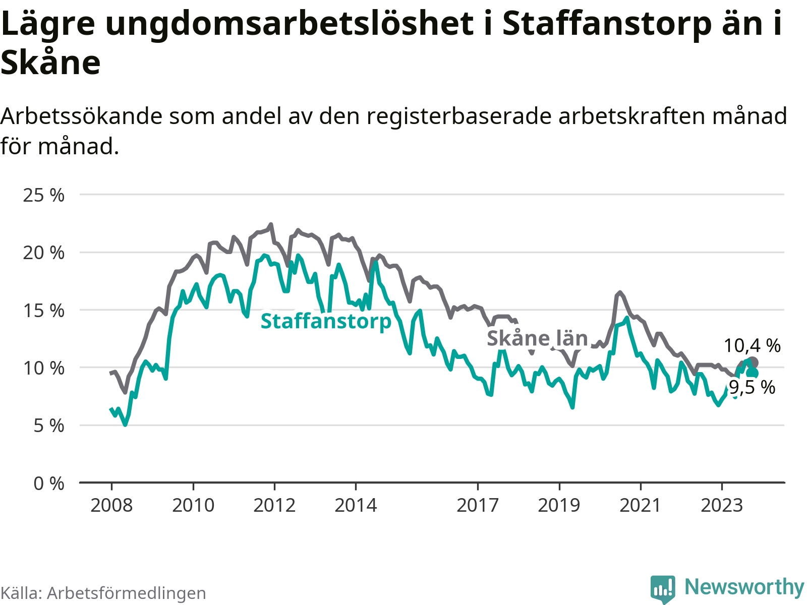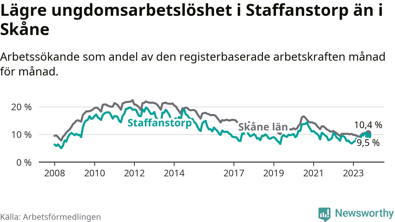 Precis som den totala arbetslösheten ligger ungdomsarbetslösheten i Staffanstorp lägre än i Skåne som helhet. Skillnaden mellan kommunen och länet är 0,9 procentenheter.