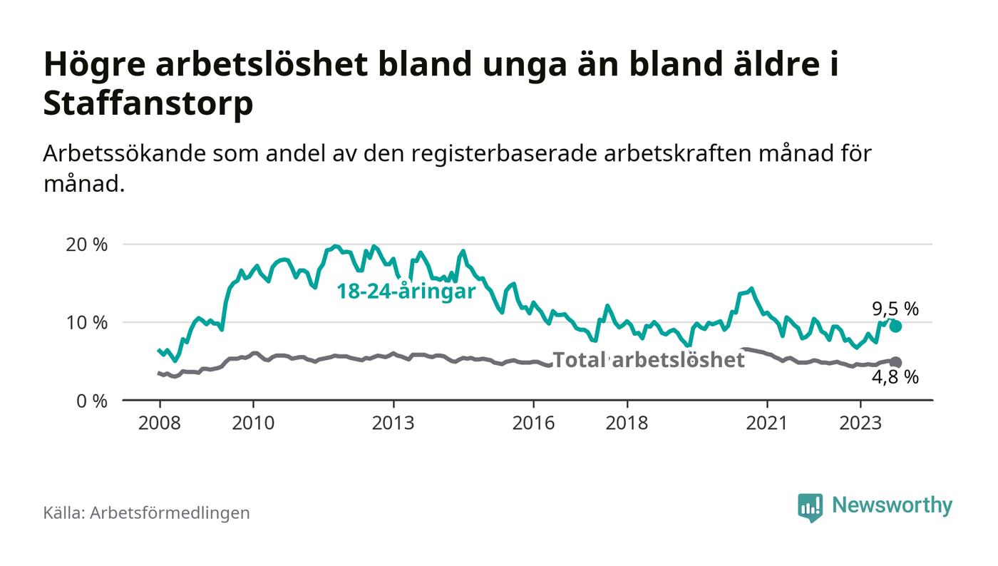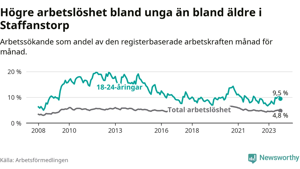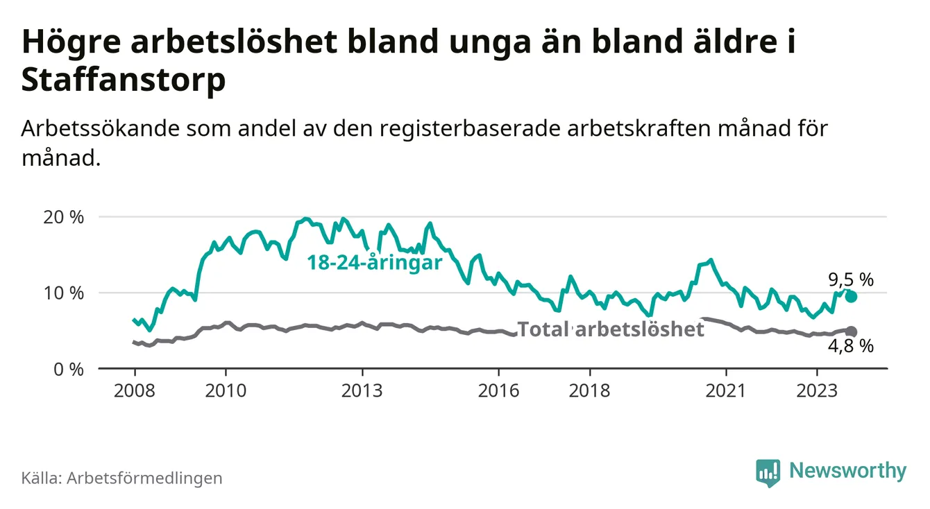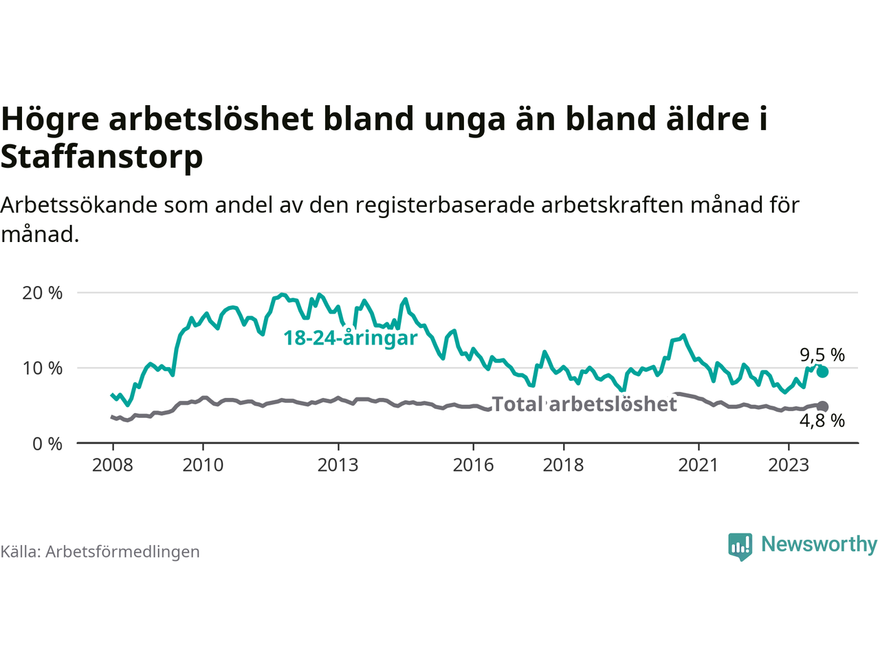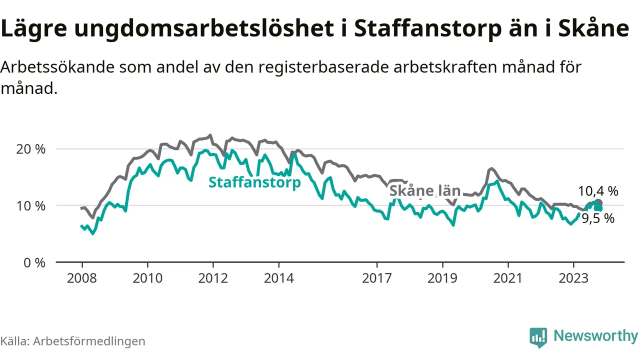 Precis som den totala arbetslösheten ligger ungdomsarbetslösheten i Staffanstorp lägre än i Skåne som helhet. Skillnaden mellan kommunen och länet är 0,9 procentenheter.