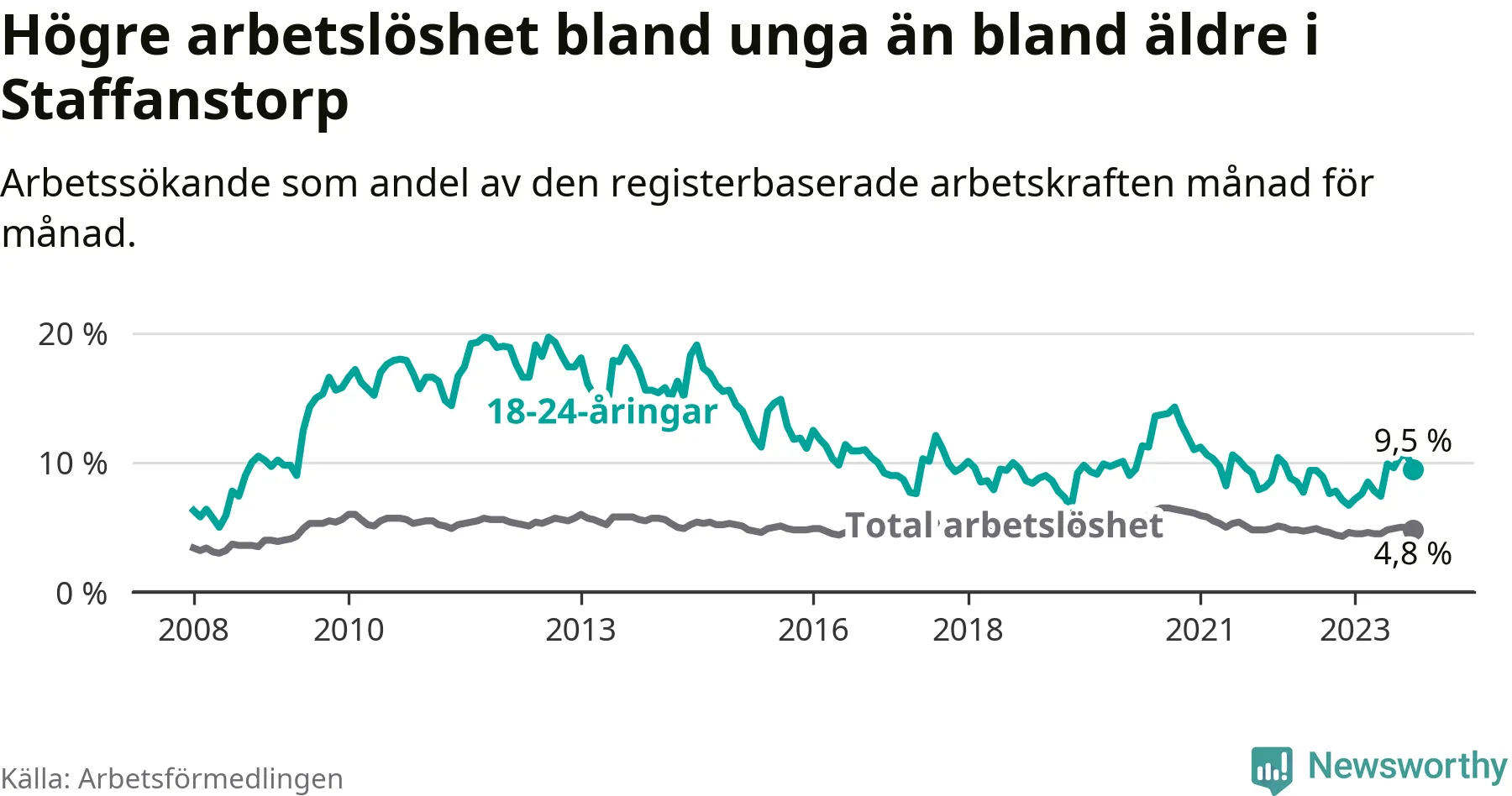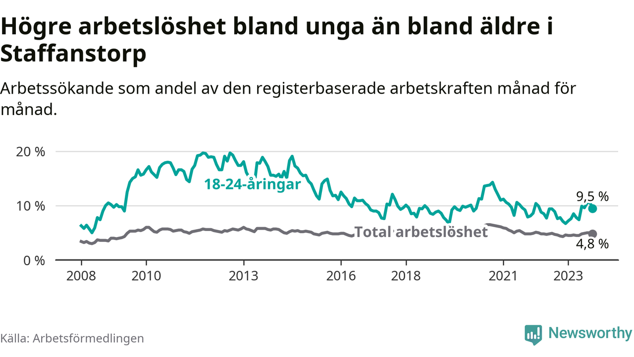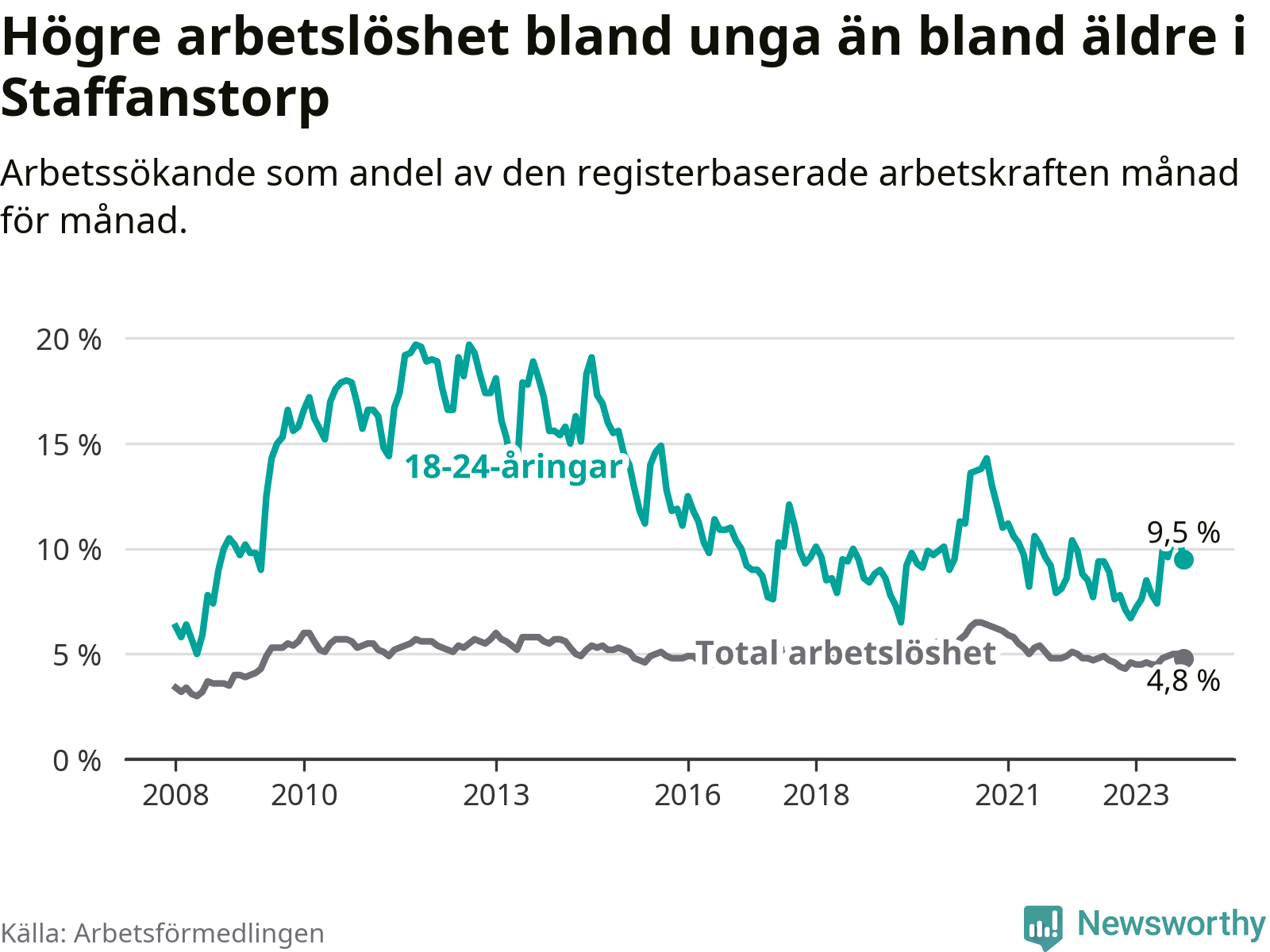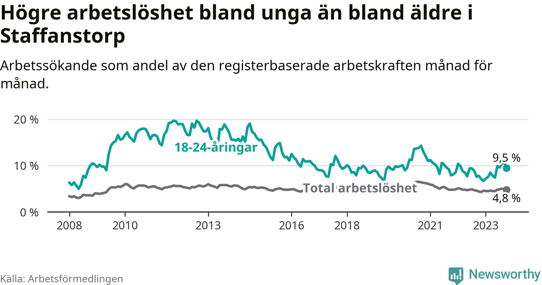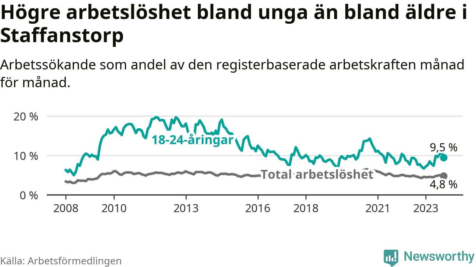 Precis som den totala arbetslösheten ligger ungdomsarbetslösheten i Staffanstorp lägre än i Skåne som helhet. Skillnaden mellan kommunen och länet är 0,9 procentenheter.